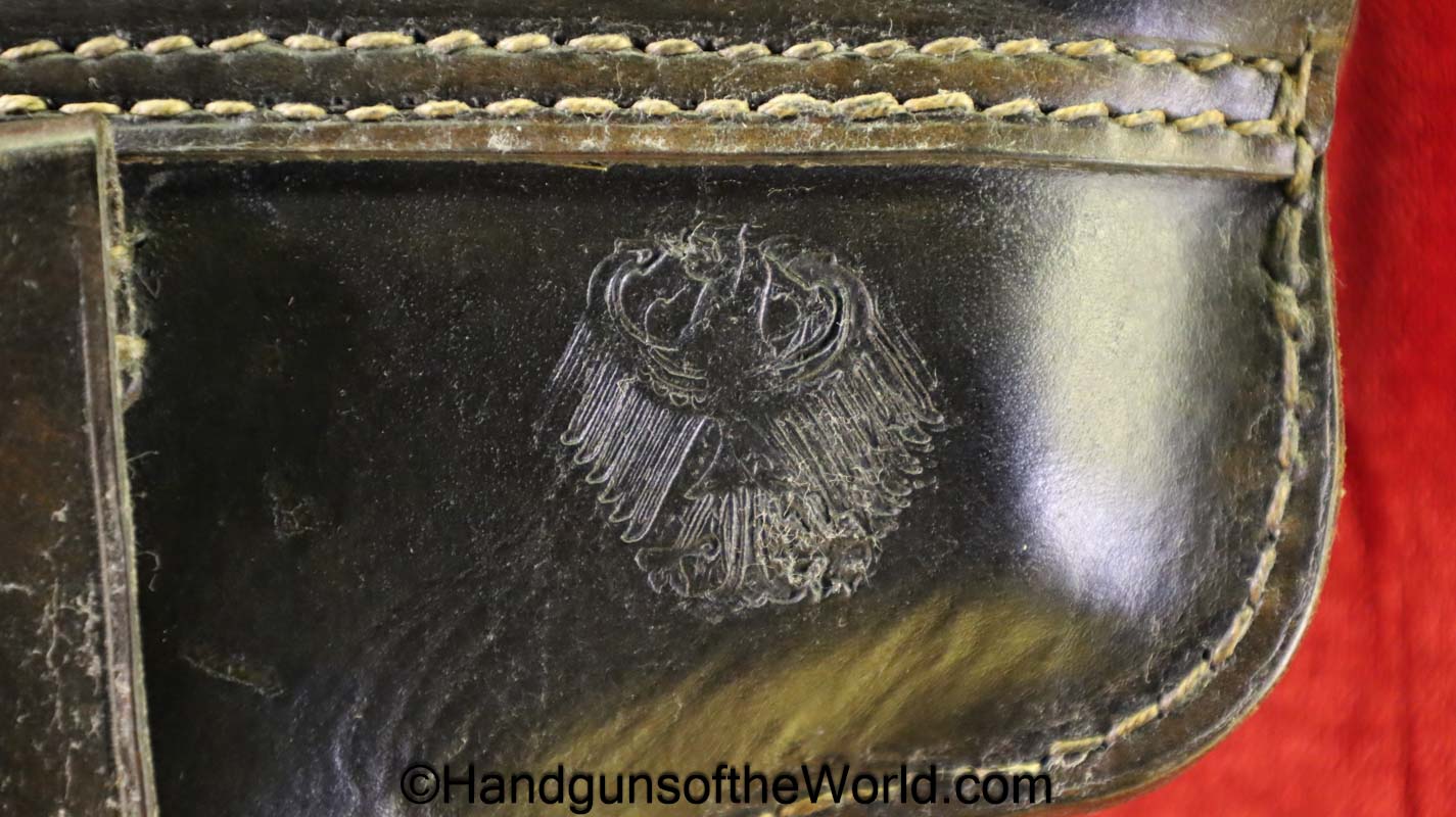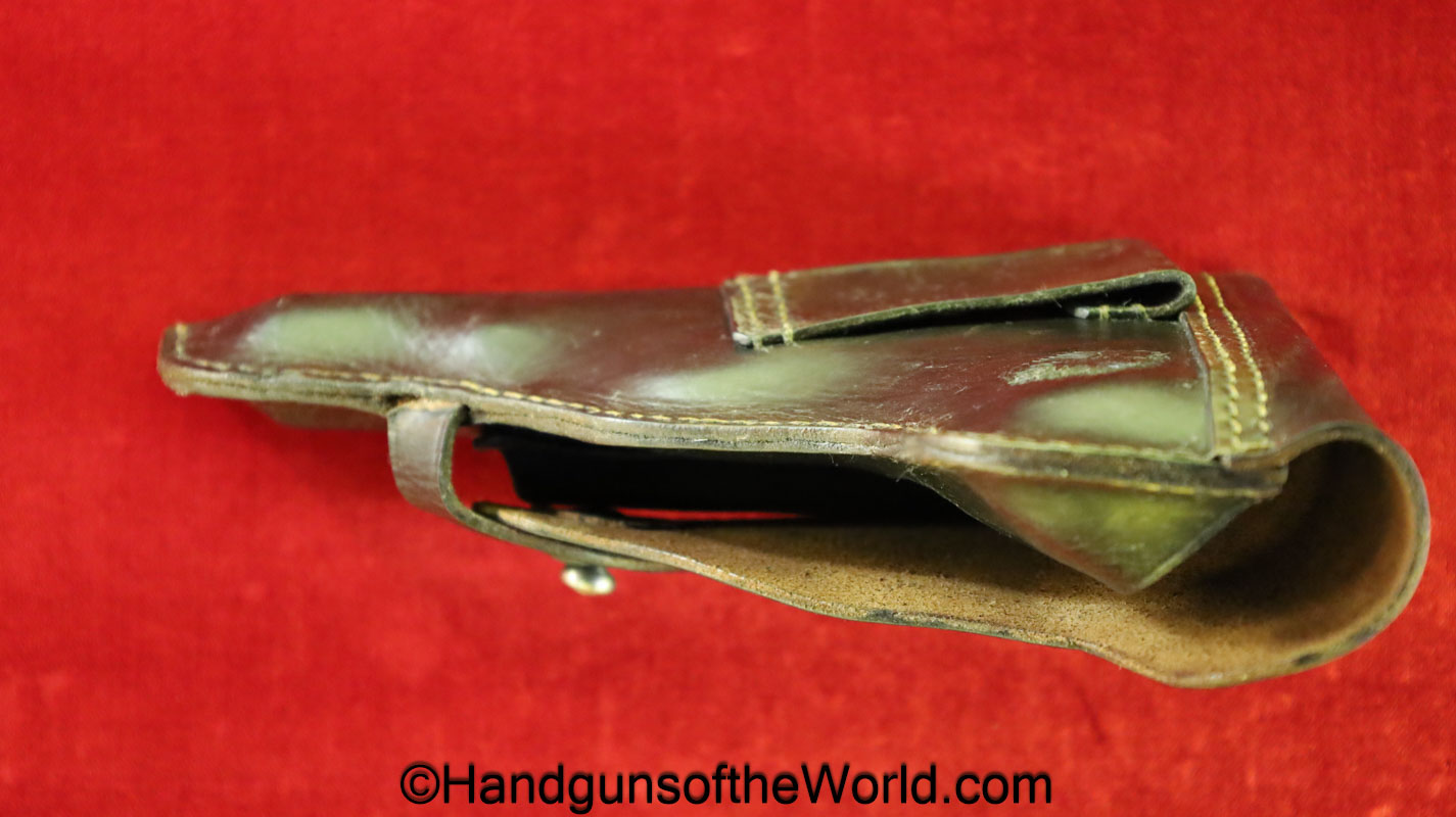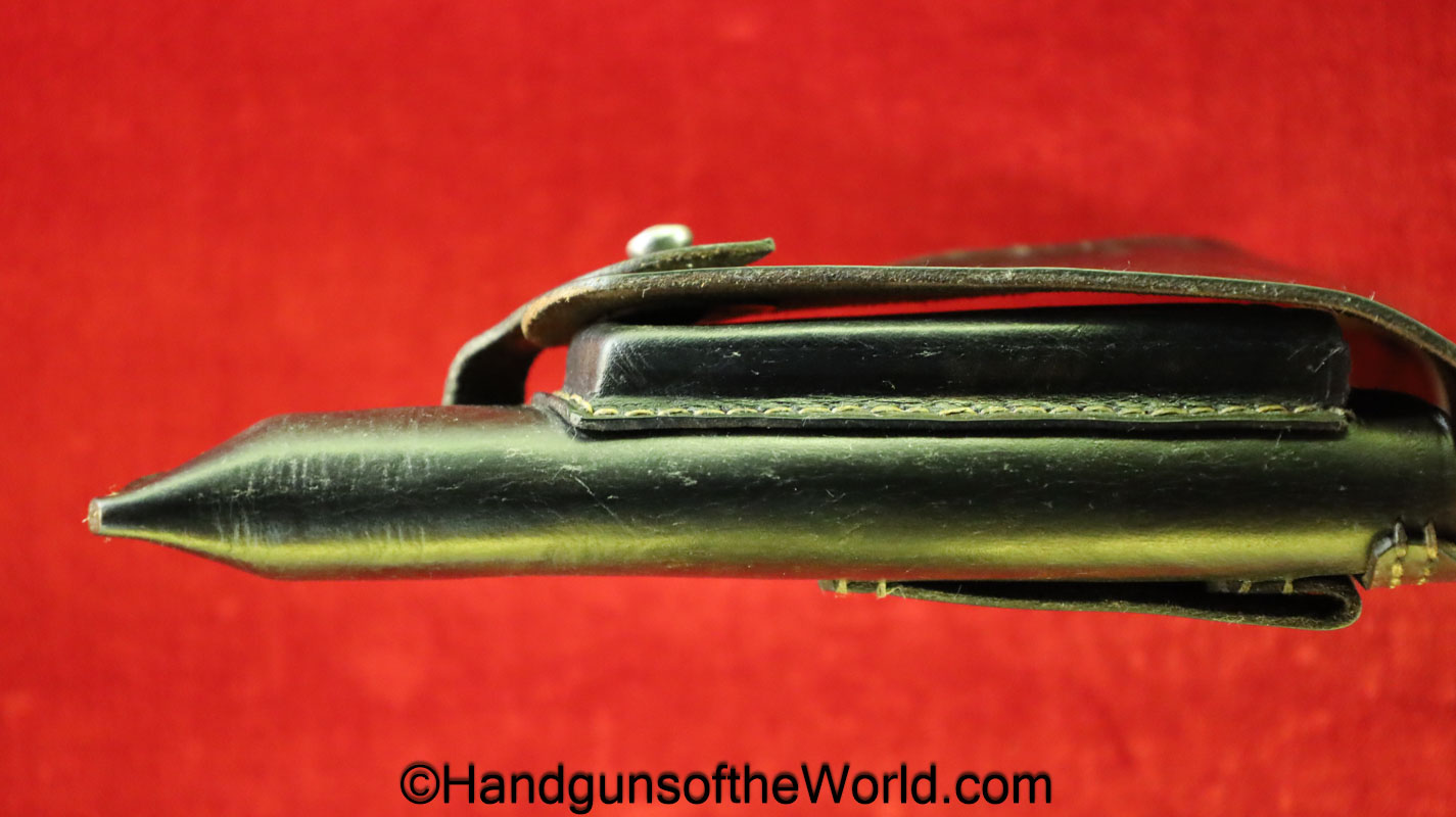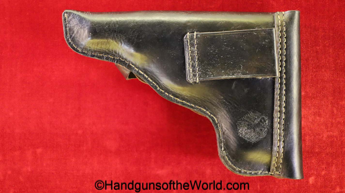 Rheinmetall Pocket, 7.65mm. This has the correct smooth walnut grips, and all matching numbers. This has about 90% thinning blue and the bore is excellent. This full rig includes a custom-made black leather holster and a spare original magazine.