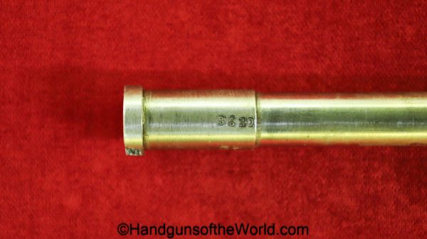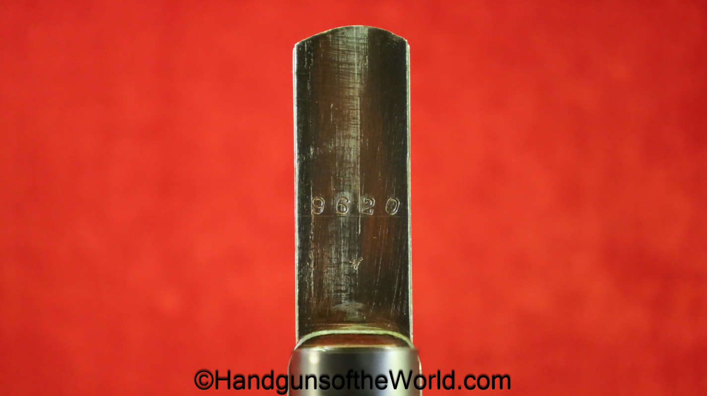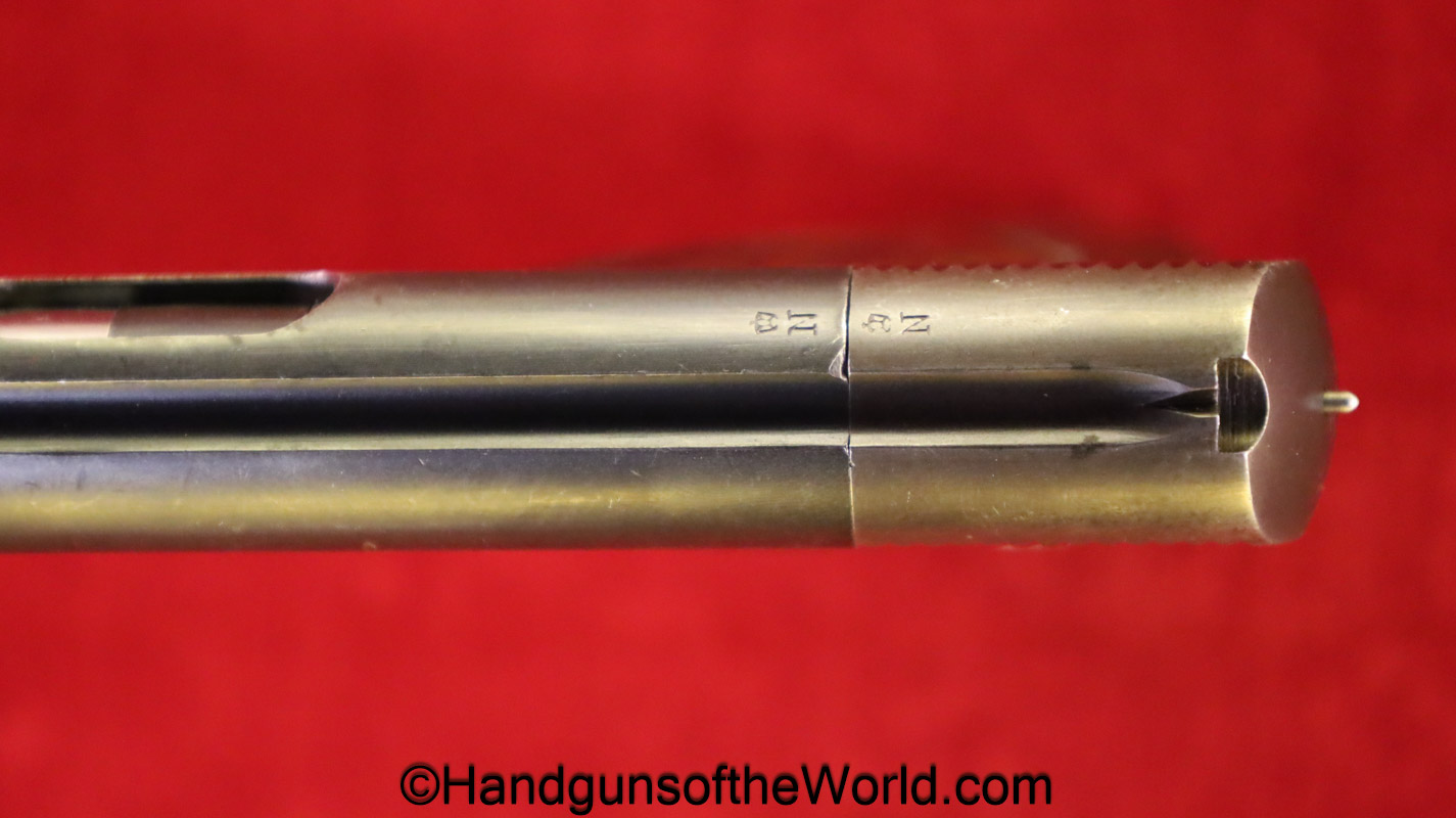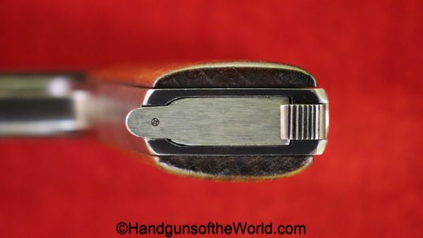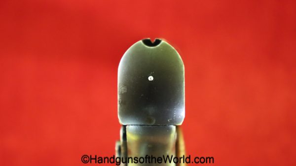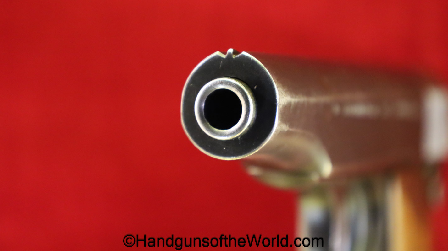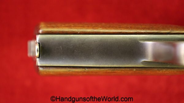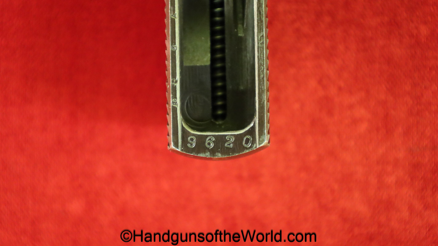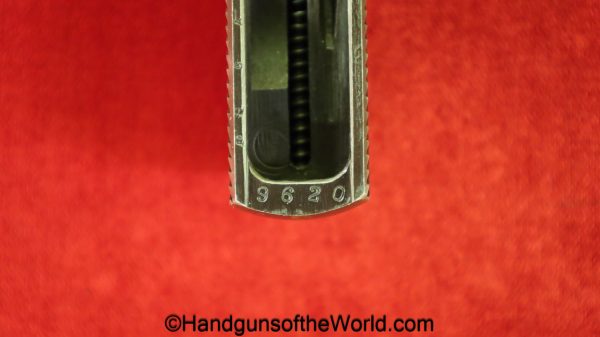 Rheinmetall Pocket, 7.65mm. This is German Crown N proofed on the frame, slide and barrel. This has the early smooth walnut grips, and the proper magazine with the Rheinmetall logo on the base. The blue rates about 95% and the bore is excellent.