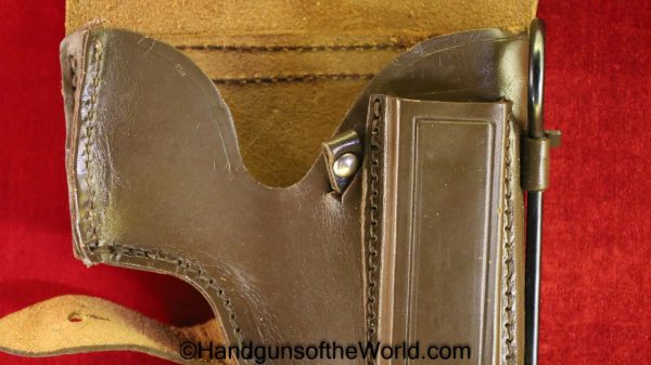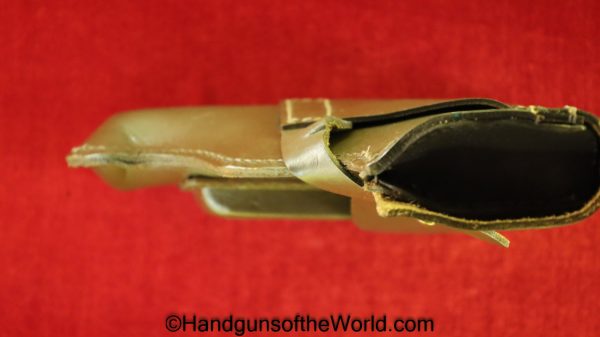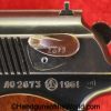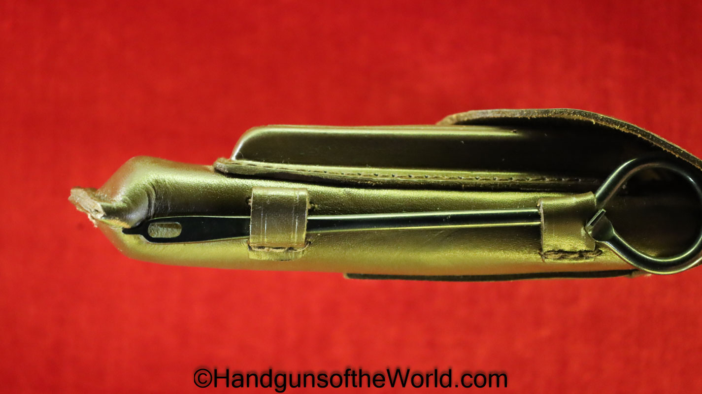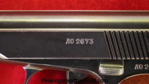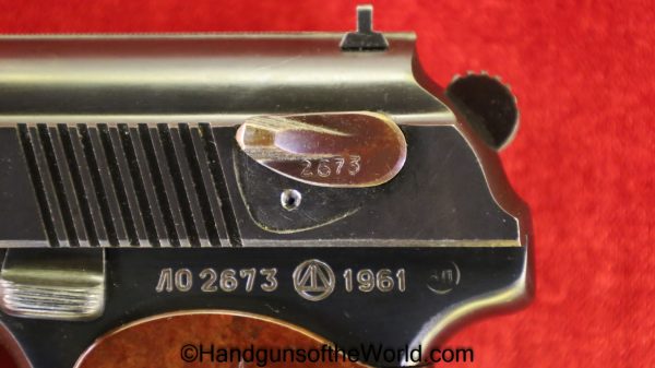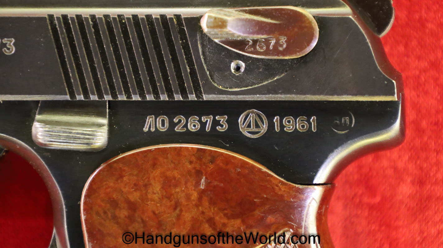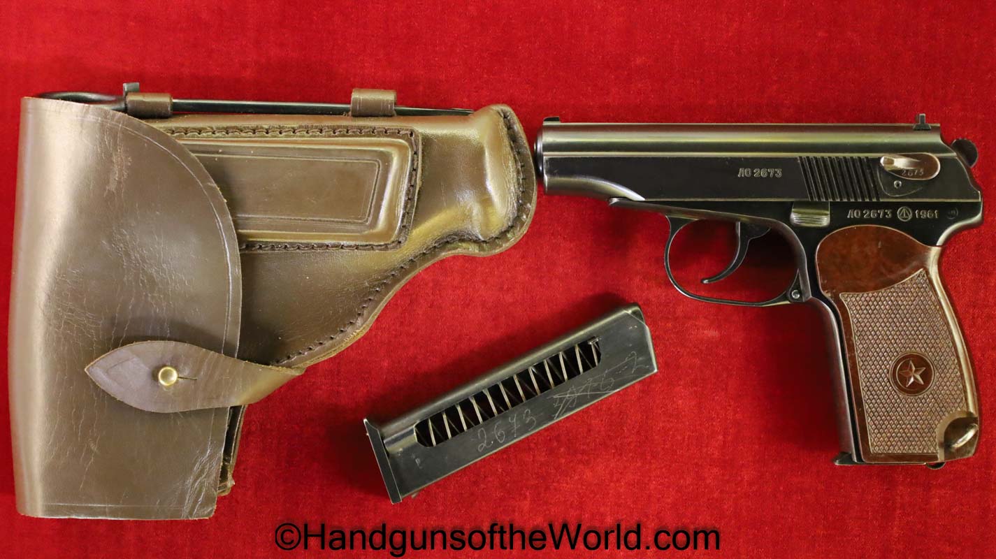 Russian Makarov, 9mm Mak. This is Russian military proofed and dated 1961. This has the proper, single star red Bakelite grips. This is import marked on the right side of the frame. This has 2 etched, numbered magazines. the blue rates about 99% and the bore is excellent. This full rig includes the proper brown leather holster and cleaning rod.