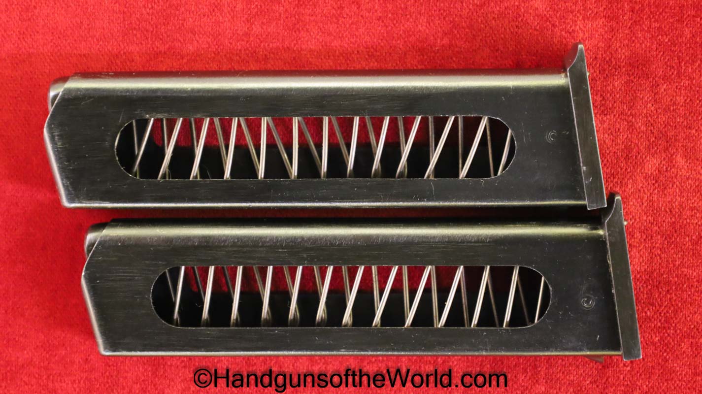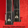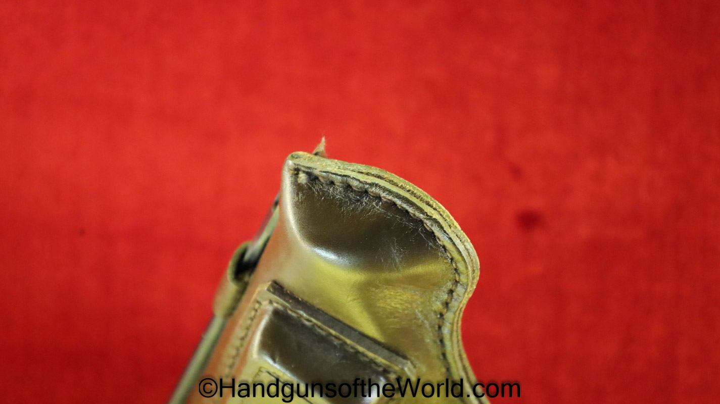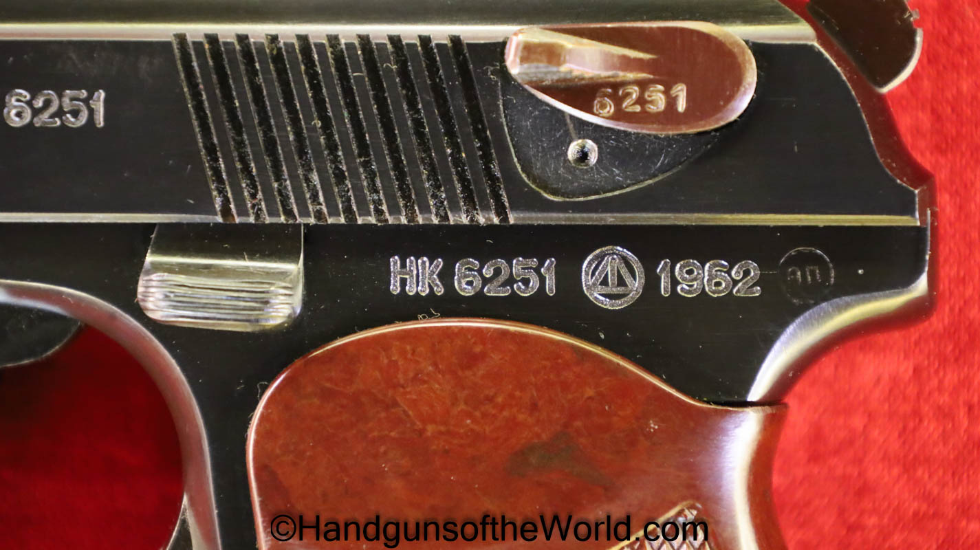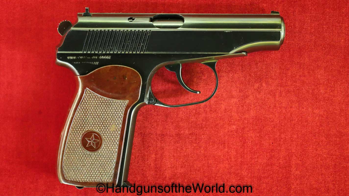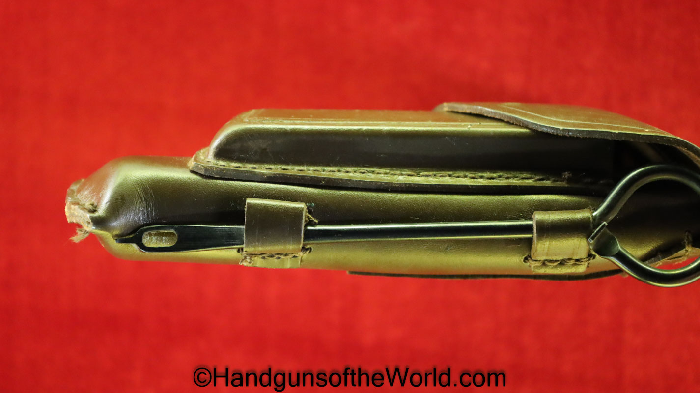Russian Makarov, 9mm Mak caliber. This is Russian Military proofed and dated 1967 on the left side of the frame. This has correct, single star red Bakelite grips. This is import marked on the right side of the frame. This has 2 matching-stamped magazines. The blue rates at 99% and the bore is excellent. This full rig includes the proper brown leather holster and a cleaning rod.