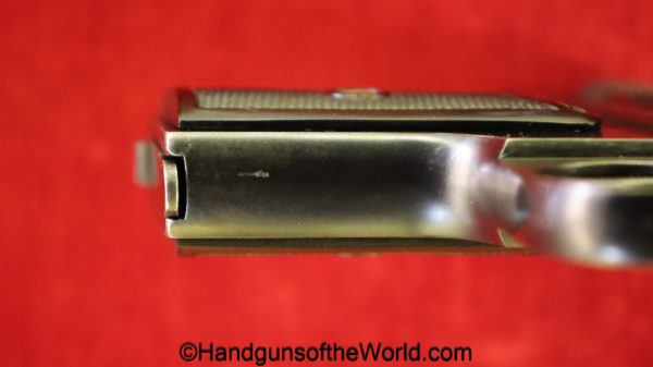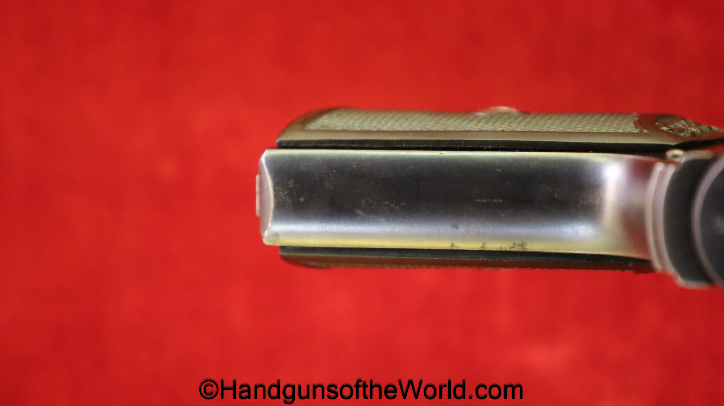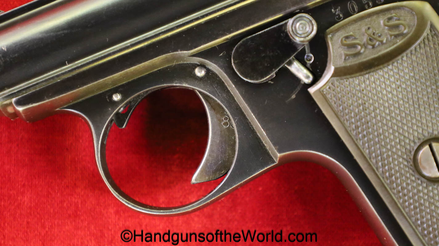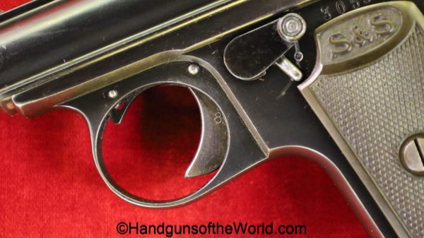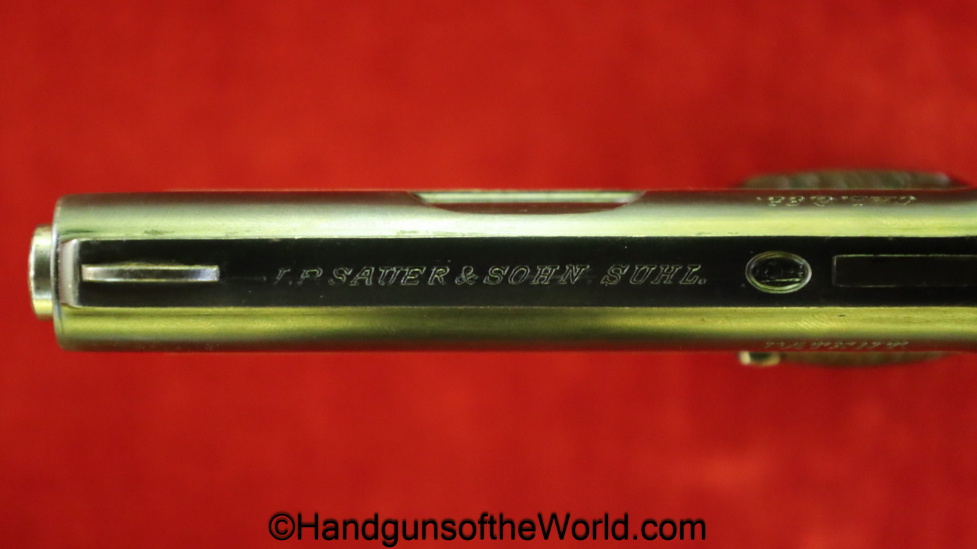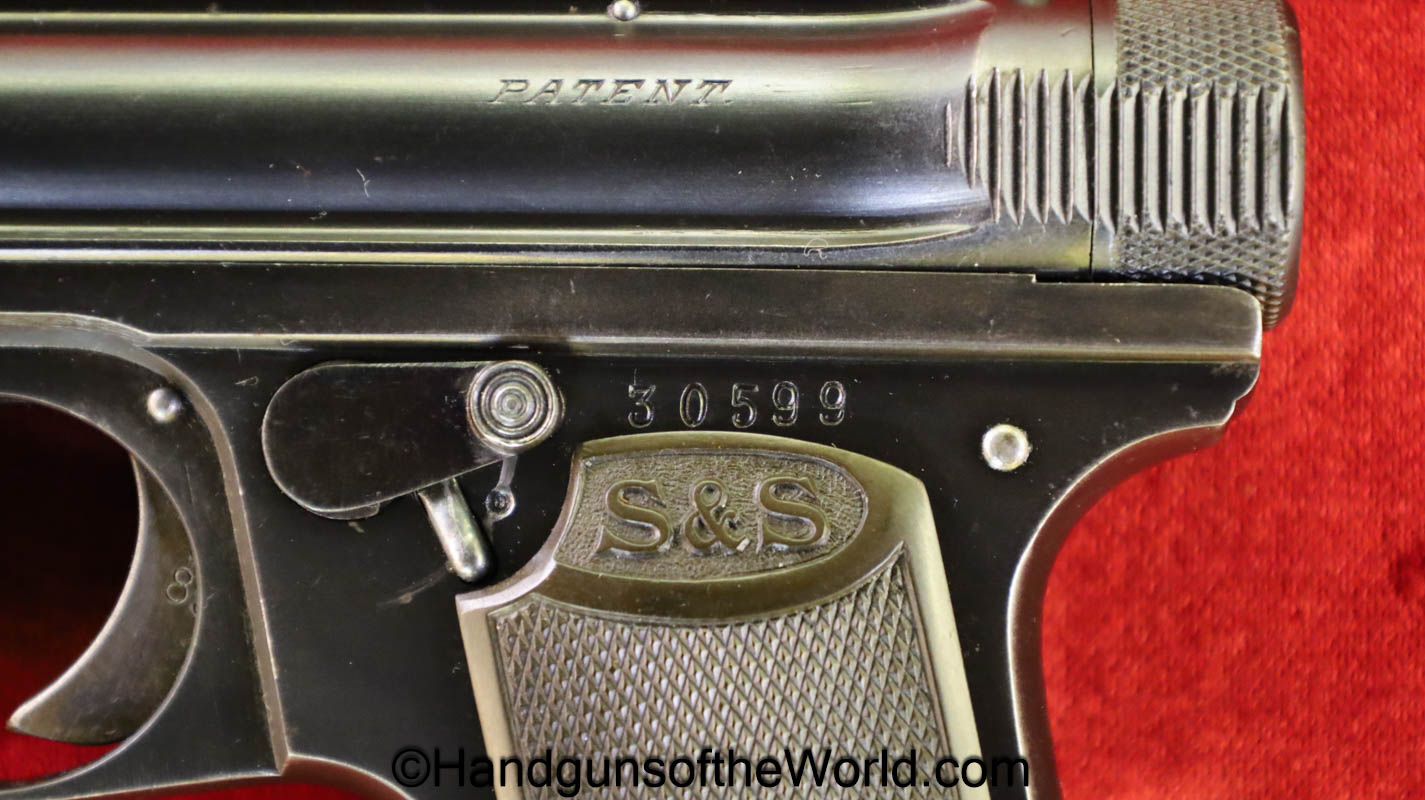 Sauer 1913, 6.35mm. This has the Hard Rubber grips with S&S Logo. This is an early variation, and is not marked Germany. The blue rates about 97% and the bore is excellent.