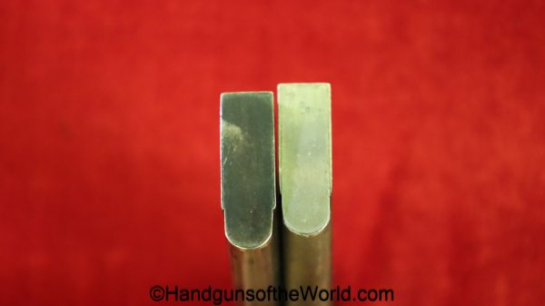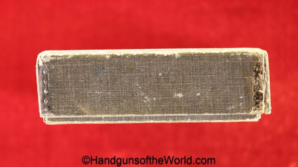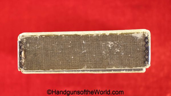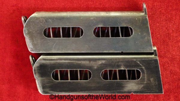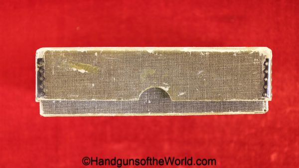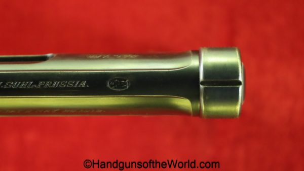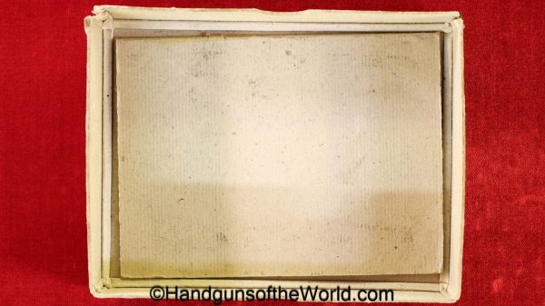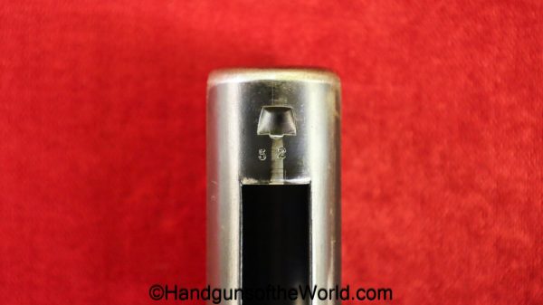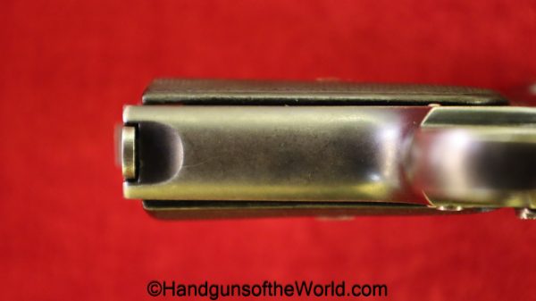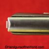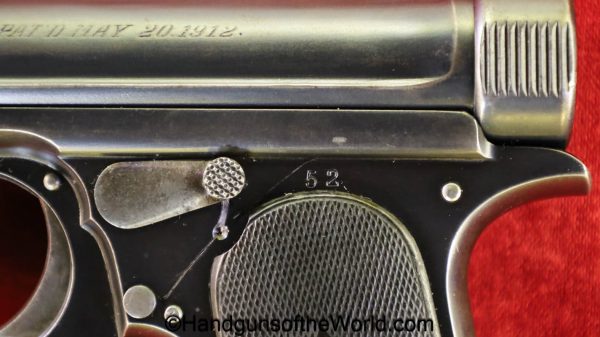 Sauer 1913, 7.65mm. This is an English Export Model with the slide marked “Sauers Patent-Patd May 20 1912” on the left side and “J.P.Sauer & Son Suhl-Prussia” on the opposite side of the slide, and the Sauer logo on top of the slide. This is German Crown N proofed and has the correct, plain checkered hard rubber grips. The blue rates about 95% and the bore is excellent. This has been mated to an original beige cardboard box with a spare magazine, manual and cleaning rod. This 2-digit pistol is the lowest known export Model, with only a couple of lower numbered pistols known. This is also the exact gun pictured on the Unblinking Eye Gun Encyclopedia site. That makes this one of the earliest Sauer Semi-Auto pistols extant.