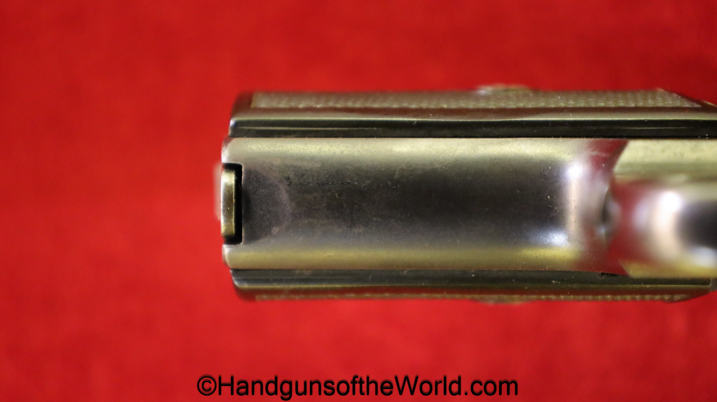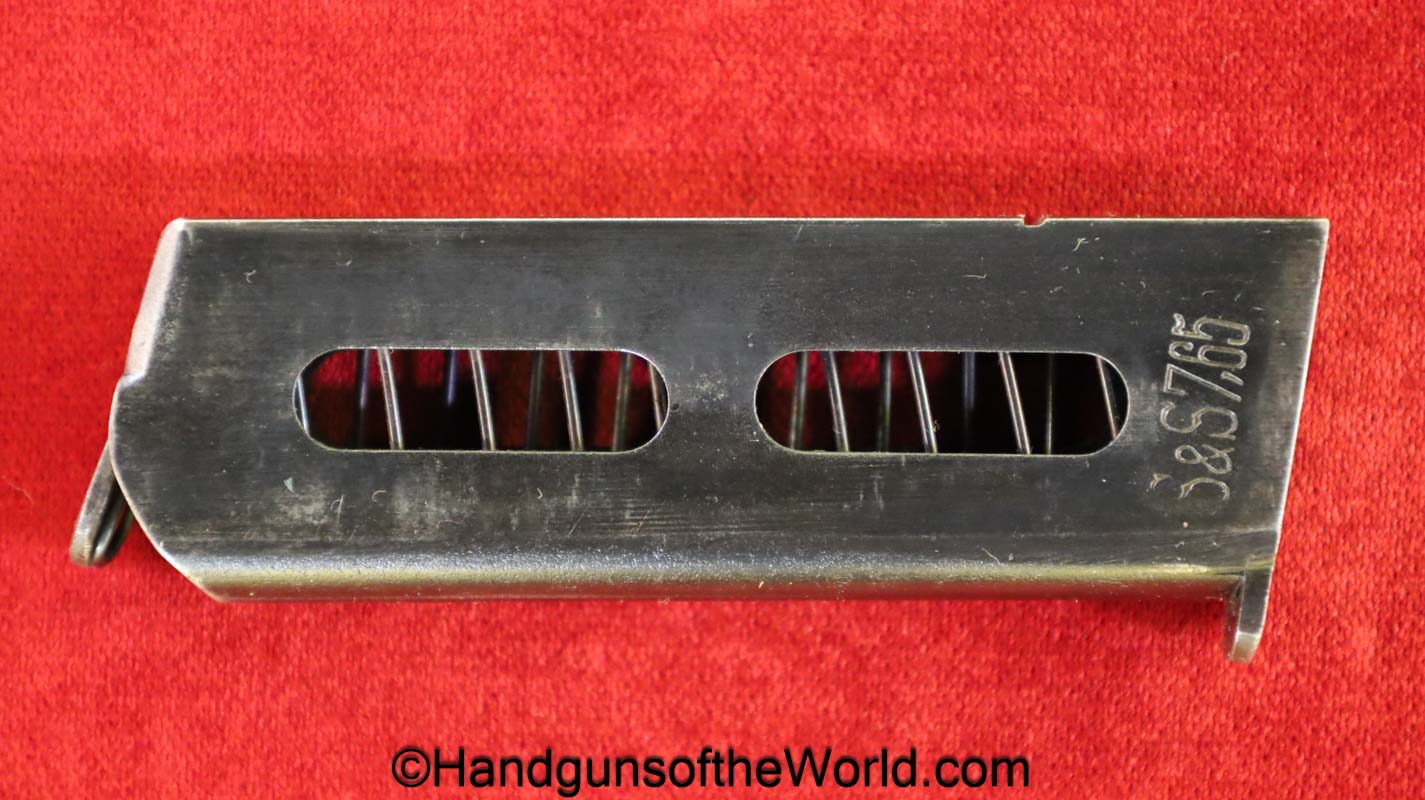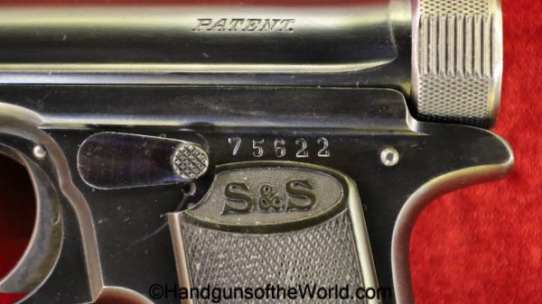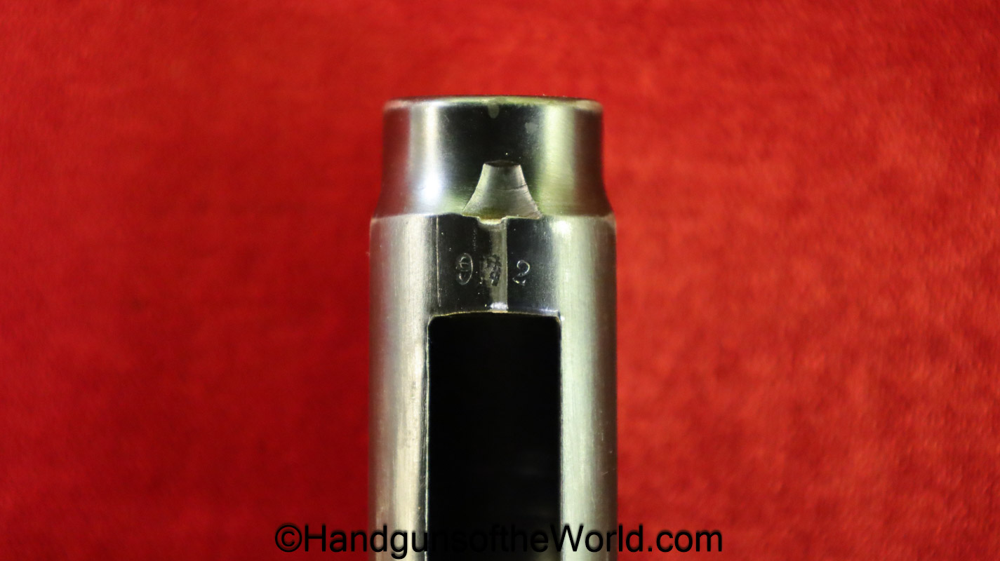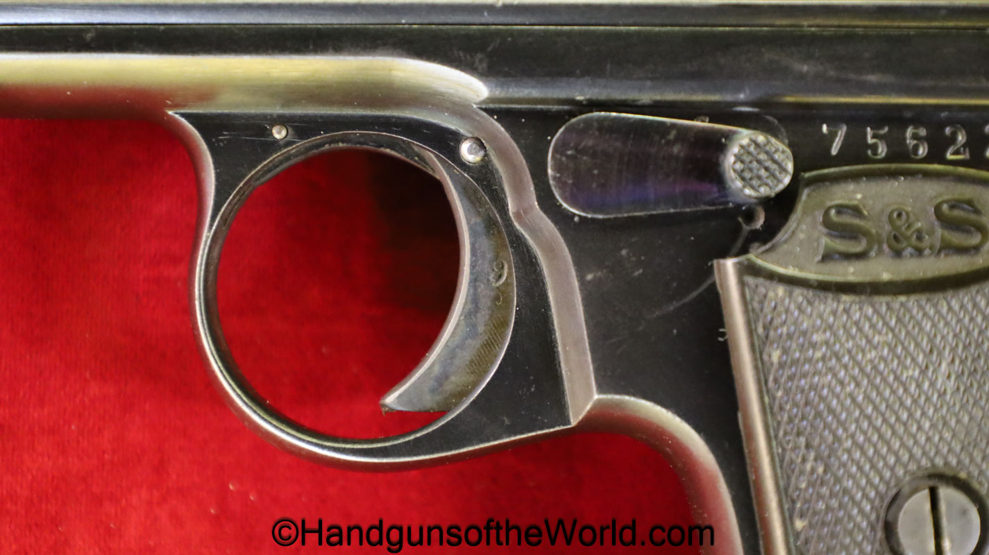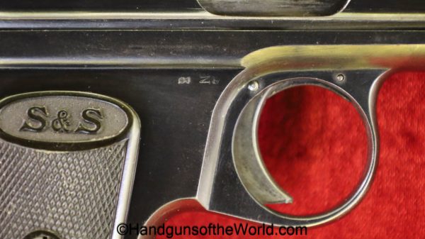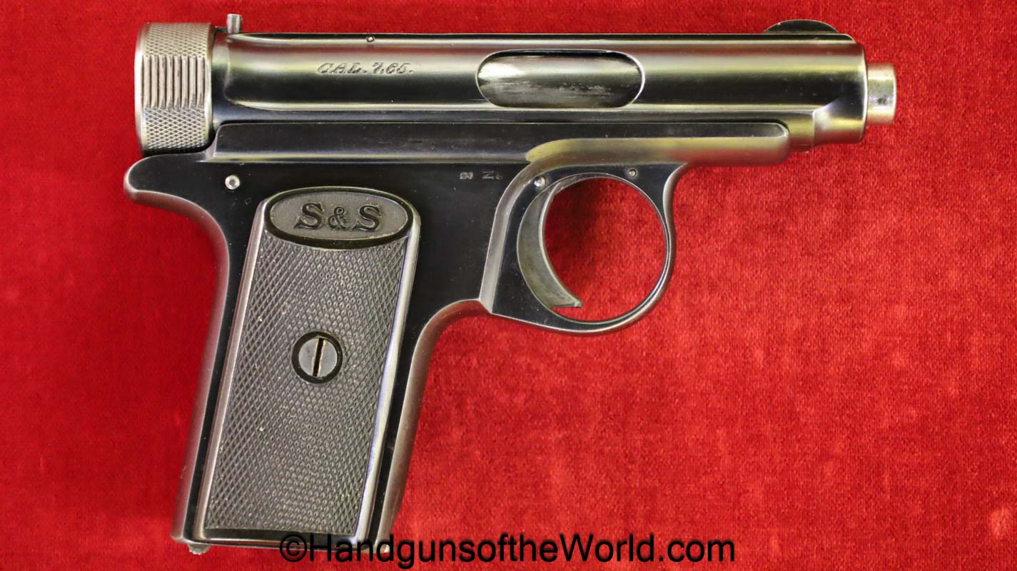 Sauer 1913, 7.65mm. This is German WWI Imperial proofed on the left side of the frame. This has the correct S&S logo black Bakelite grips. The blue rates about 98% and the bore is Mint.