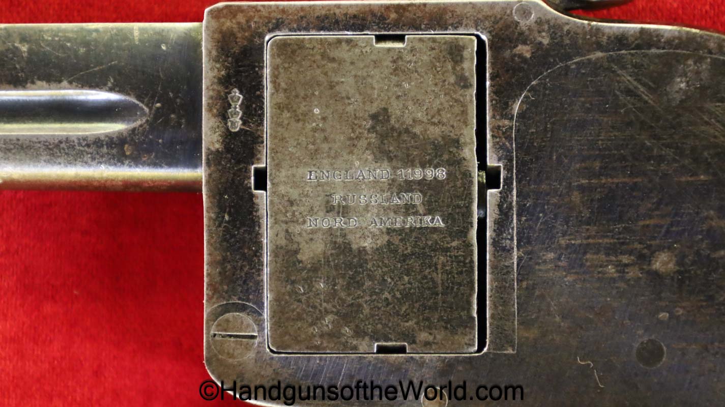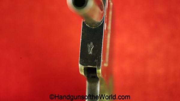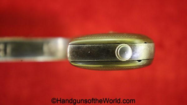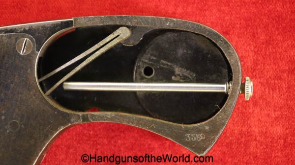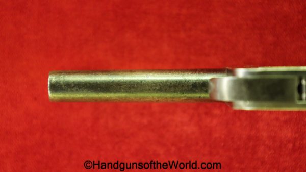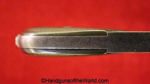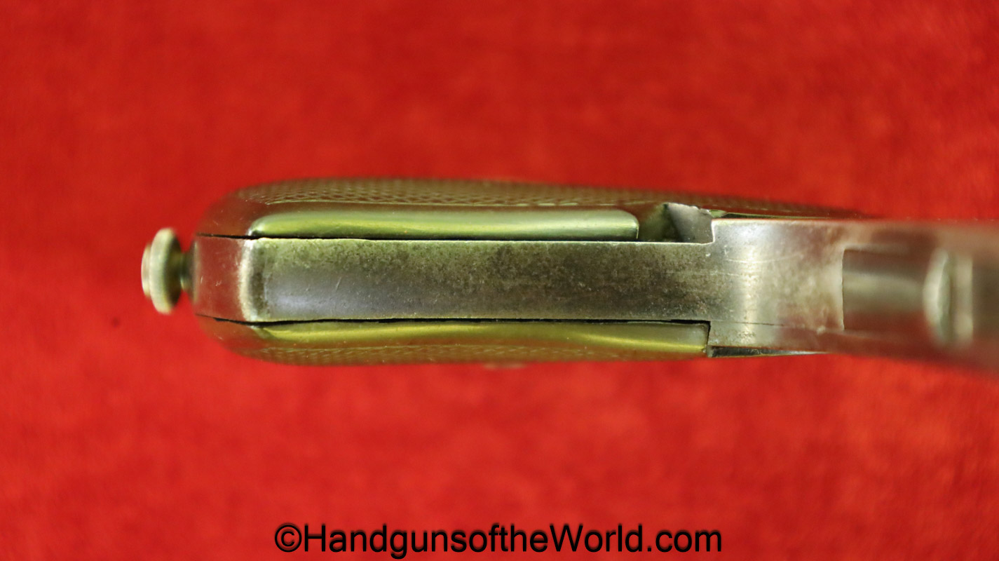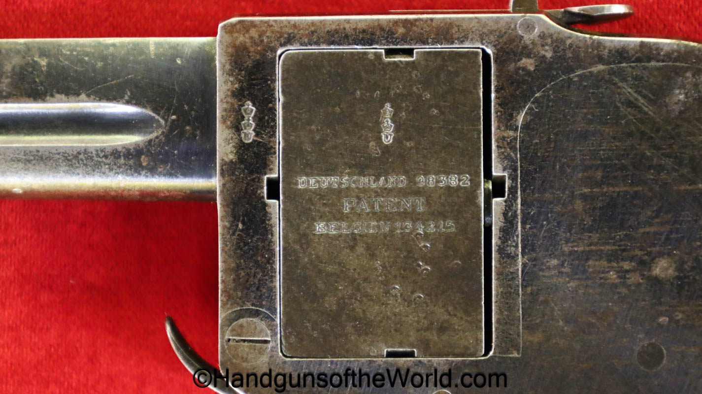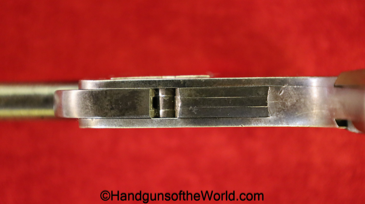 Sauer Bar Pistol, 6.35mm. This is a 2 barrel 4 shot Revolver. Fires 2, then you manually rotate the rectangle Bar-Cylinder. This has hard rubber grips which shows a chip on the right panel. This has the extractor rod intact in the butt. the blue rates about 40% and the bores are VG+.