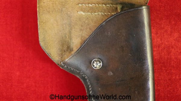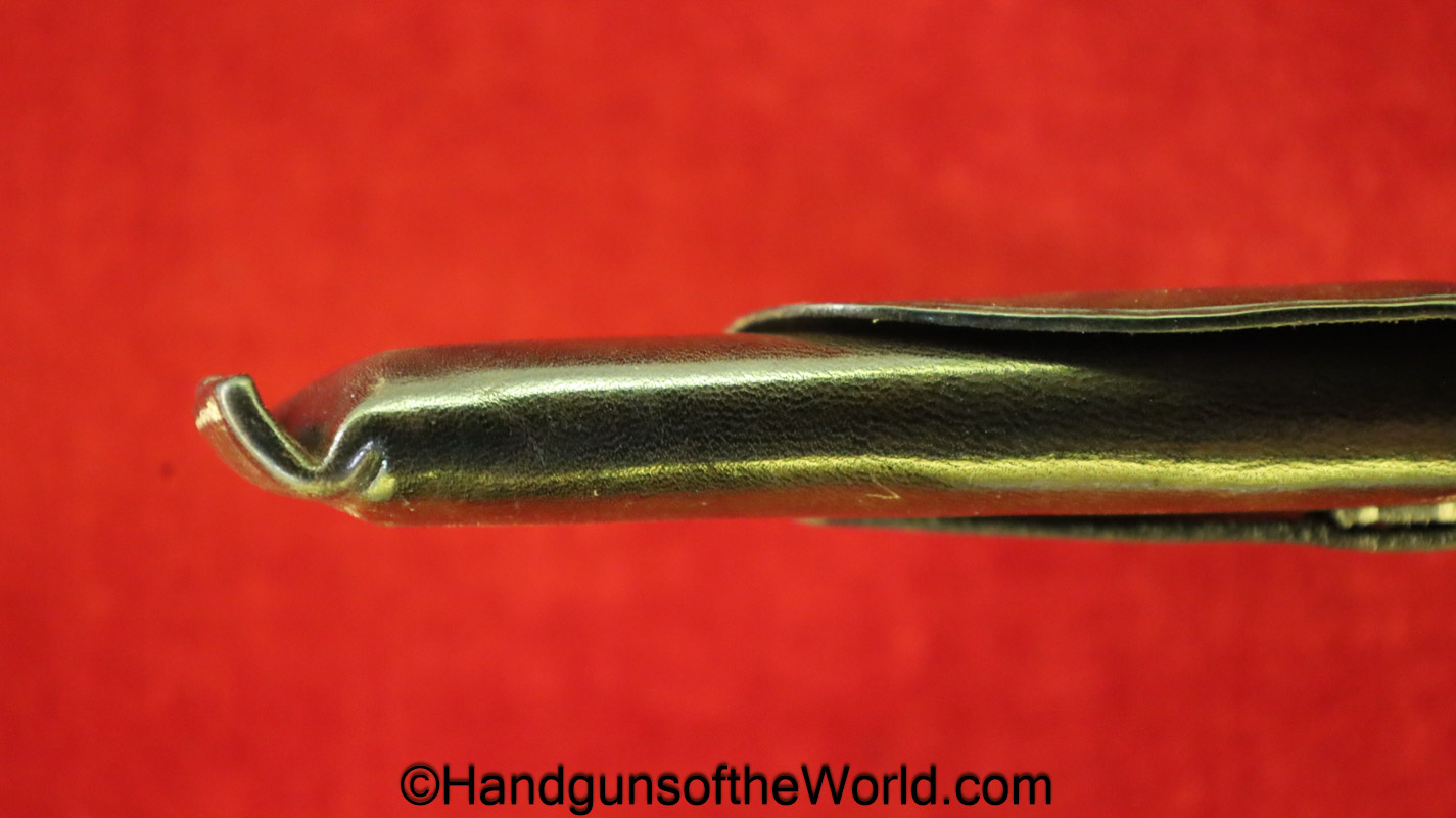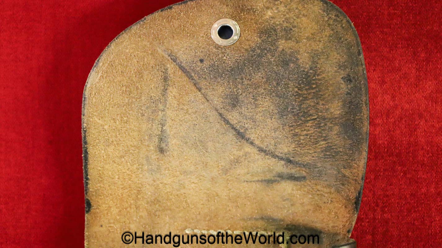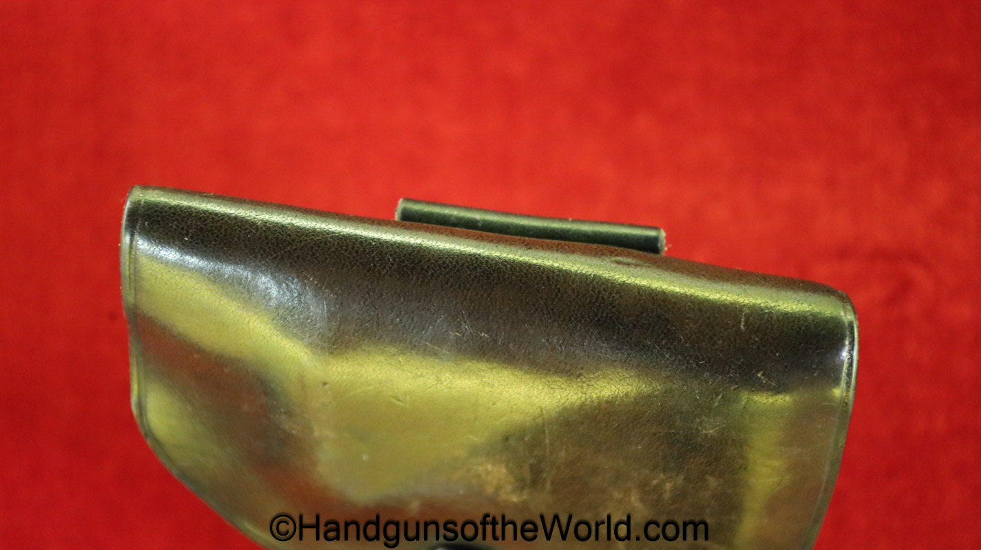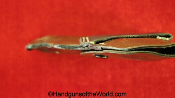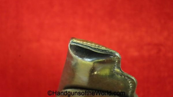 Period Sauer WTM Model 28 Pistol Holster. This is unmarked brown leather built without a spare magazine pouch and a snap closure. Overall VG-VG+