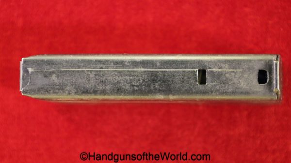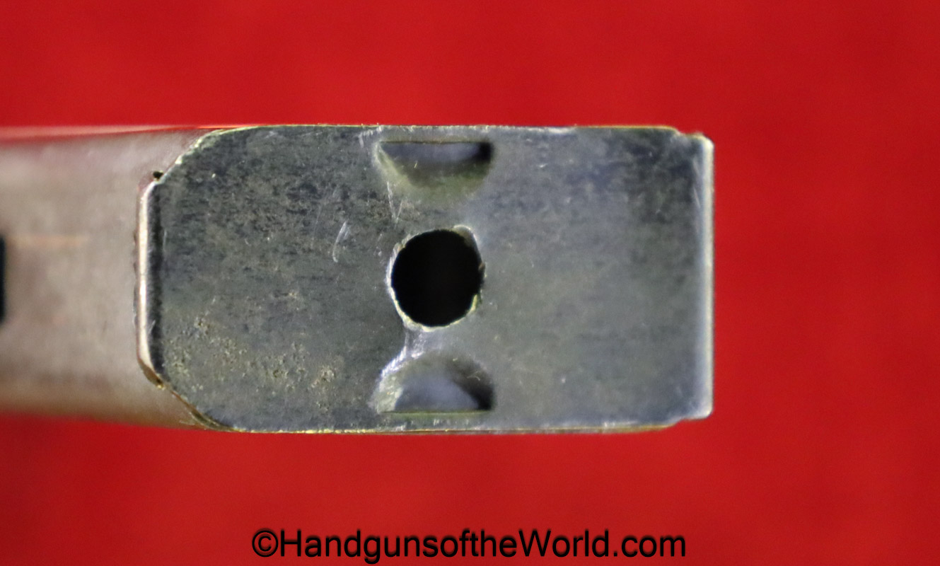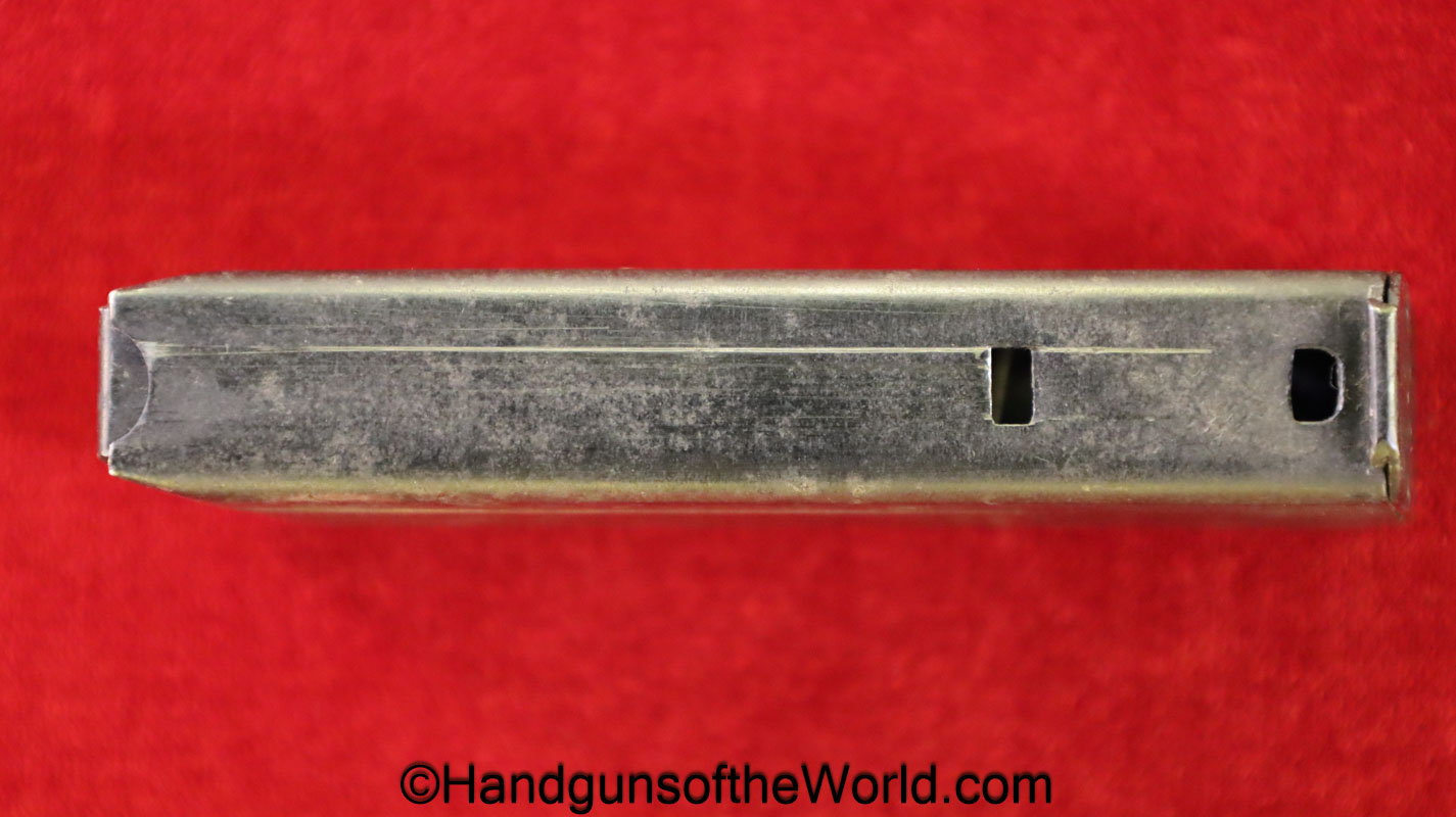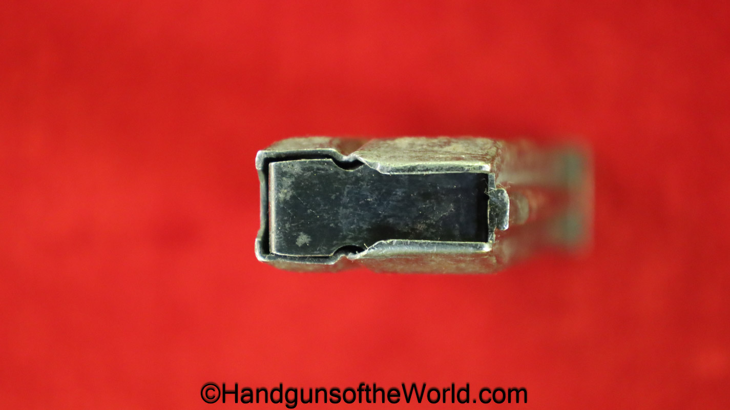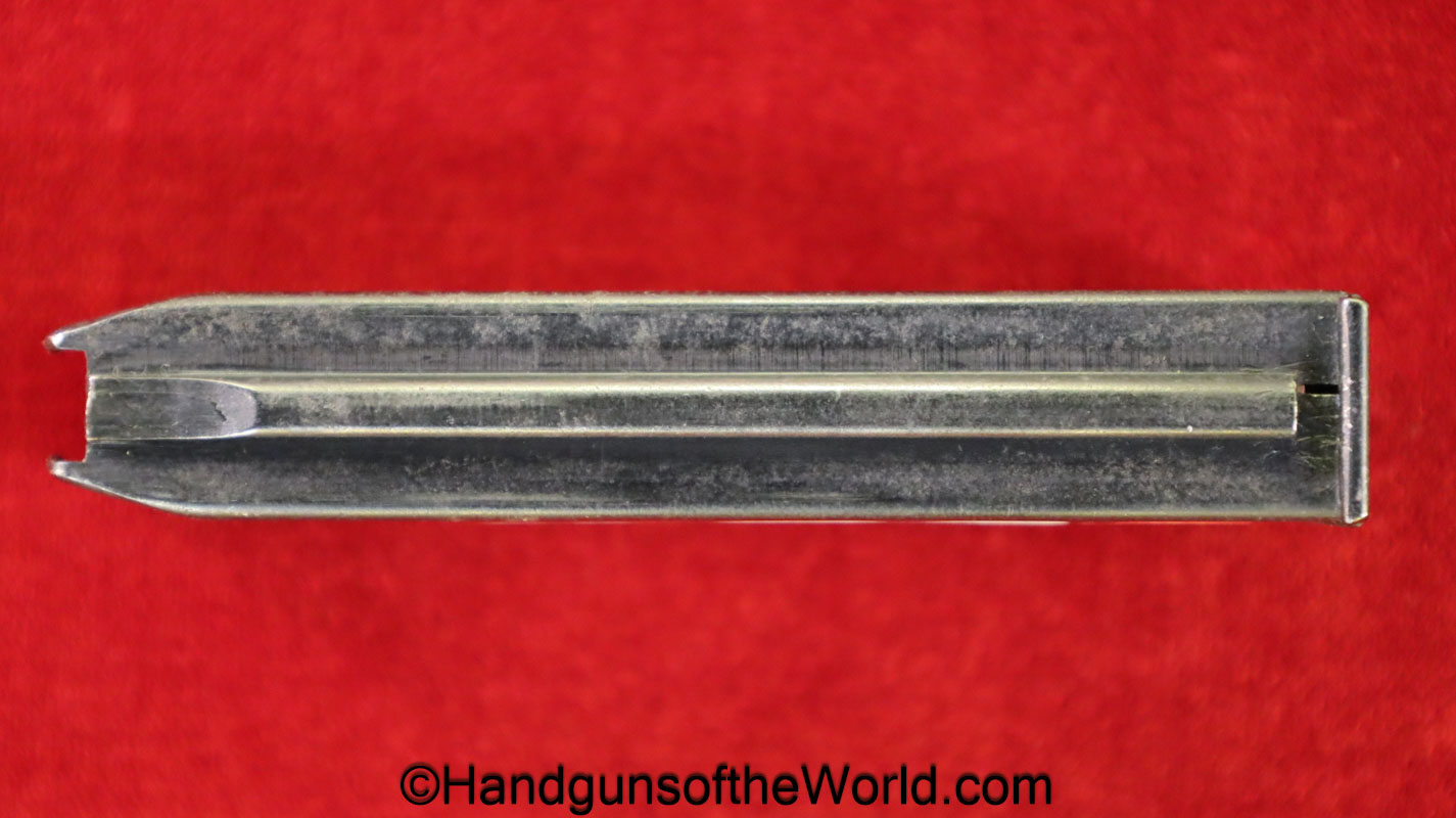 Original Savage 1907 or 1917, .32acp Pistol Magazine. This has 2 locking slots on the front spine. About 90% blue remains.