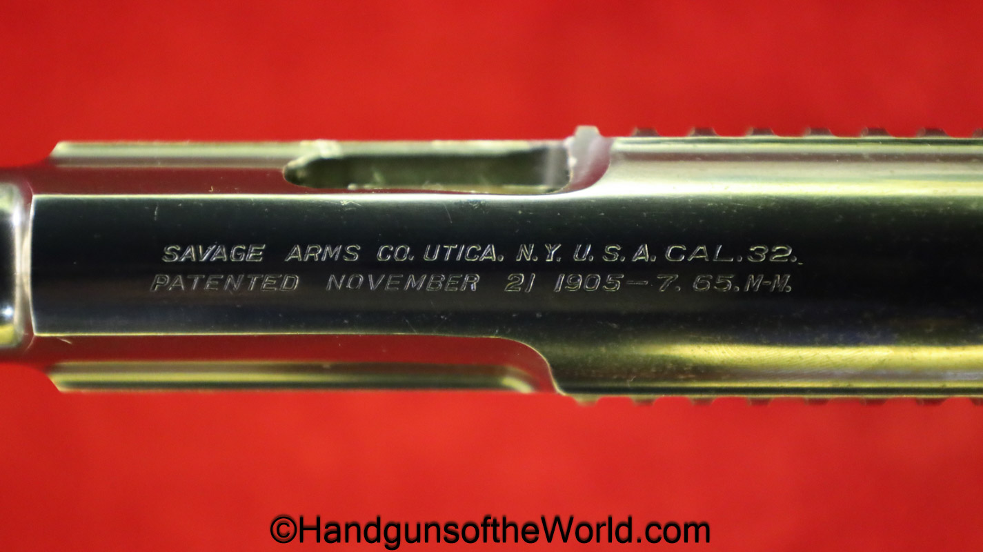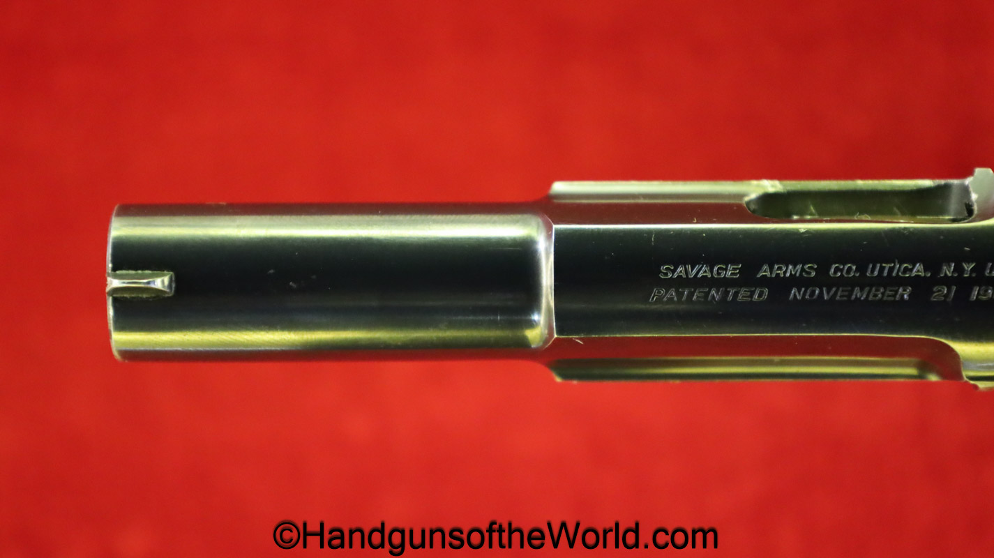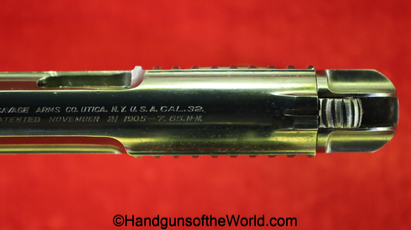 Savage 1907, .32acp. This was built about 1917 with hard rubber grips. This has a round hammer and a loaded cartridge indicator on the barrel. The high polish blue rates about 95% and the bore is excellent.