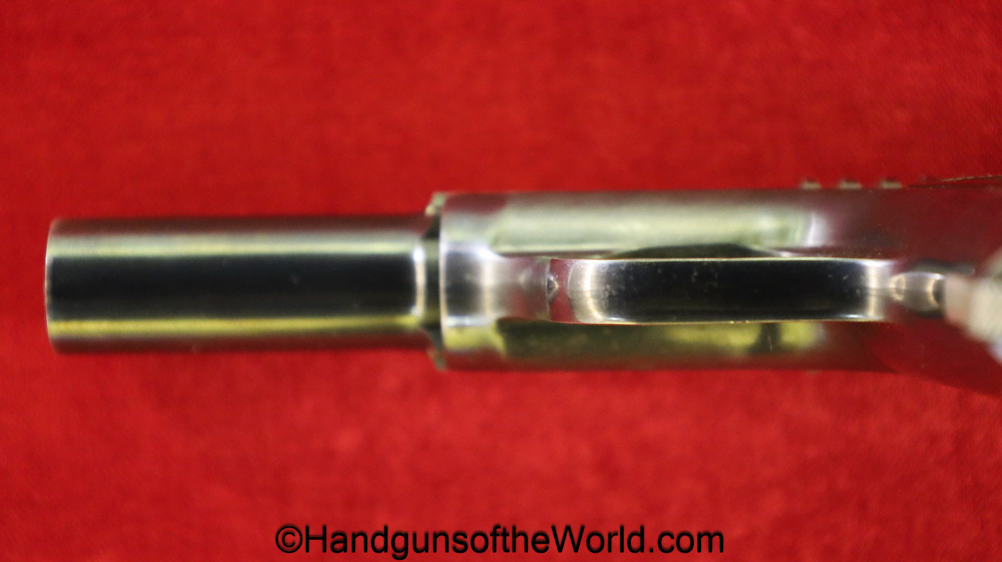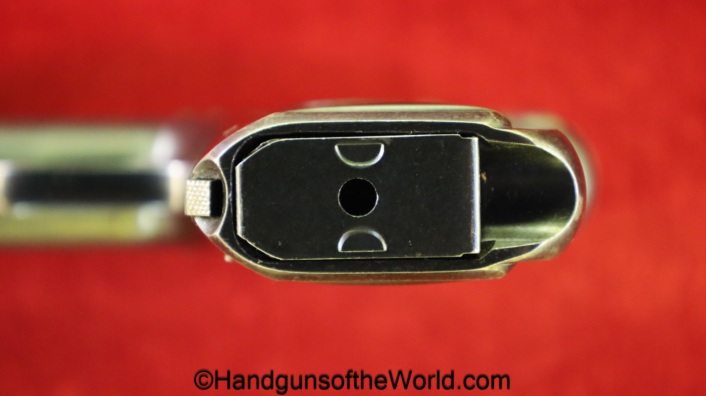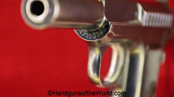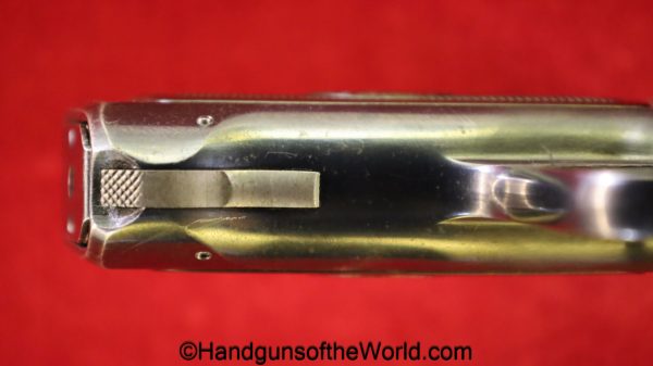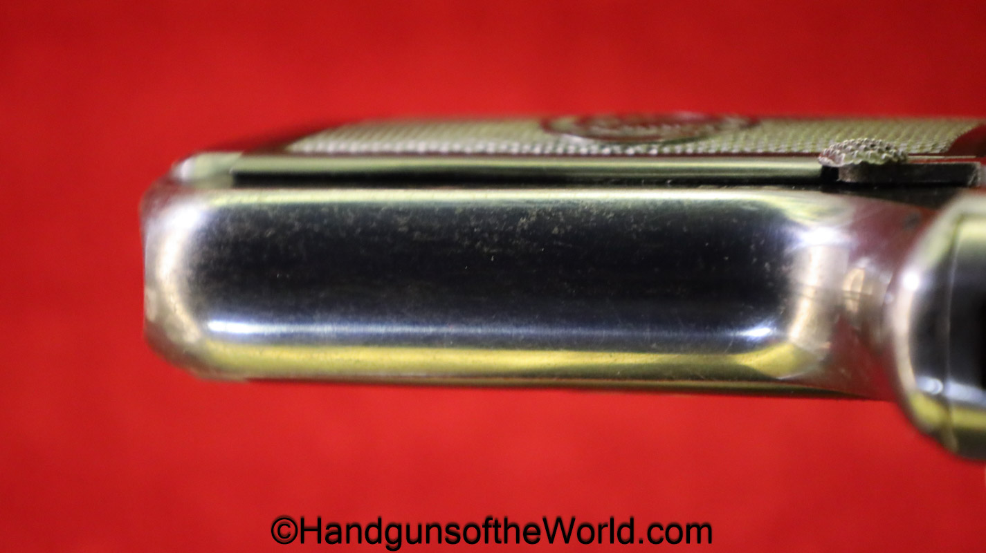 Savage 1907, .32acp. This was built about 1917 with hard rubber grips. This has a round hammer and a loaded cartridge indicator on the barrel. The high polish blue rates about 95% and the bore is excellent.
