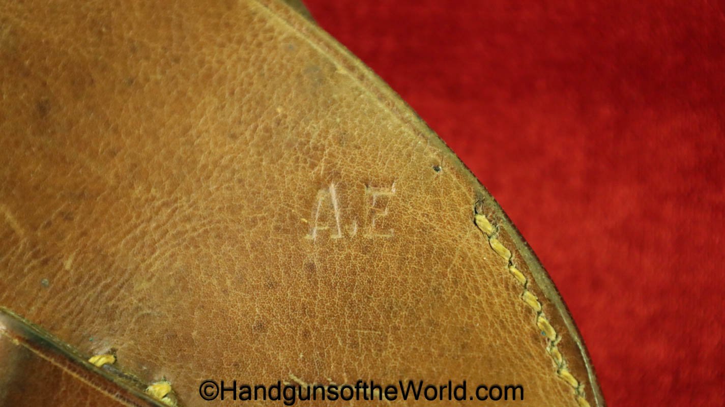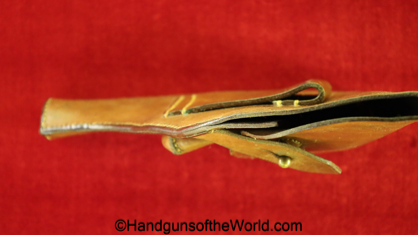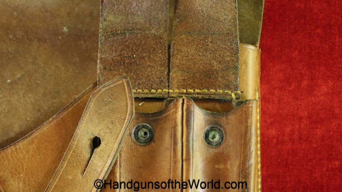 Original Savage 1907 Pistol Holster. This is brown leather with Portuguese AE marking on the back. This has dual, spare magazine pouches on the front with snap closures-missing the retainer teats, otherwise VG+.