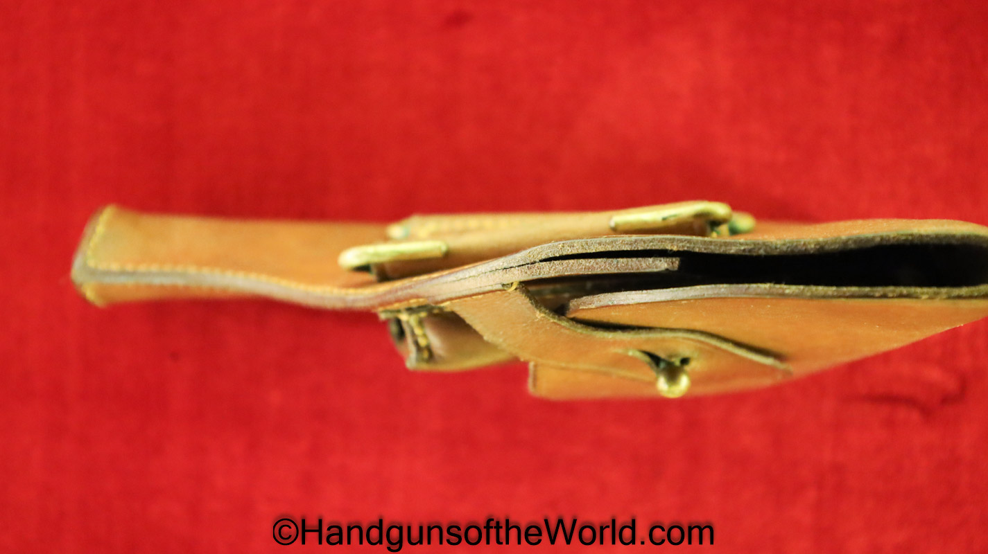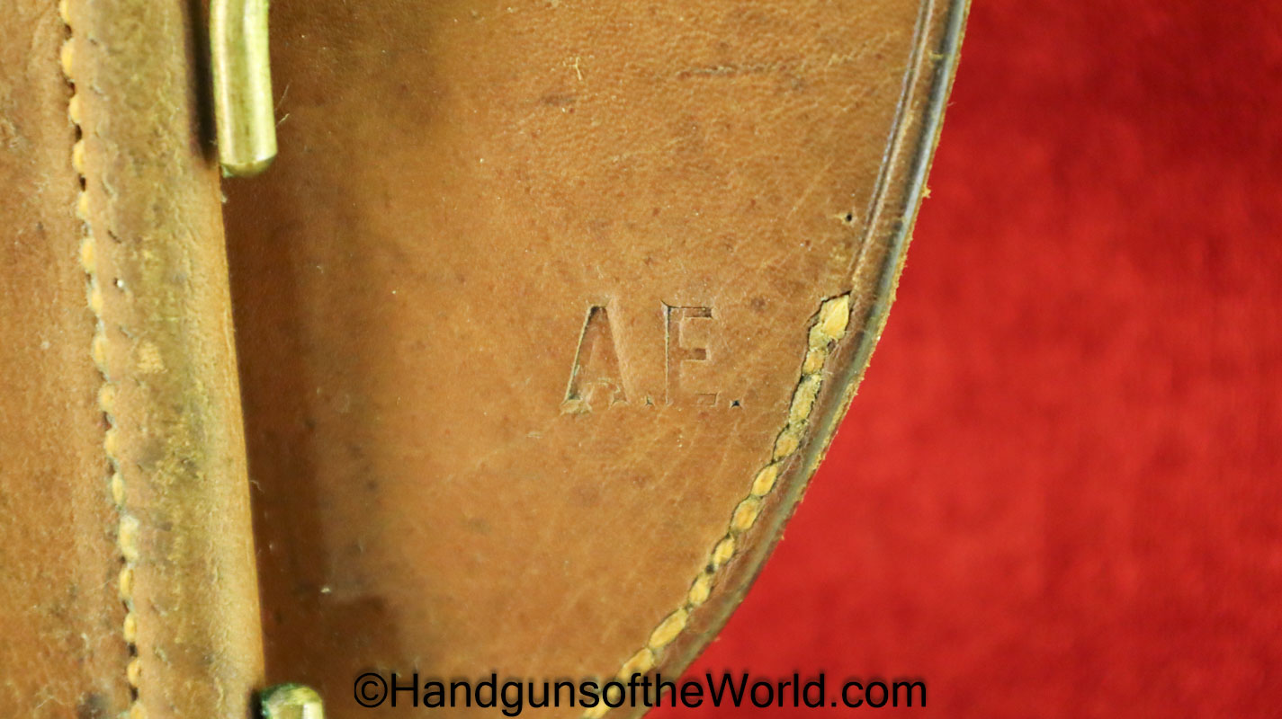 Original Savage 1907 Pistol Holster. Brown Leather Portuguese AE marked on the back. This has brass belt retainers and swivel stud magazine pouch retainers. Overall VG+.