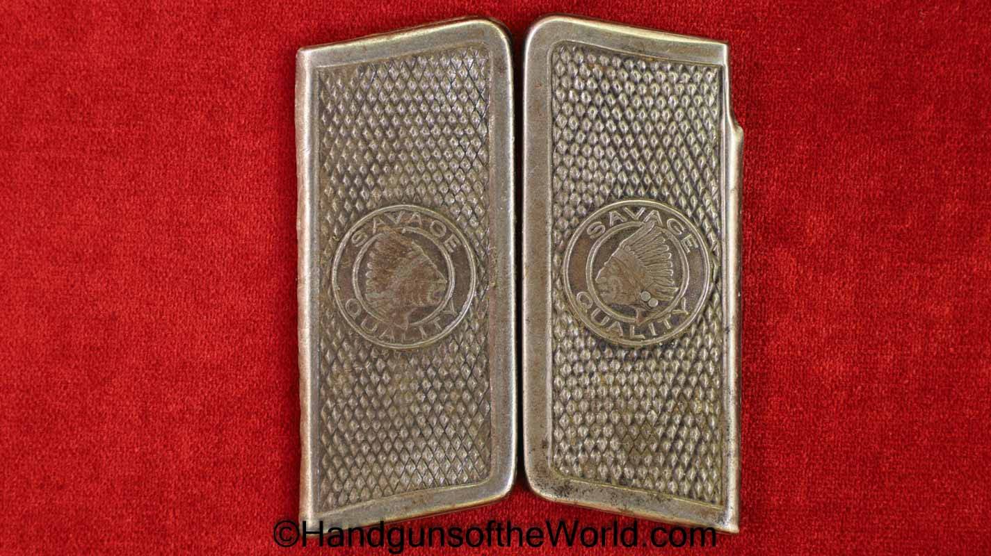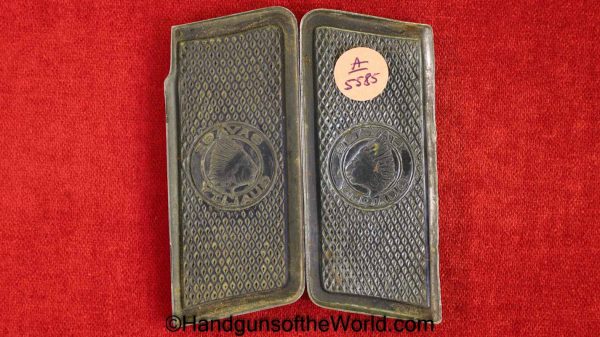 Original Savage 1907 Pistol Grips. These are early stamped steel with the Indian head logo. Overall VG-VG+.