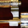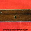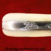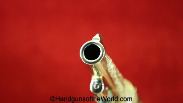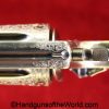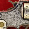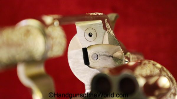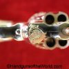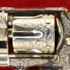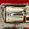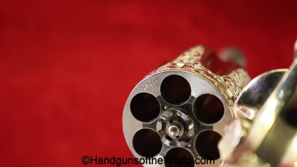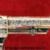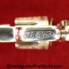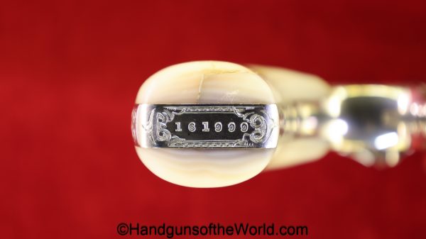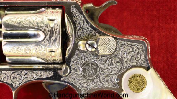 Smith & Wesson Model 1903 Hand Ejector, .32 Long 5th Change. Shipped from the factory July 24 1912 with a 3 1/4″ barrel and in the White, which per the included S&W Factory Archive letter, states that this was normally done for a revolver which was intended to be engraved. This is finely engraved and has mother of pearl grips with S&W medallions with the right panel showing an old repair. This retains 99+% nickel and the bore is excellent. This comes with a period, retailer, blue felt lined walnut case-lid replaced, with pearl knobs, the key, a brush and some cleaning patches.