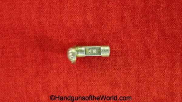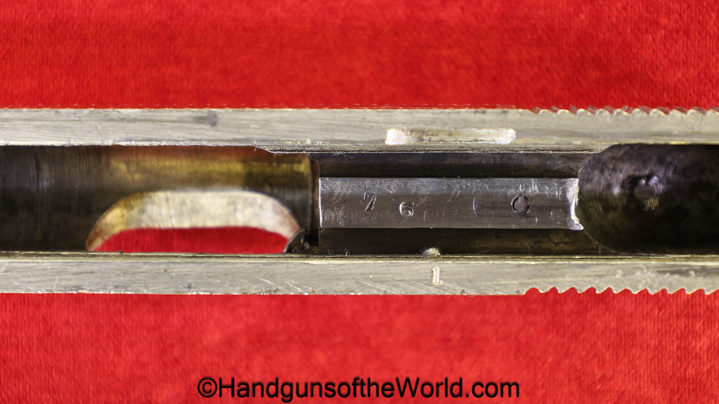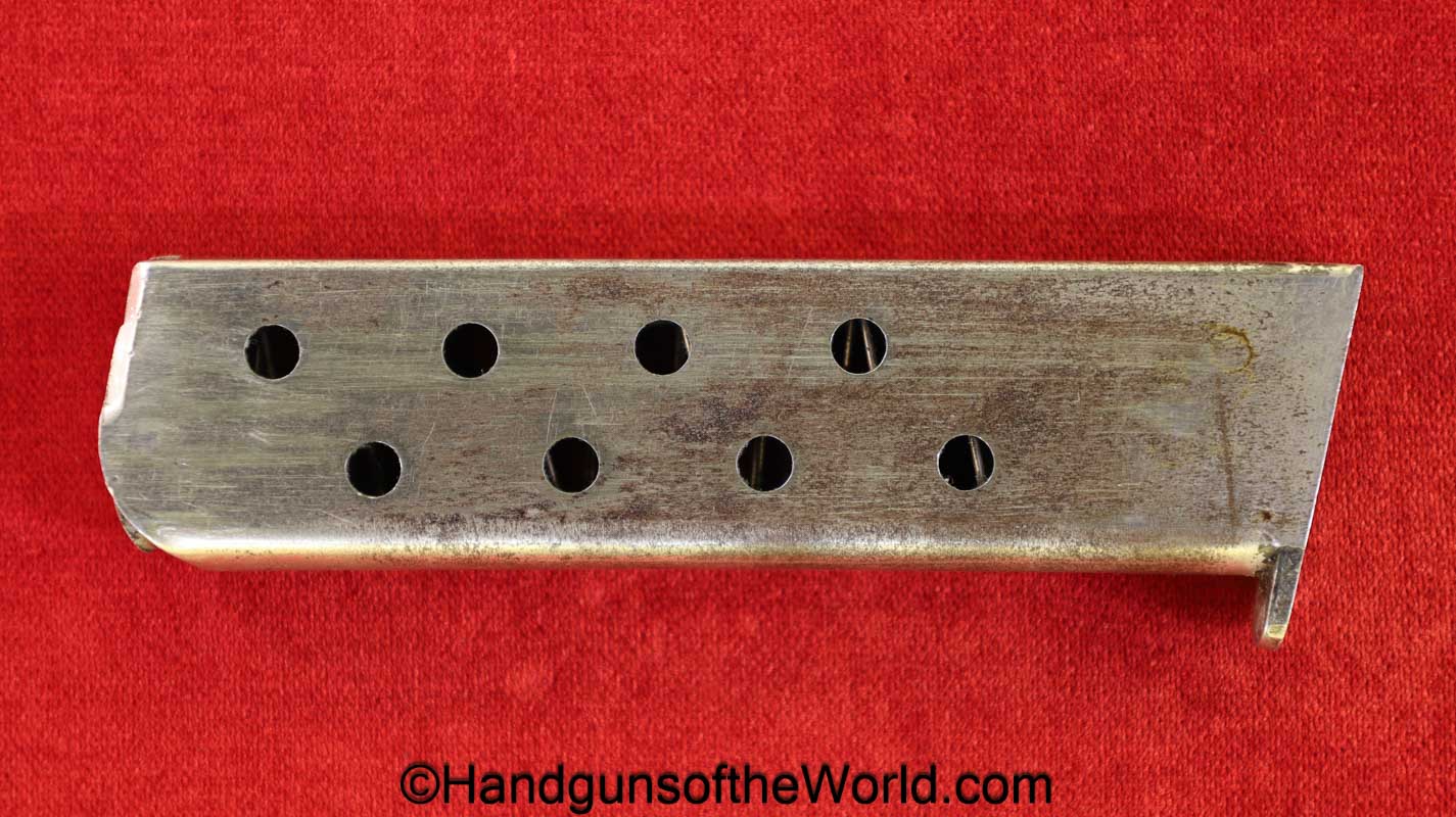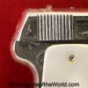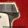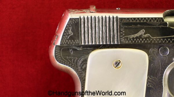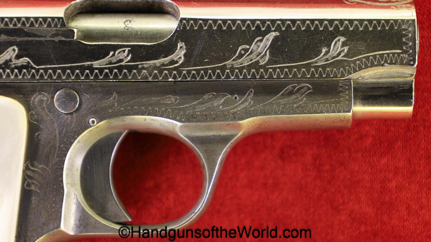 Spanish Ruby, 7.65mm. This is the standard 8 shot with standard slide marked “7.65 Model Automatic Pistol” on the left side. This has light factory engraving and Mother of Pearl grips. This is marked Eibar 1927 under the left grip panel. The assembly numbers are matching. This retains about 90% factory nickel and the bore is VG-VG+.