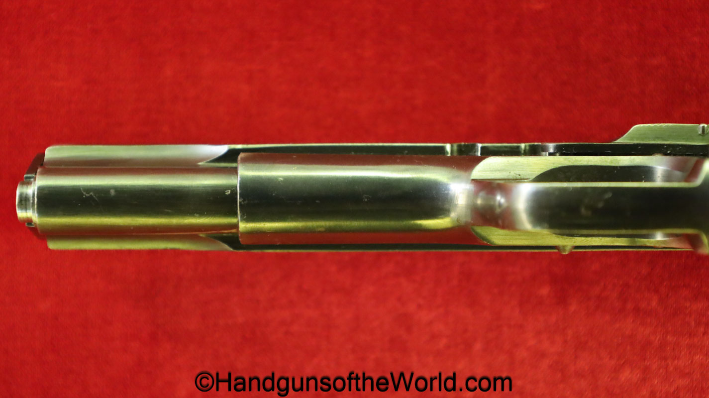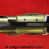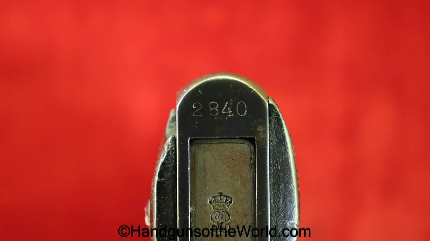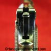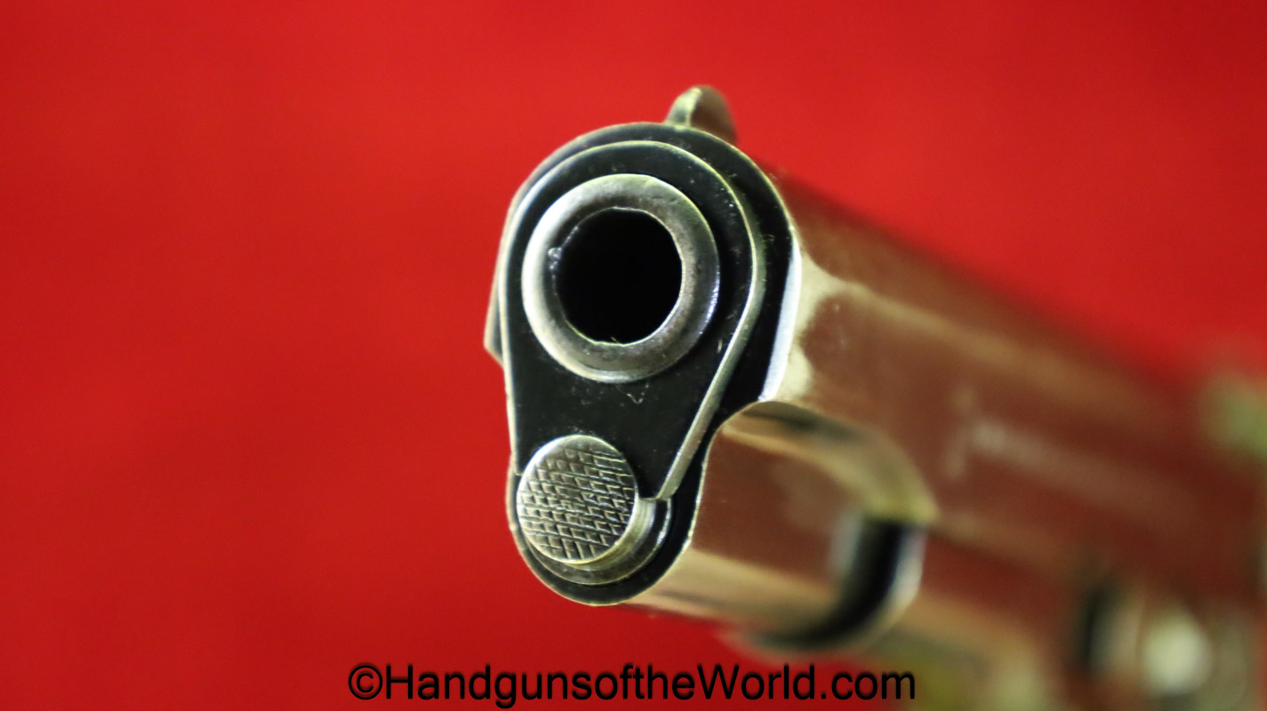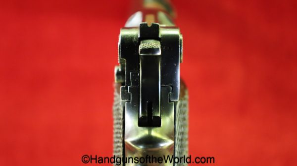Star Model 1920, 9mm. This is Spanish GC=Guardia Civil Crown proofed on the slide and magazine base. One of only 3850, this has the proper checkered walnut grips and no importer markings. This has all matching serial numbers with about 92% of an arsenal refinish. The bore is Fair-Good. This is missing the lanyard loop.