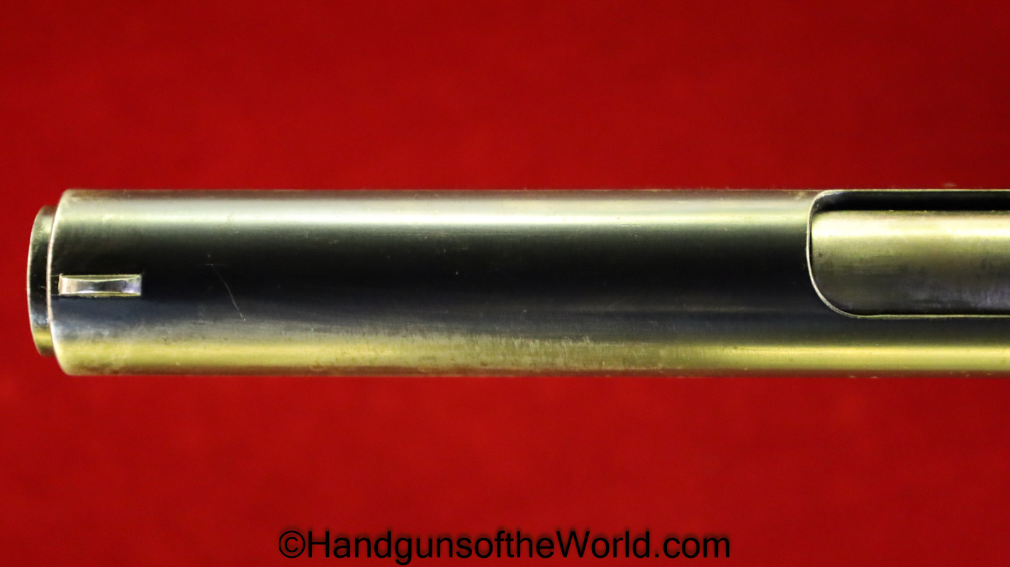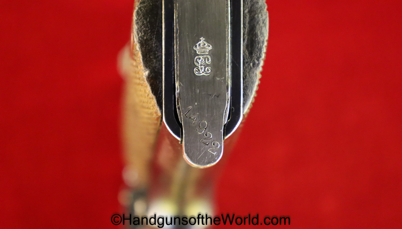 Star Model 1922, 9mm. This has the correct checkered walnut grips and has the Military Crown GC inspector marking on the slide and magazine bottom. This has all matching numbers to include the magazine, no import markings, about 90% blue and the bore is VG. A way above average Guardia Civil issued Handgun.