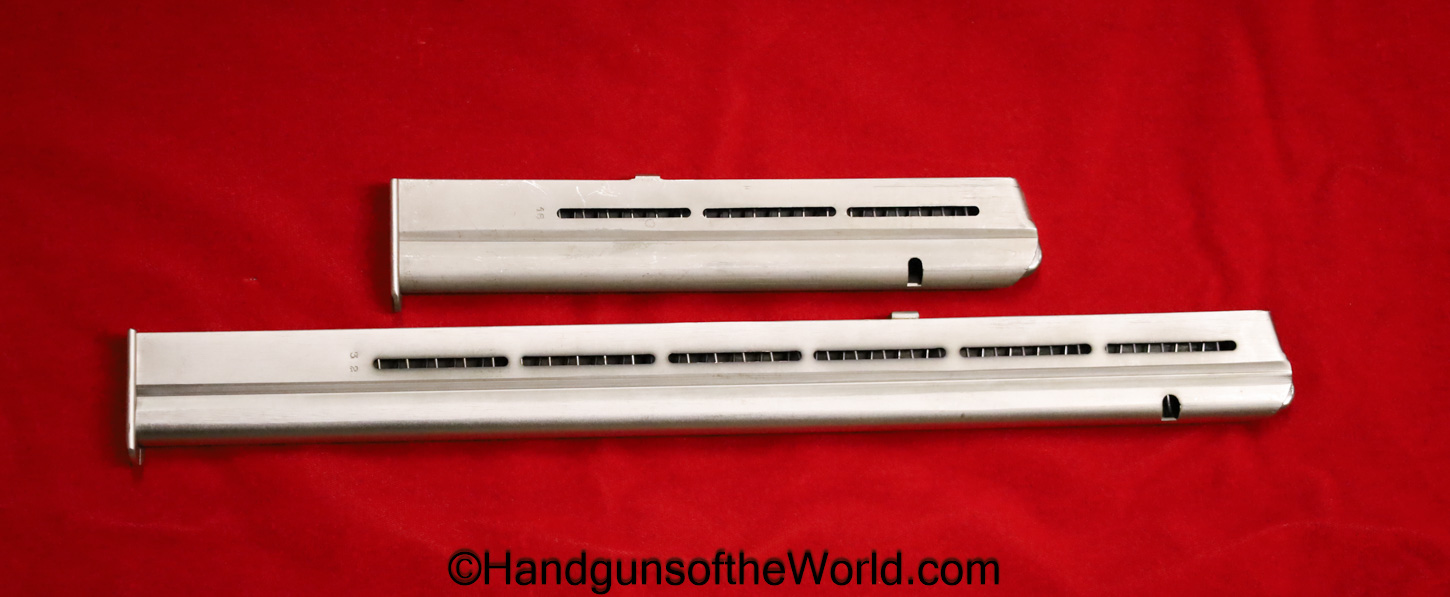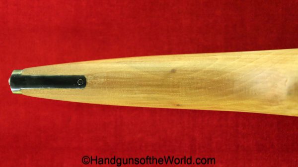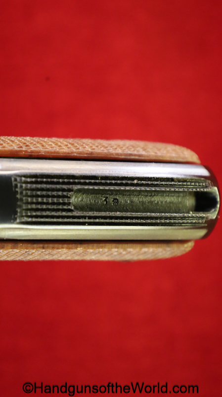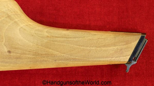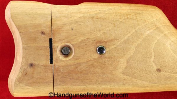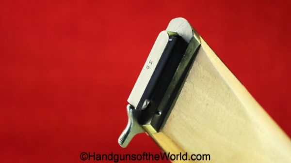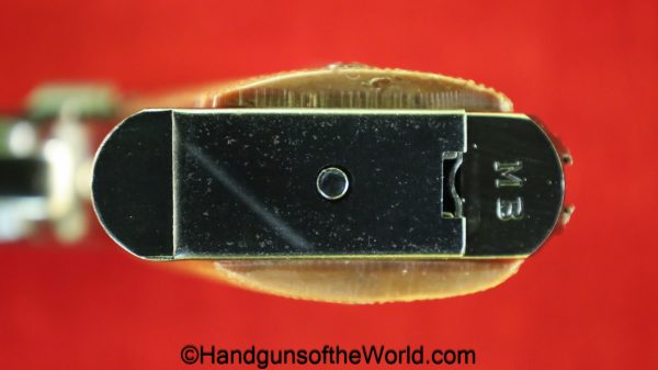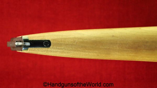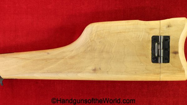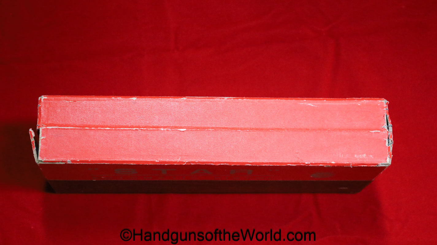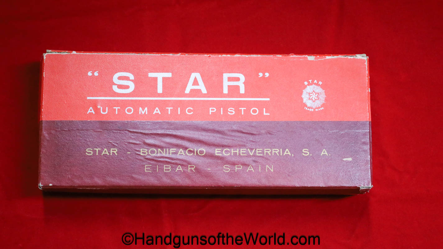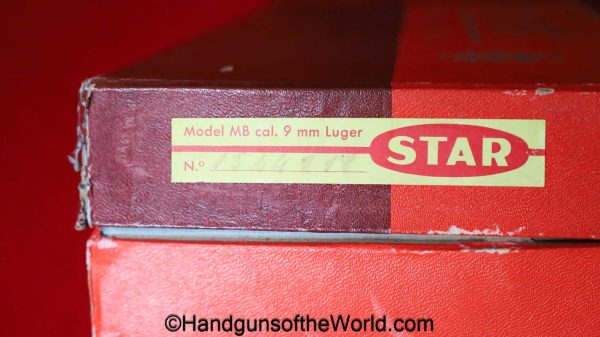 Star Model MB, 9mm. Built in 1975 with brown plastic grips. This is Spanish proof/dated under the left grip. The original wooden holster shoulder stock iron, and stock slot have the matching assembly numbers. This retains nearly all the original blue, and the bore is Mint. This has its numbered, red cardboard box with an extra 16 & 32 round extension magazines. This one has No importer markings. Only 1757 were built. These have been reclassified as C&R, and a copy of the ATF letter will be included.
