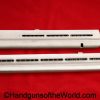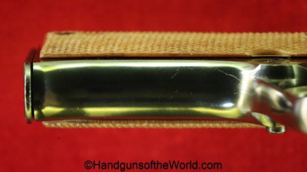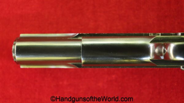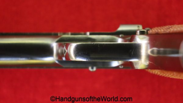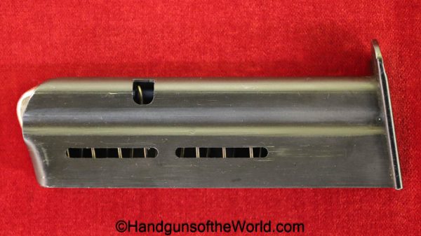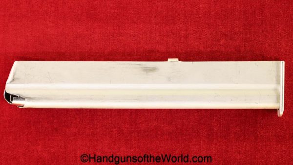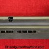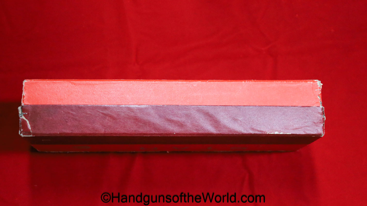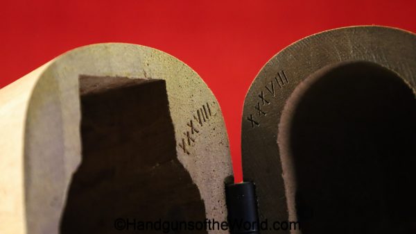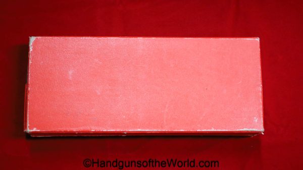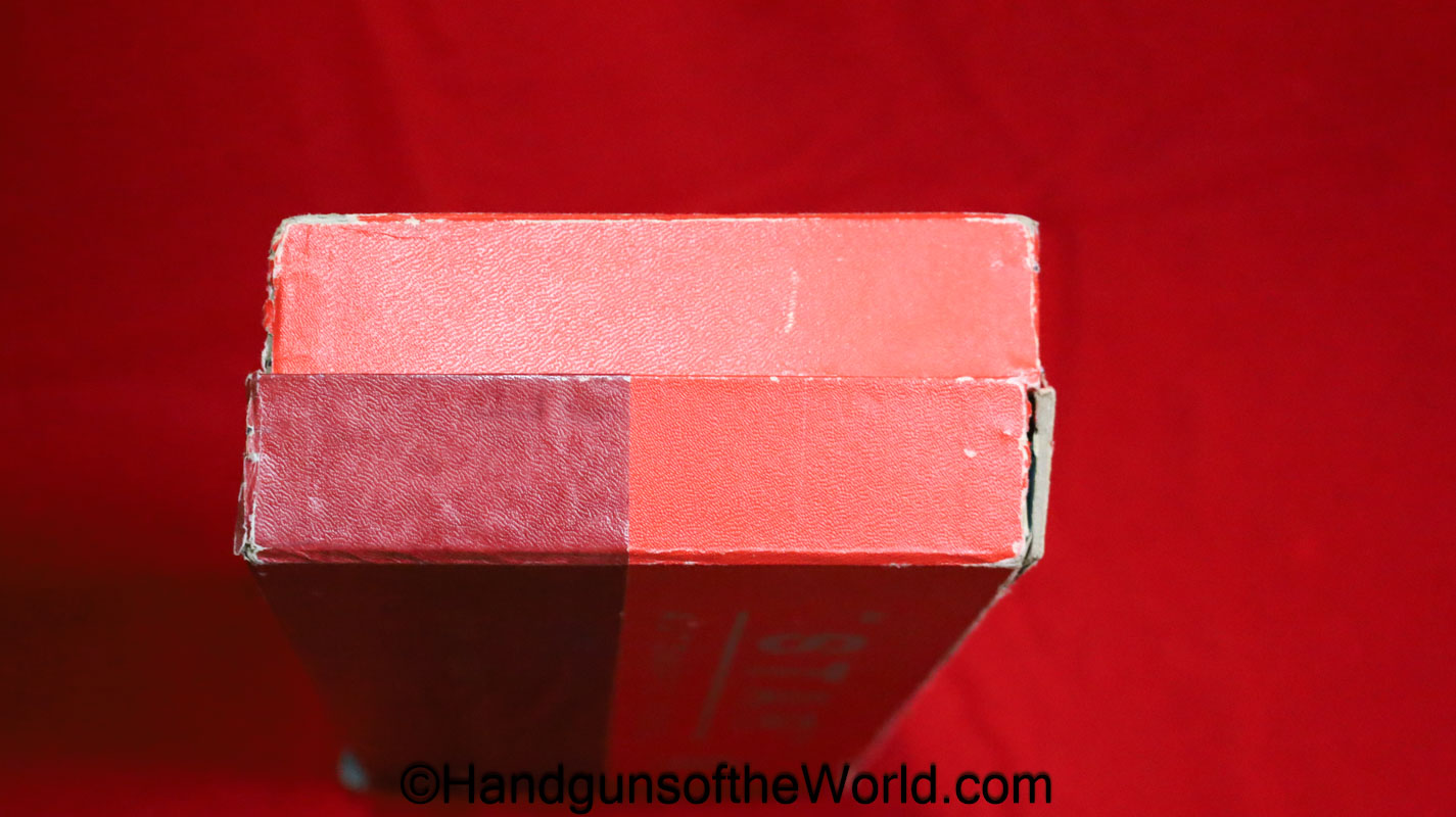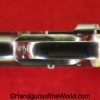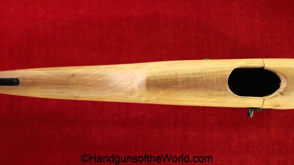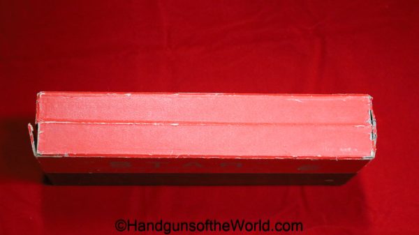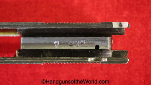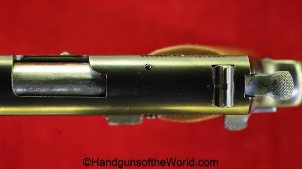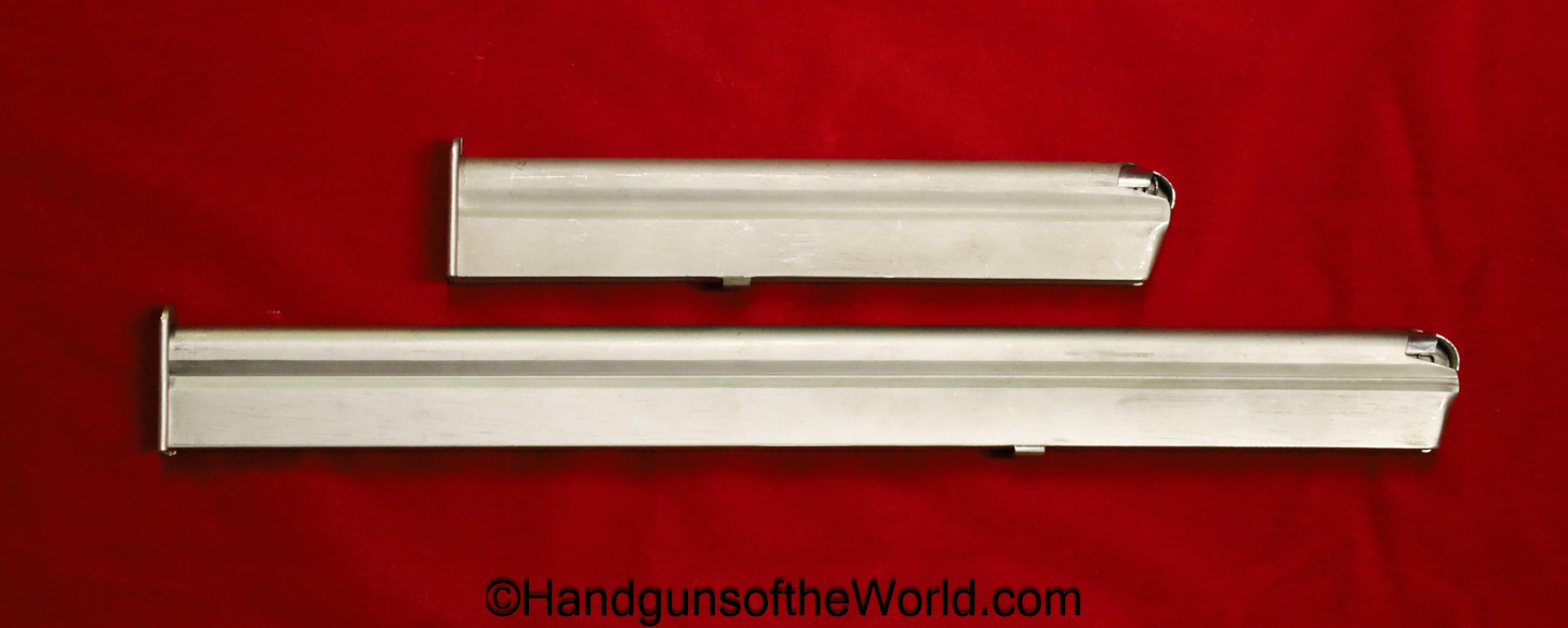 Star Model MB, 9mm. Built in 1975 with brown plastic grips. This is Spanish proof/dated under the left grip. The original wooden holster shoulder stock iron, and stock slot have the matching assembly numbers. This retains nearly all the original blue, and the bore is Mint. This has its numbered, red cardboard box with an extra 16 & 32 round extension magazines. This one has No importer markings. Only 1757 were built. These have been reclassified as C&R, and a copy of the ATF letter will be included.