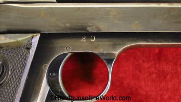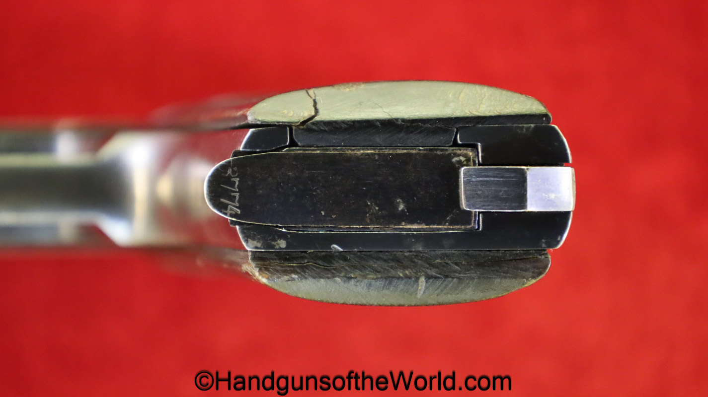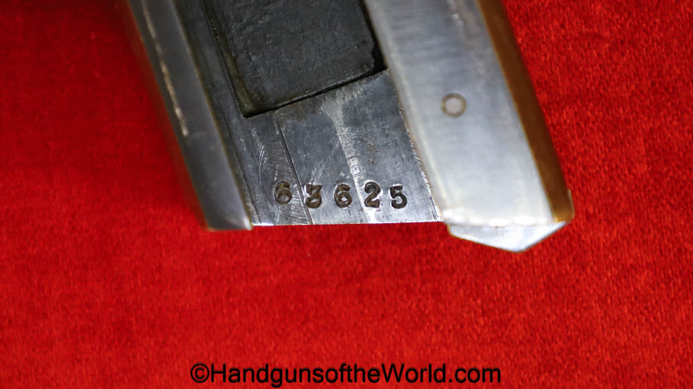 Stendawerk Pocket, 7.65mm. This is a late variation with a sliding lever take down. This has the STW logo horn grips, and a full slide legend. There is a rack number 20 on the right side of the frame, and a serial number from a different pistol on the base of the magazine. The blue rates about 35% and the bore is VG+.