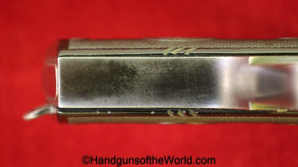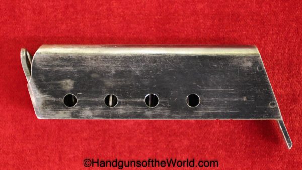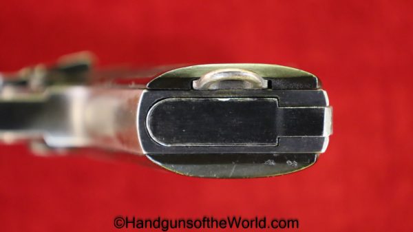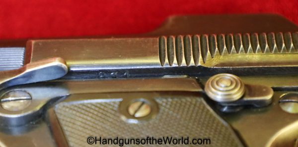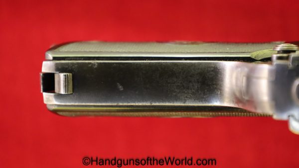 Steyr 1908/34, 7.65mm. This is Austrian proof/dated 1928 on the left side, and has the correct Steyr logo hard rubber grips. The added lanyard loop was done at the time of the 1934 update to the slide. The blue rates about 95% and the bore is excellent.