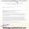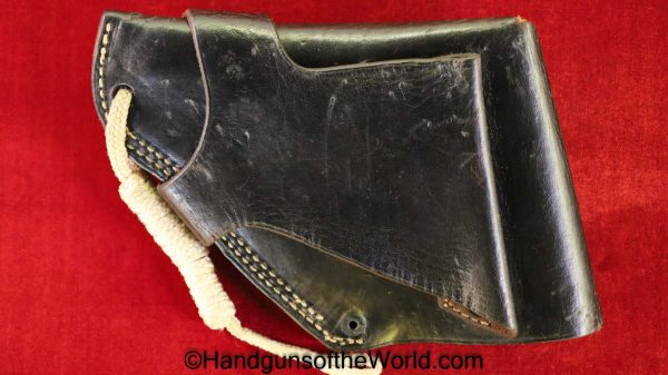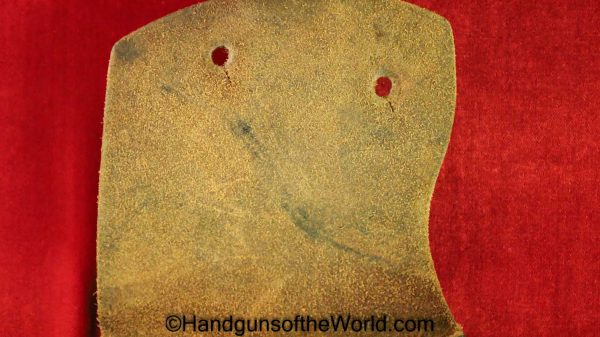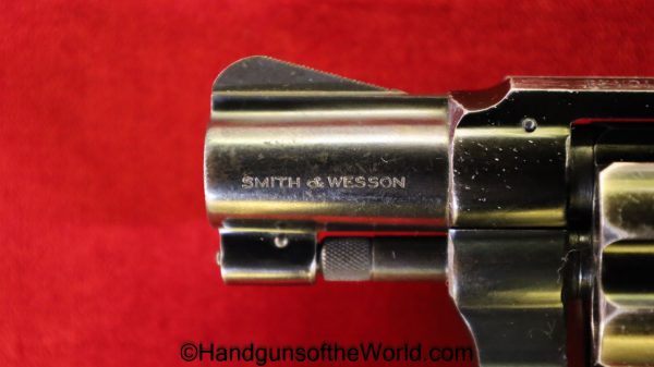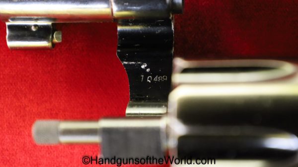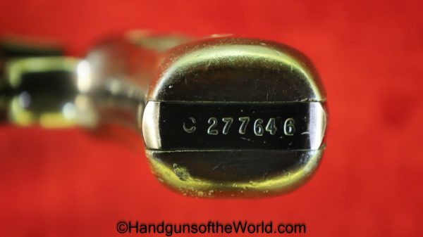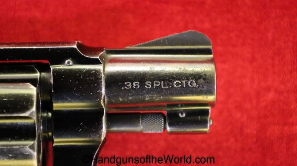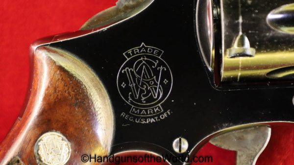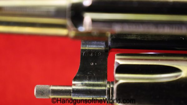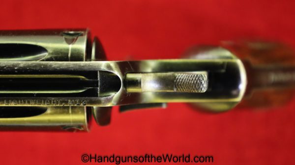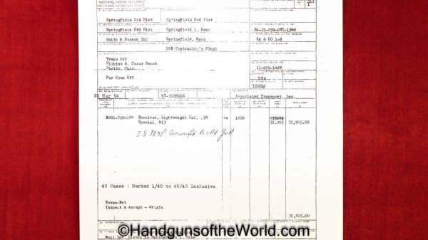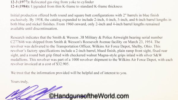 Smith & Wesson Model M13, .38 Special. This has the 2″ barrel and checkered walnut grips with medallions. This is marked M13 Revolver-Lightweight on the top strap and Property of US Air Force on the back strap. This is all aluminum with a possible renumbered cylinder. The black anodized finish rates about 95% and the bore is excellent. This comes with the proper black leather holster marked USAF on the front, and an S&W factory archive letter.