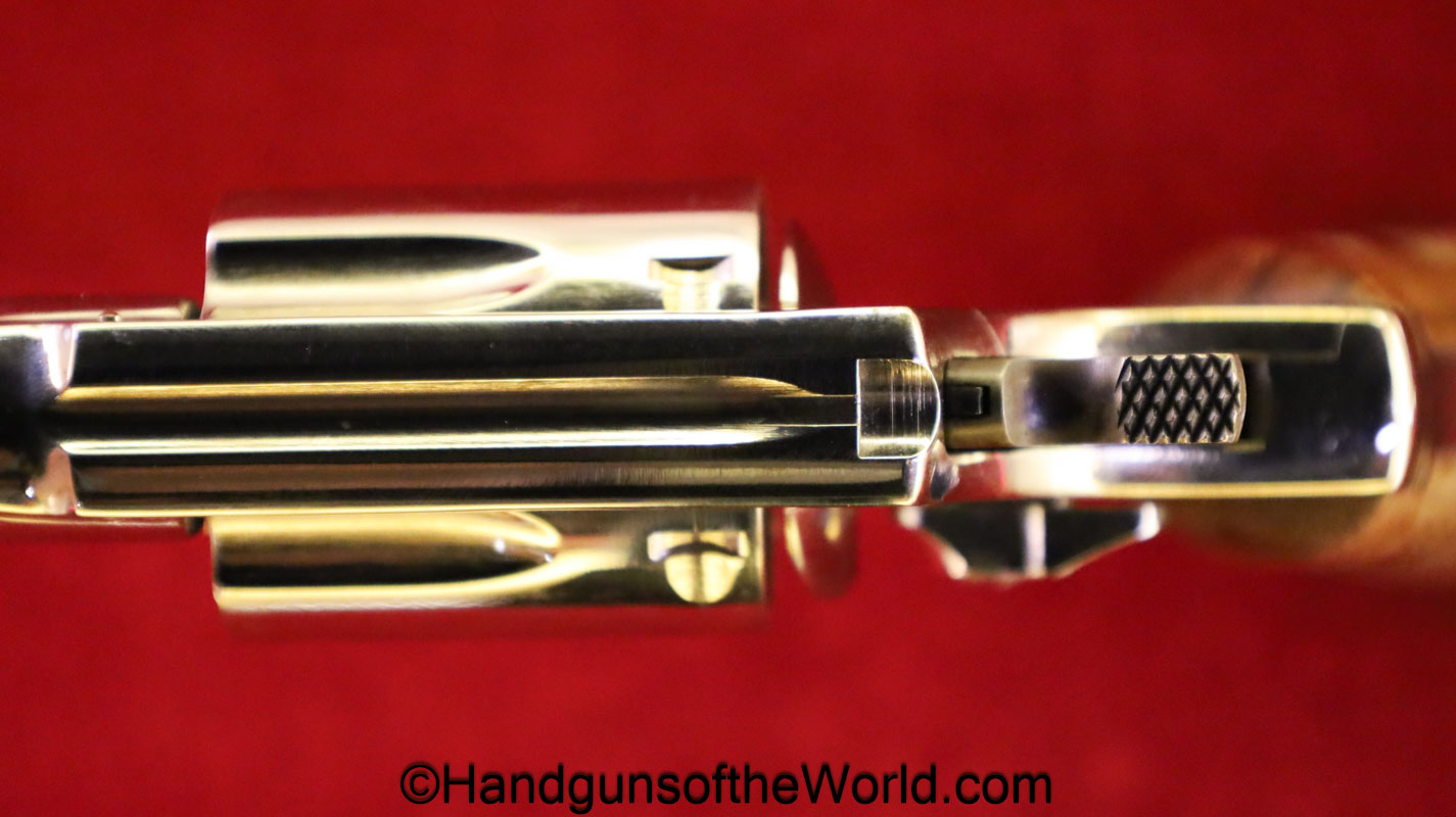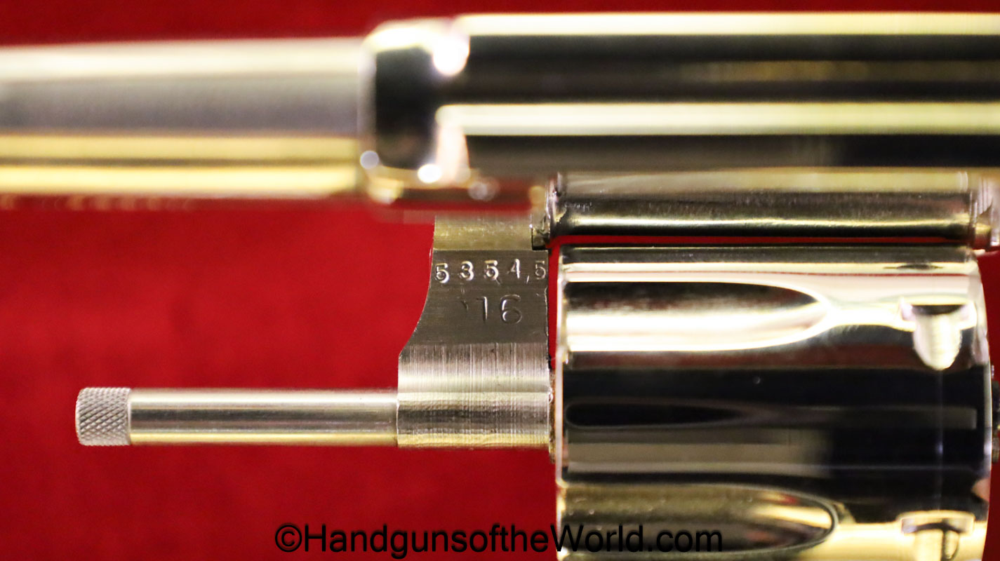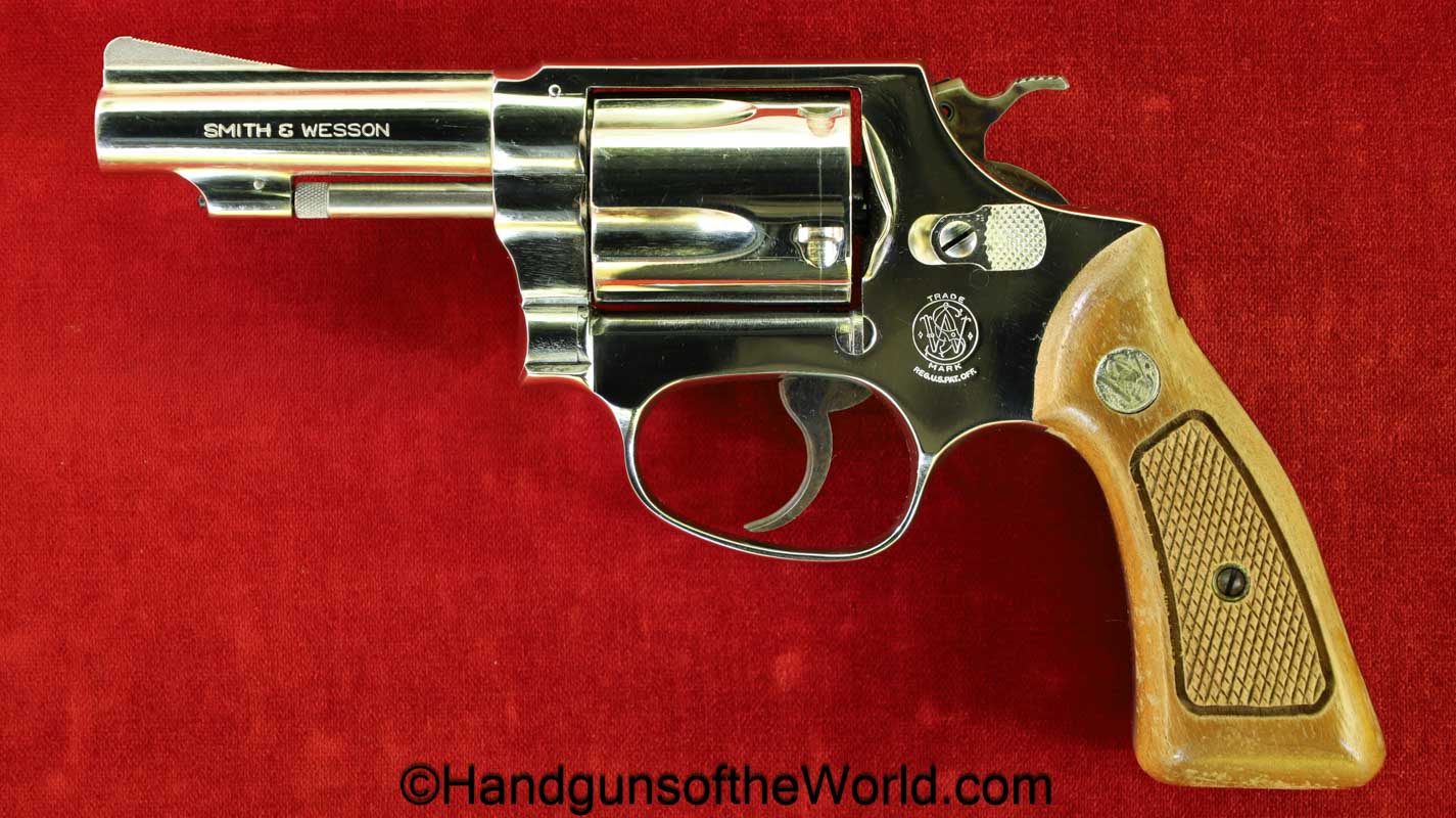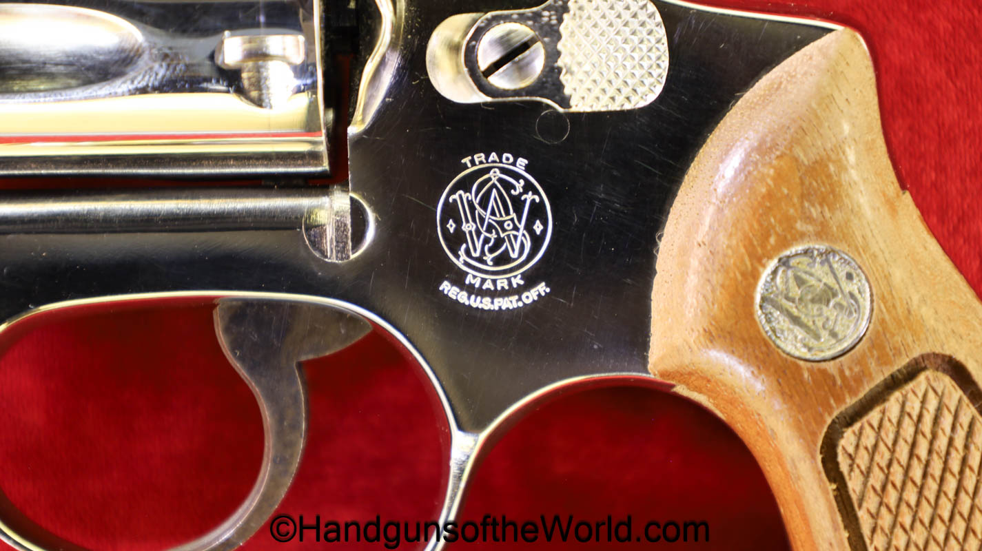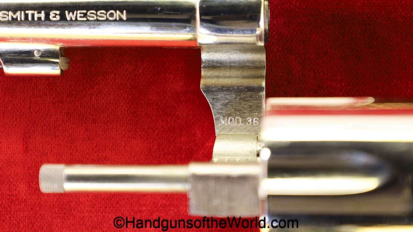 Smith & Wesson Model 36, .38 Special. This has the 3 1/4″ barrel and checkered walnut grips with S&W medallions. 99+% nickel finish remains.