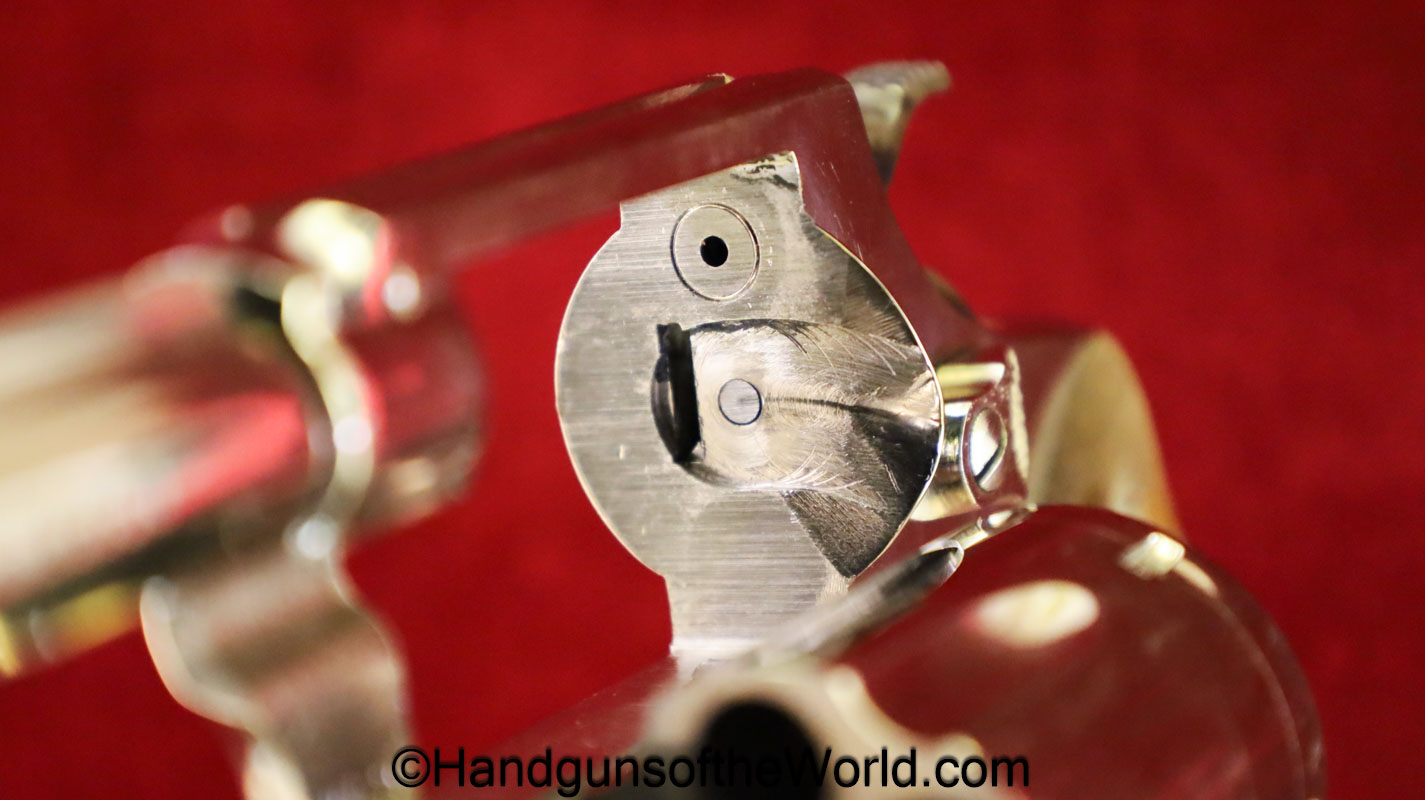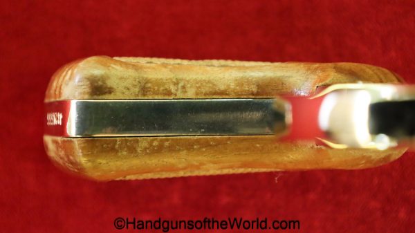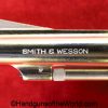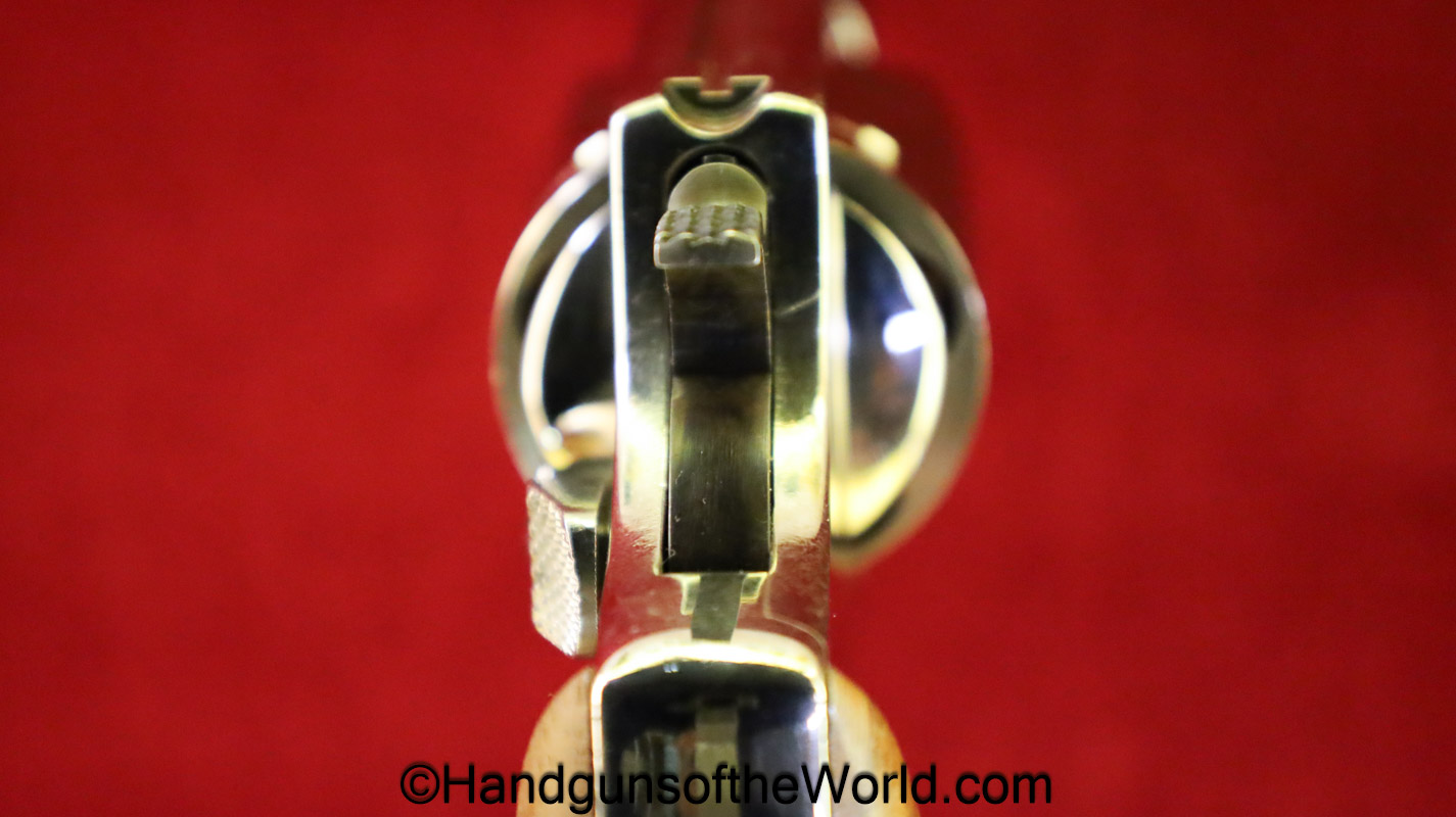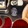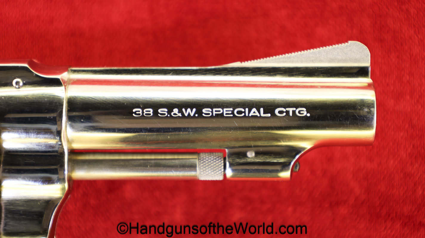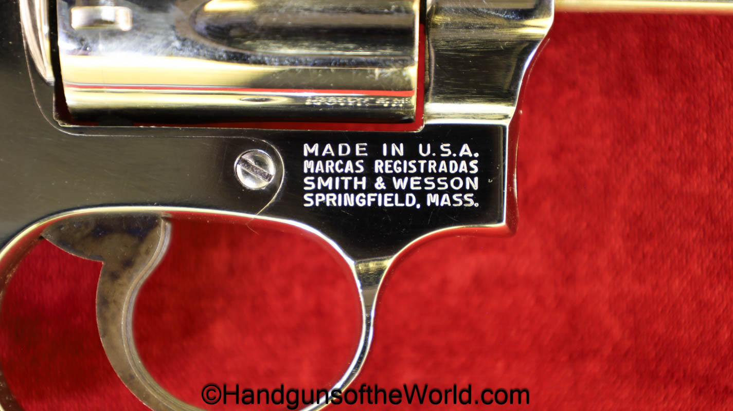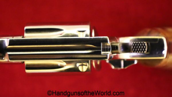 Smith & Wesson Model 36, .38 Special. This has the 3 1/4″ barrel and checkered walnut grips with S&W medallions. 99+% nickel finish remains.
