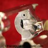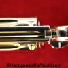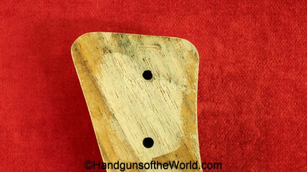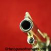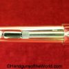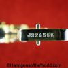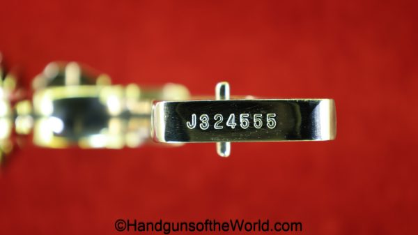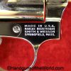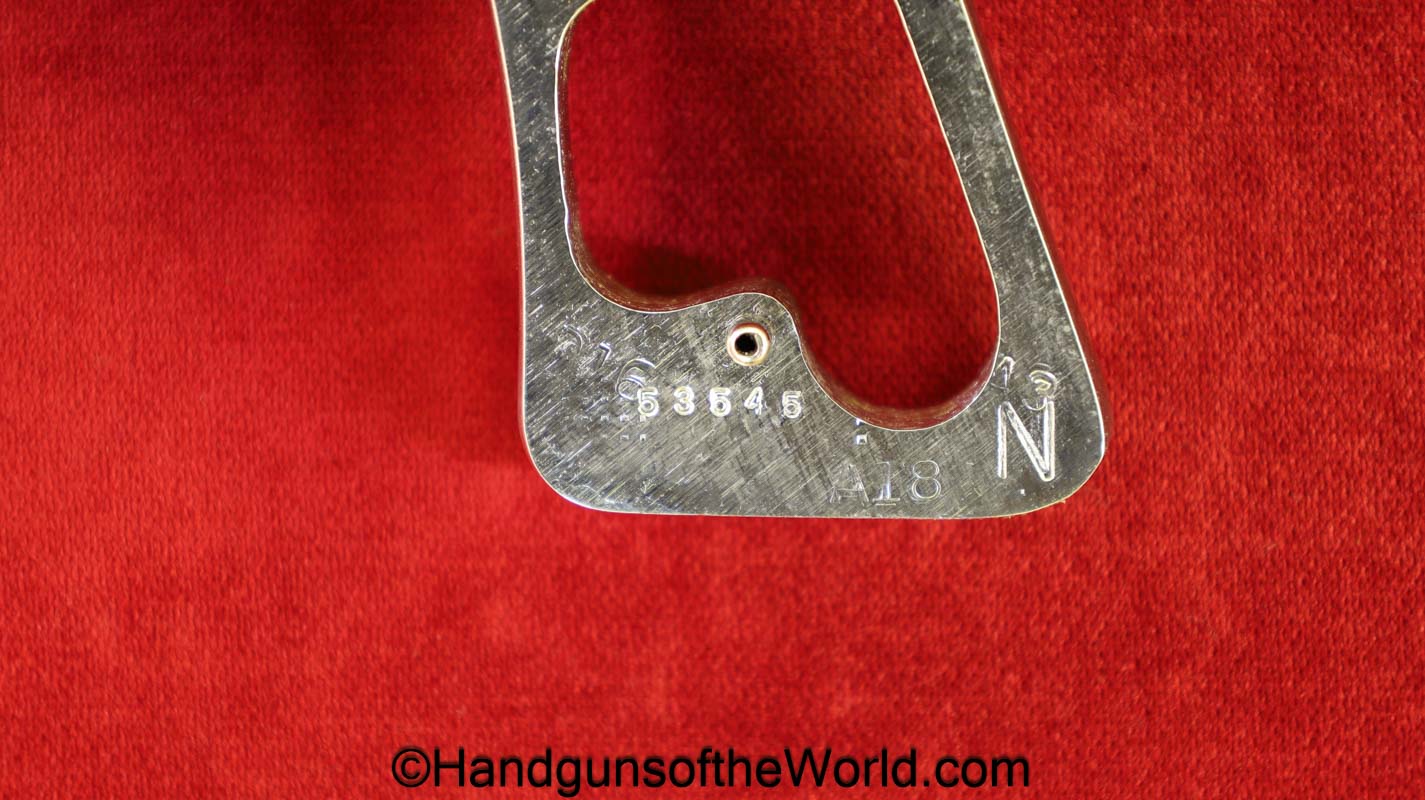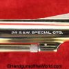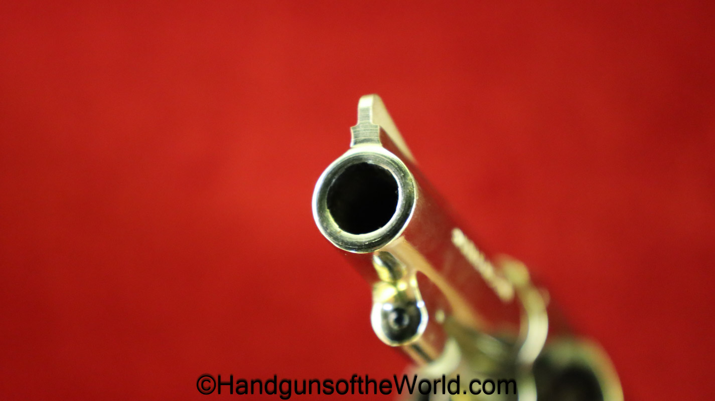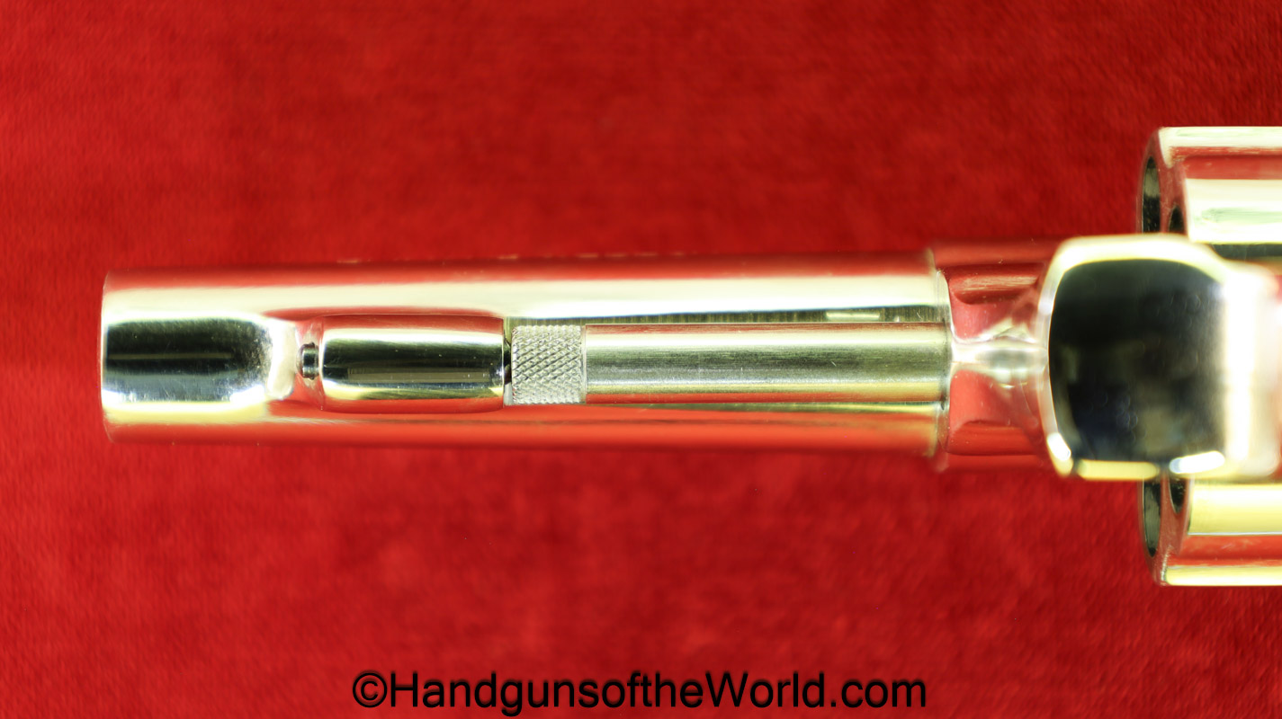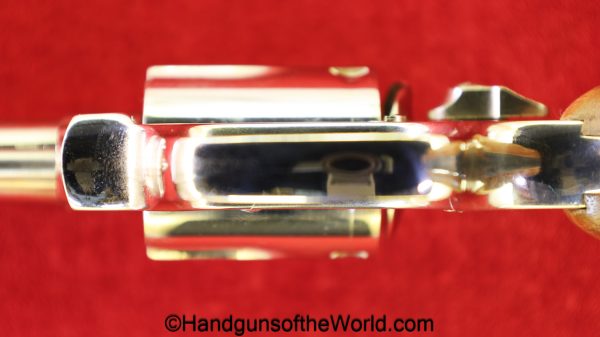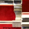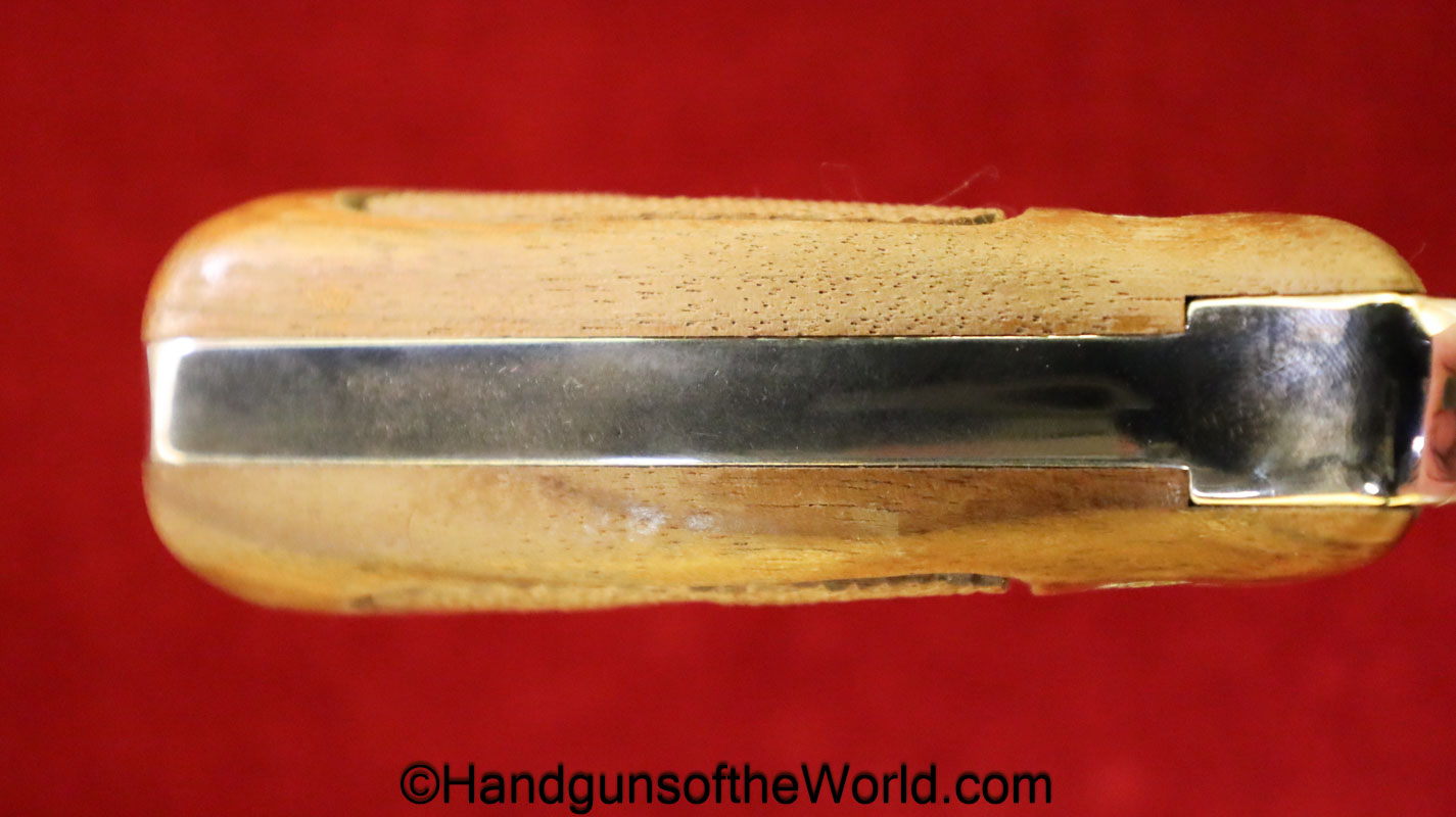 Smith & Wesson Model 36, .38 Special. This has the 3 1/4″ barrel and checkered walnut grips with S&W medallions. 99+% nickel finish remains.