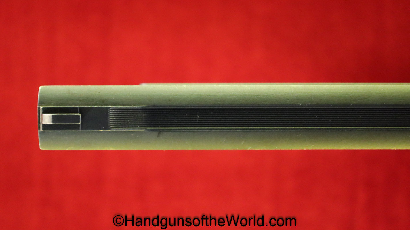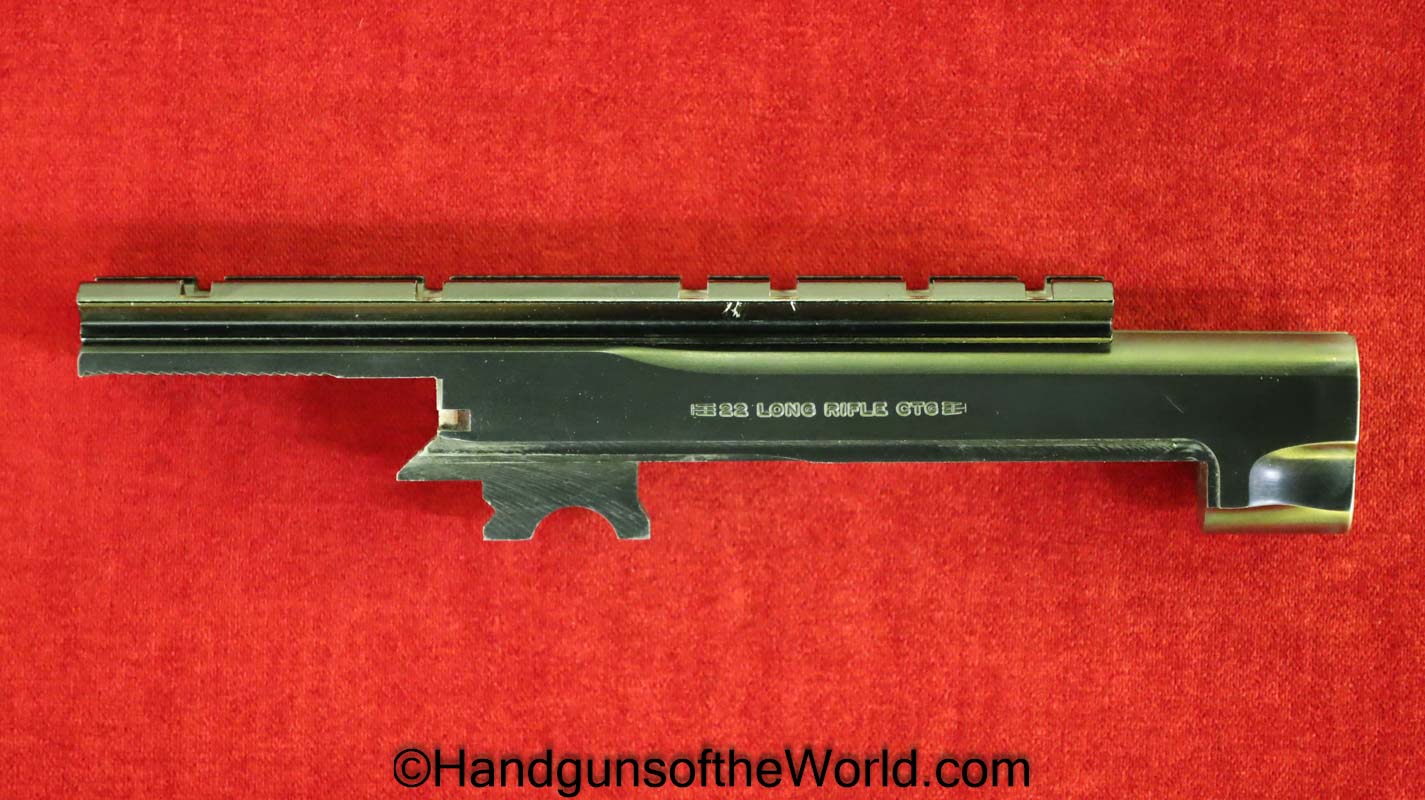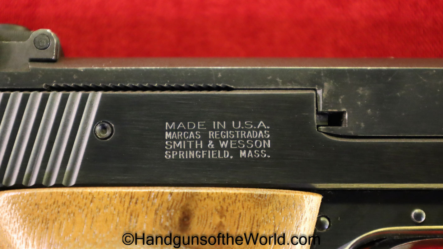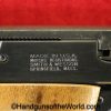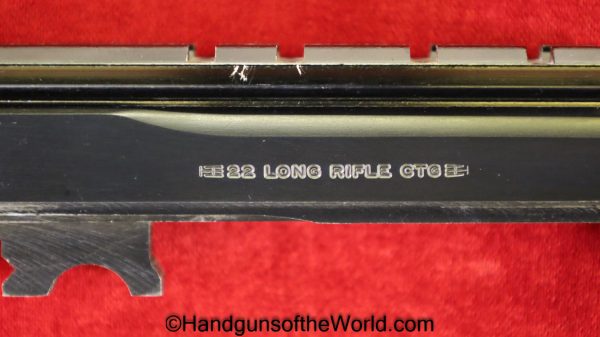 Smith & Wesson Model 41, .22lr. This has a 5 1/2″ barrel and custom adjustable left hand smooth walnut grips. The blue rates about 98% and the bore is excellent. This package includes an extra 5″ barrel to attach the included Blazer 30mm Pistol scope, and extra magazine, about 190 rounds of 22lr, some spare parts and a traveler’s shooting case.