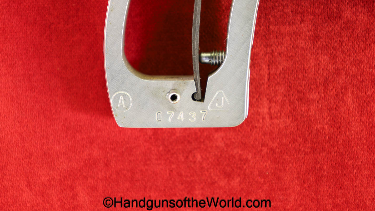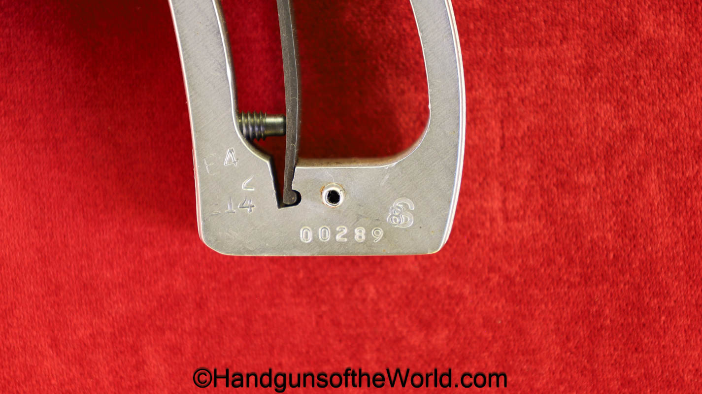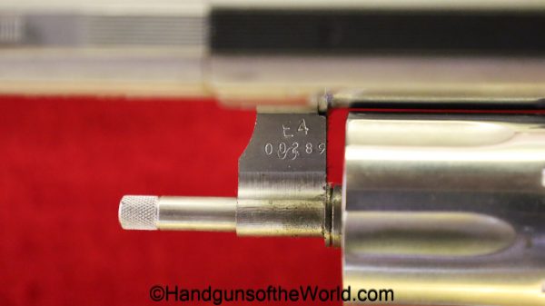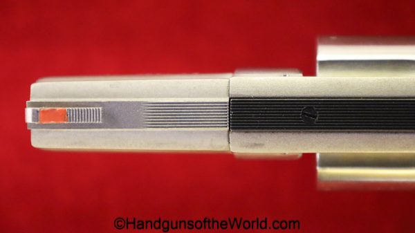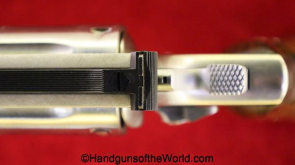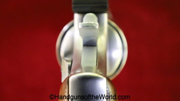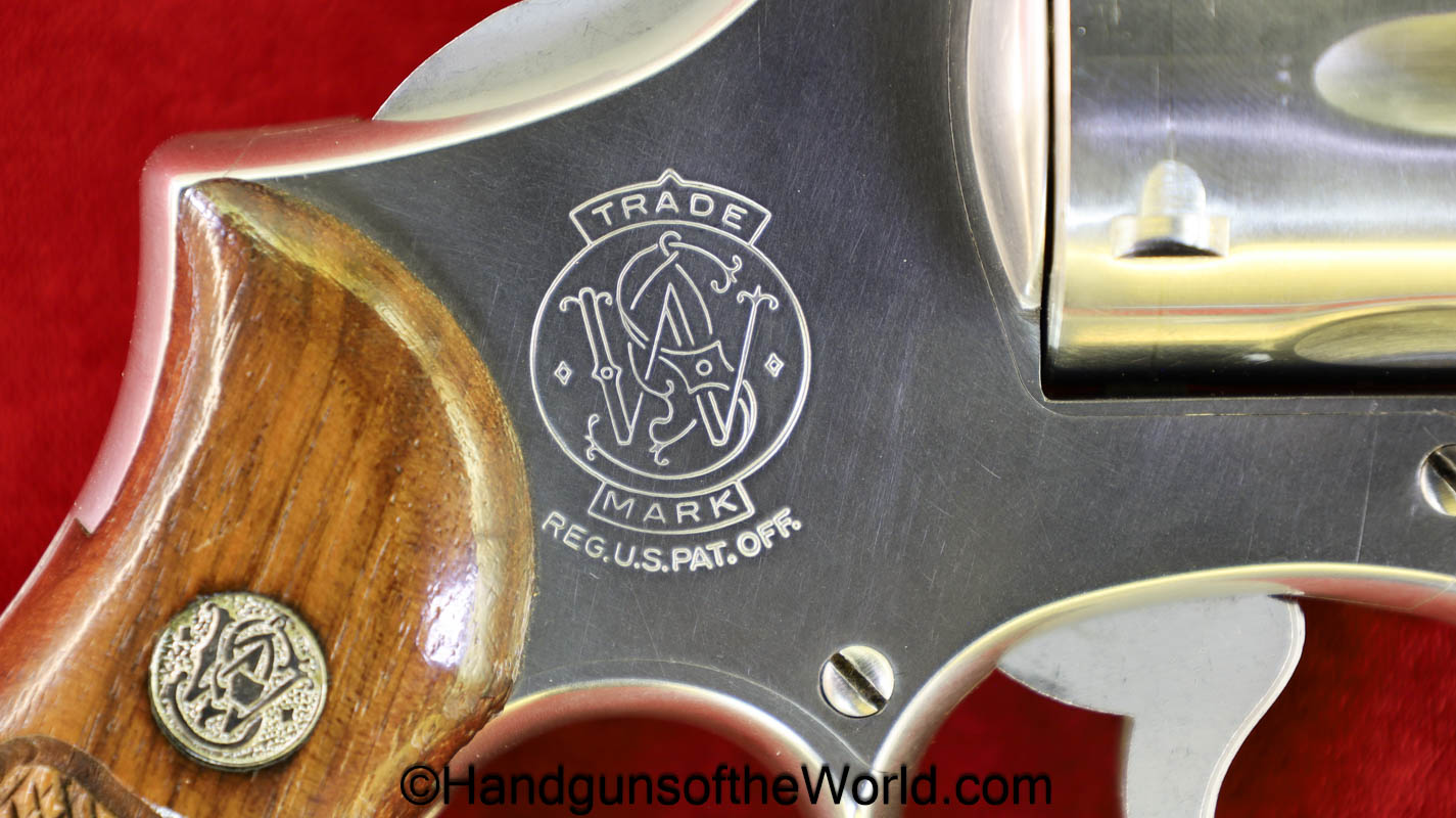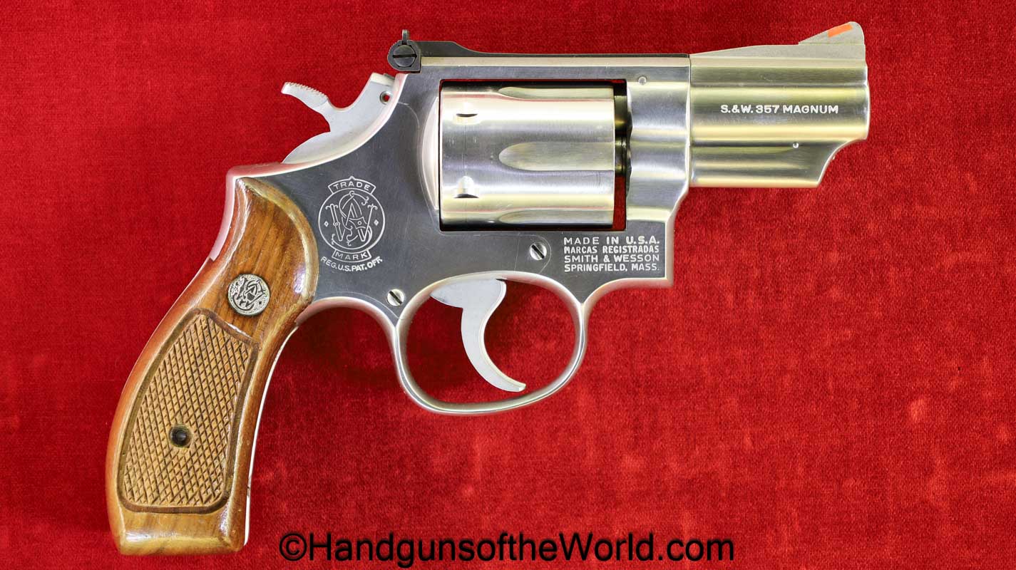 Smith & Wesson Model 66-1, .357 Magnum. This has the round butt, checkered walnut grips with medallions and a 2 1/2″ barrel. The stainless finish is VG++ with an excellent bore.