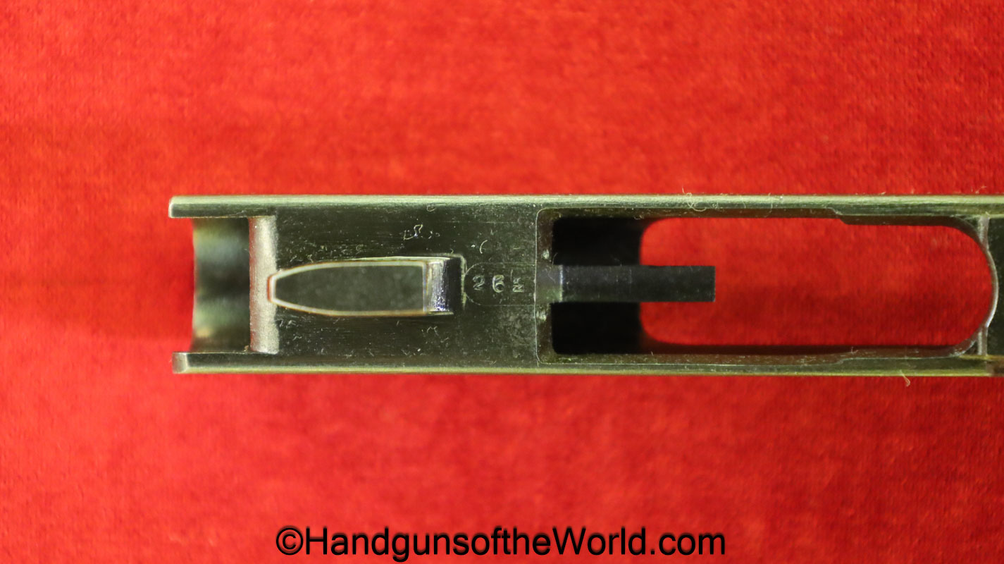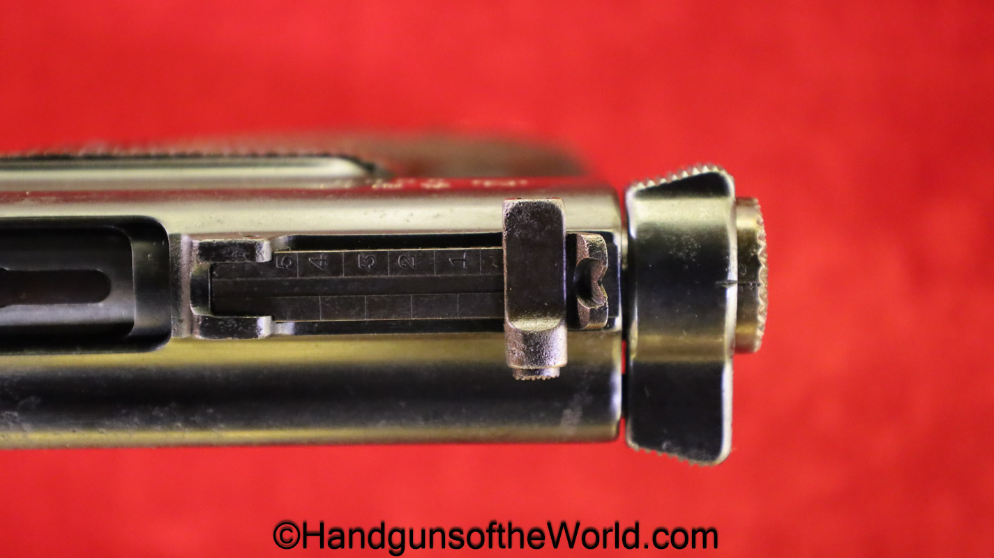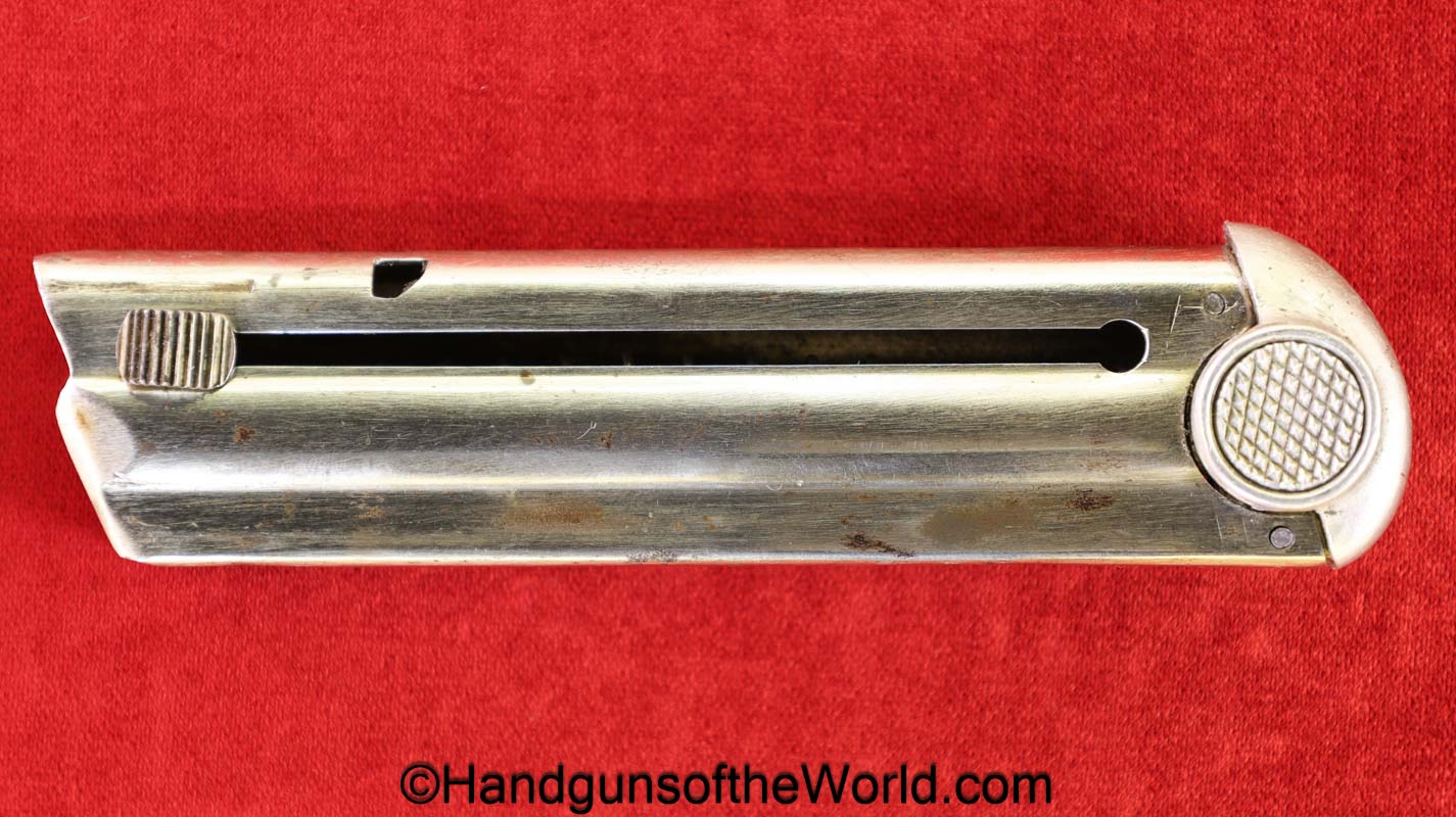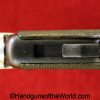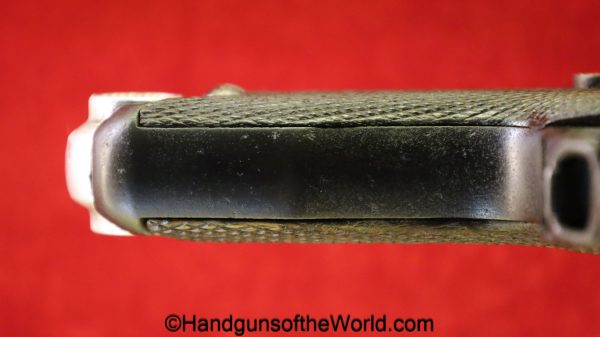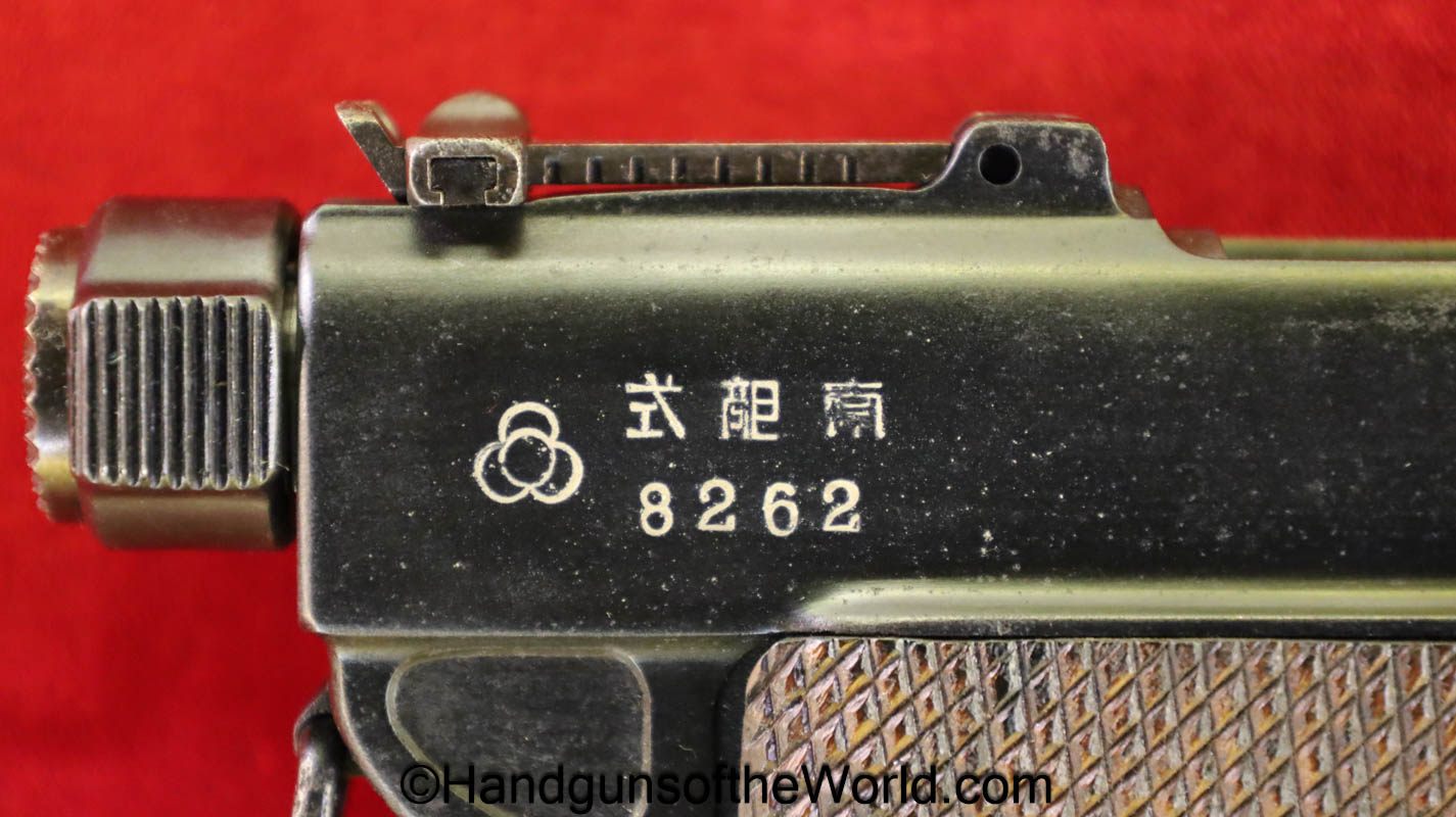 Japanese TGE 1904 Papa Nambu, 8mm. This late variation is Japanese Military proofed on the front grip strap. This has the proper coarse checkered walnut grips. The magazine, while original and not matching, will not hold open the bolt. There are no import marks. This has been restored to match and has about 85% of an arsenal finish and the bore is G-VG.