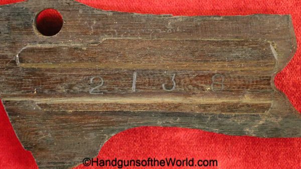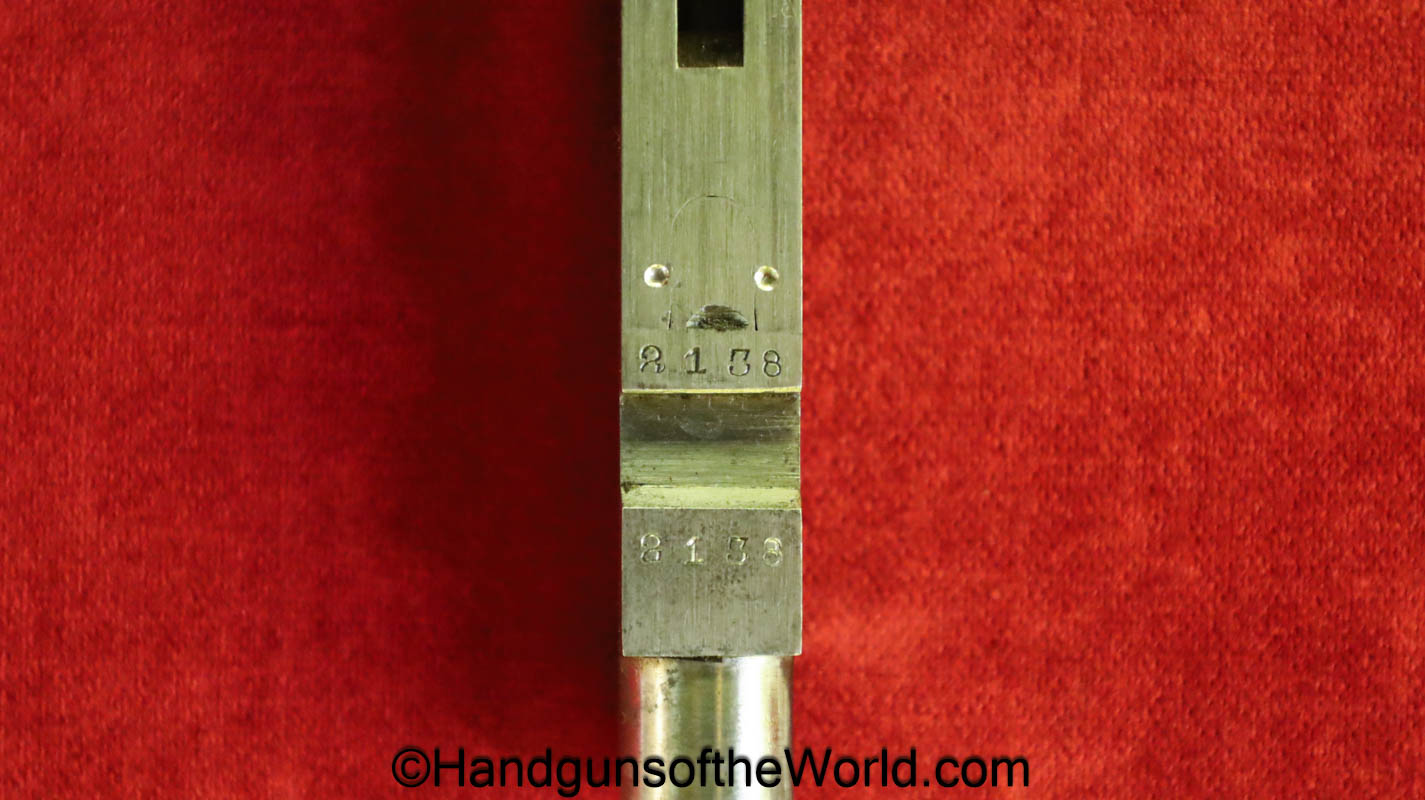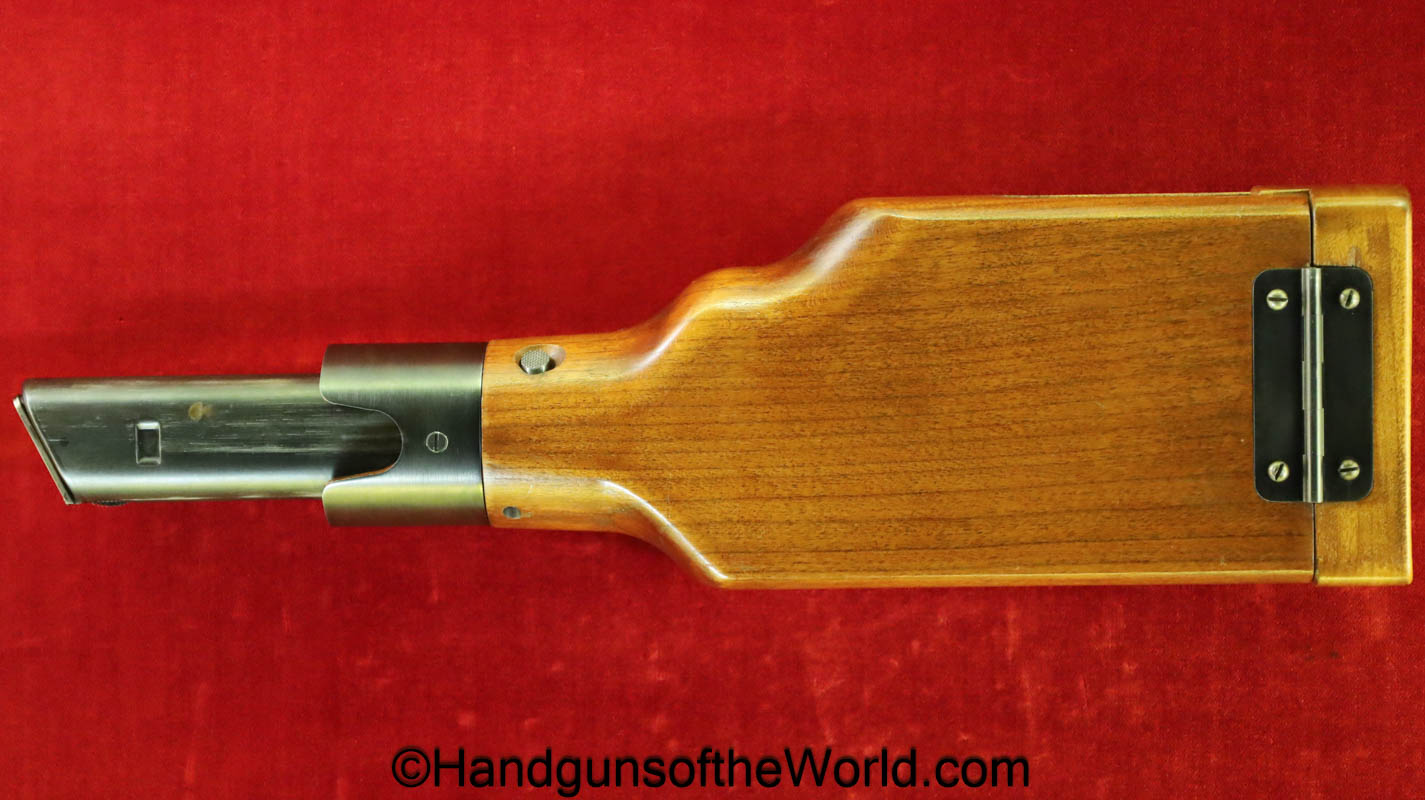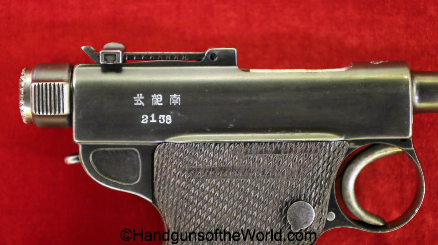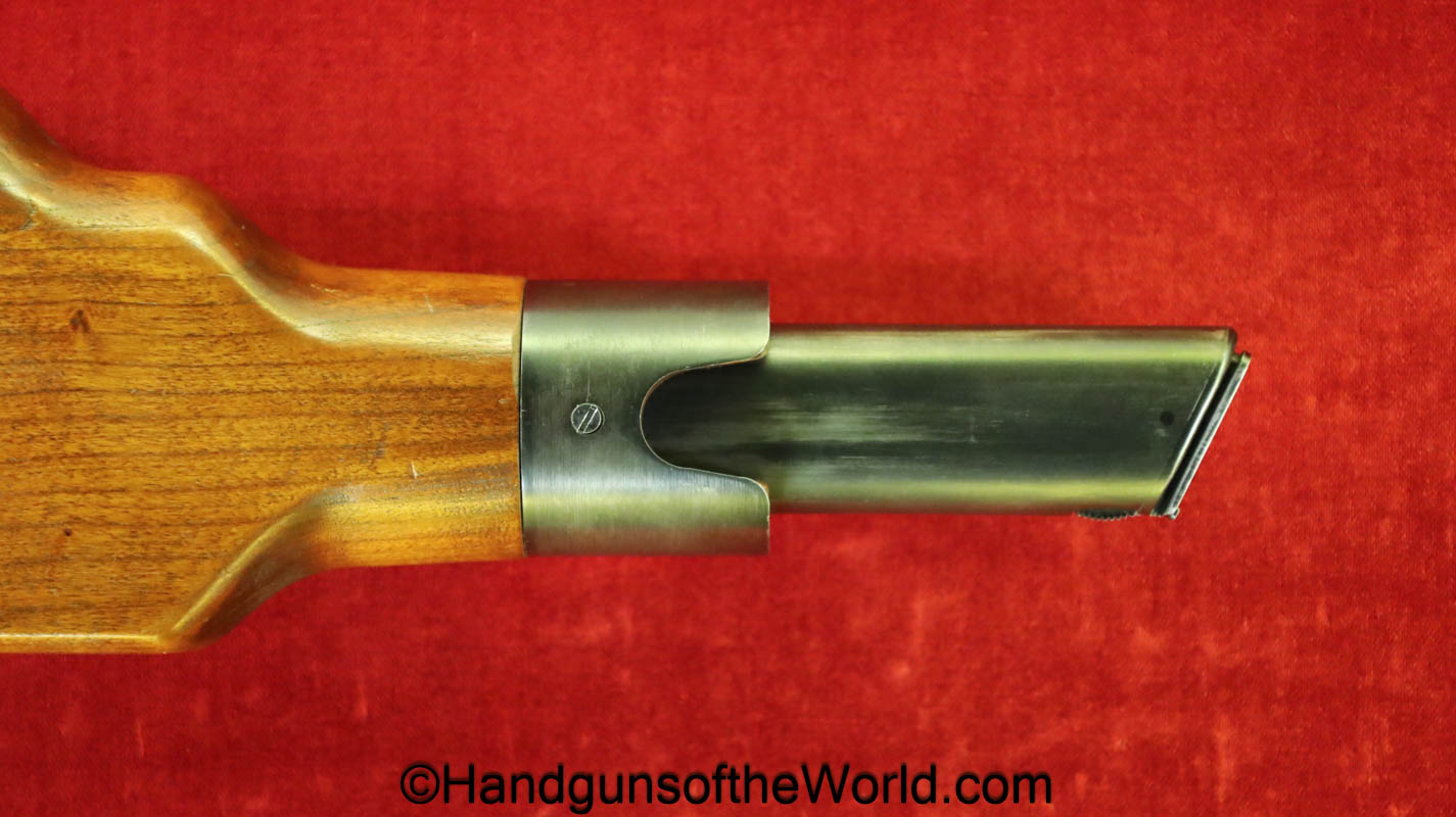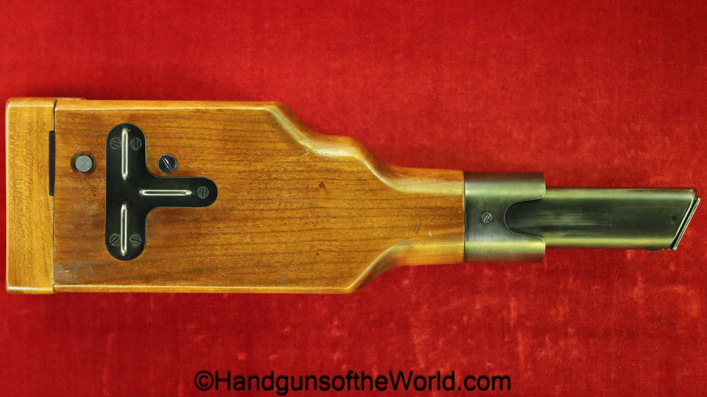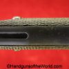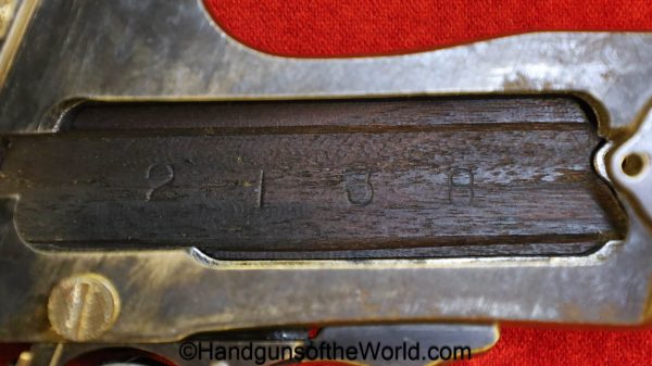 Tokyo Arsenal 1902 Grandpa Nambu, 8mm. This is Japanese Military proofed on the front strap, and has proper checkered walnut grips. This has all matching numbers but for the correct wooden base magazine. This retains about 90% thinning blue and the bore is excellent. There are no importer markings on this one. This comes with a fantastic recreation of the original wooden holster shoulder stock and a cleaning rod.