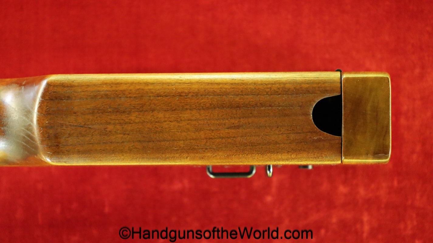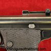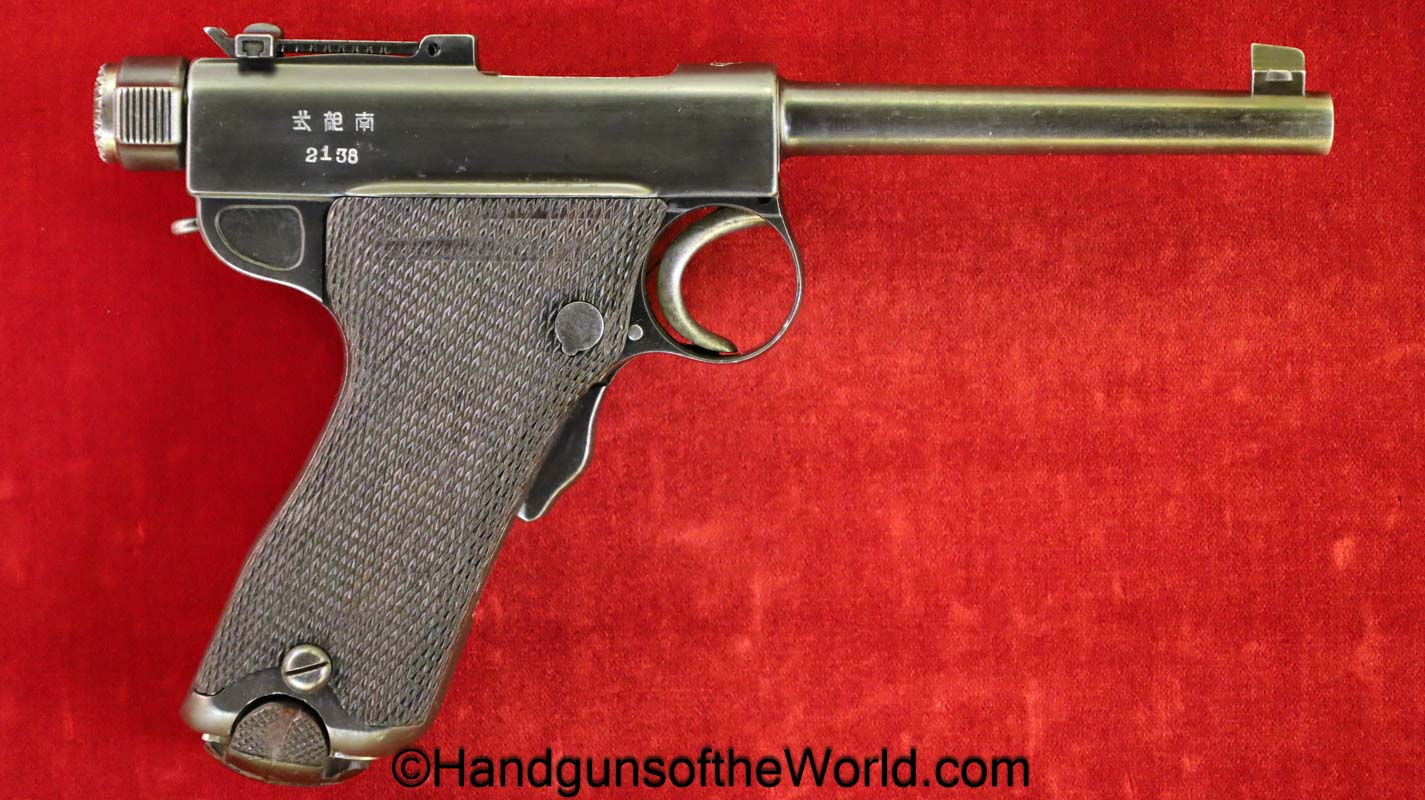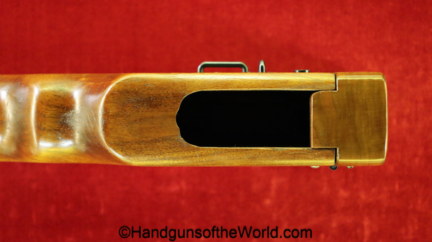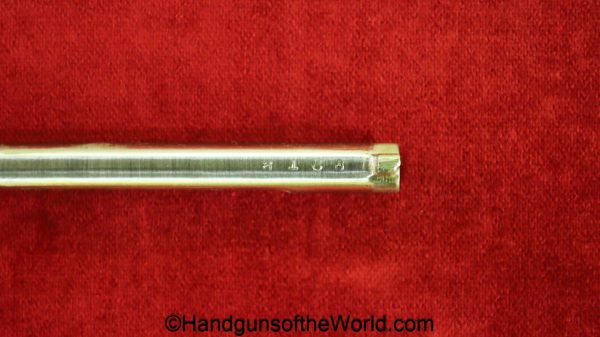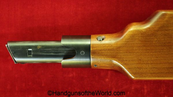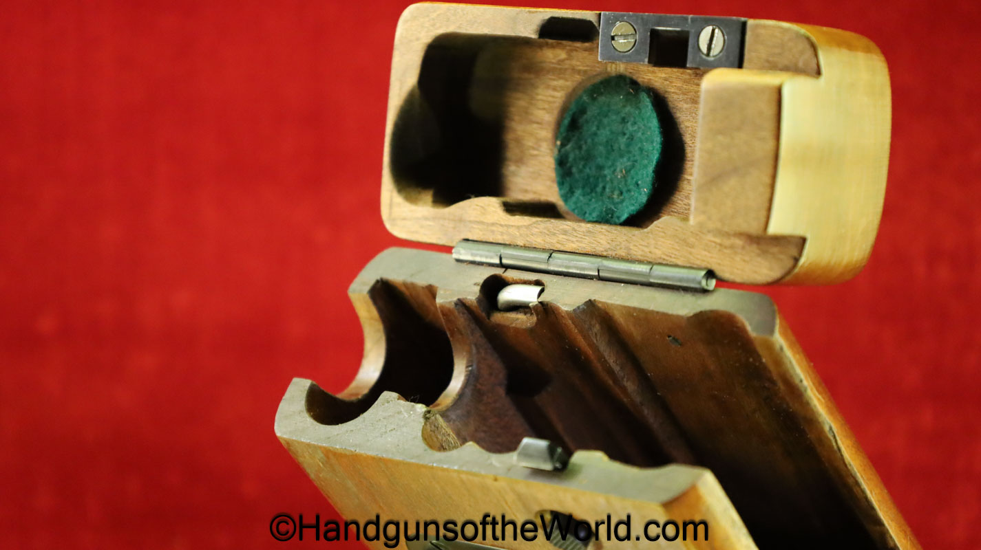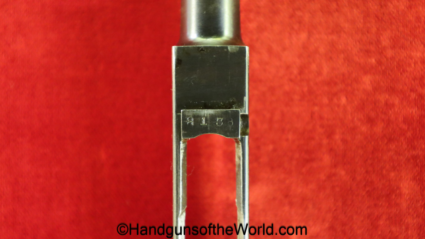 Tokyo Arsenal 1902 Grandpa Nambu, 8mm. This is Japanese Military proofed on the front strap, and has proper checkered walnut grips. This has all matching numbers but for the correct wooden base magazine. This retains about 90% thinning blue and the bore is excellent. There are no importer markings on this one. This comes with a fantastic recreation of the original wooden holster shoulder stock and a cleaning rod.