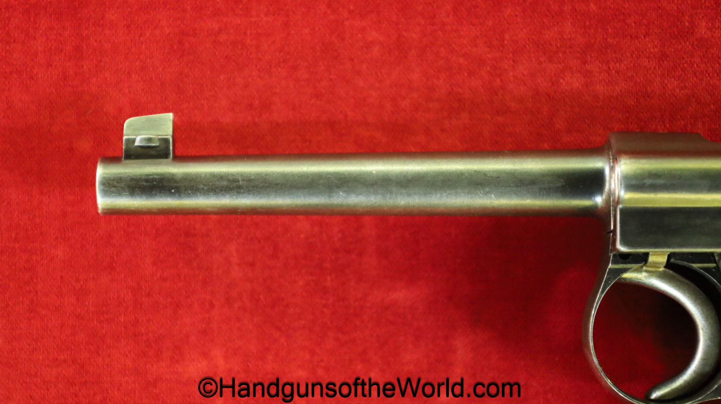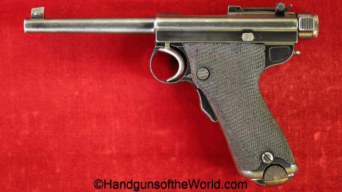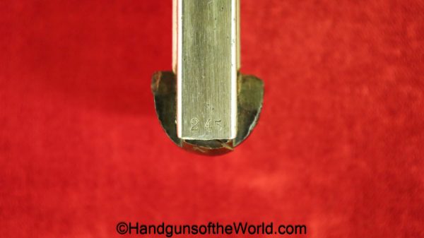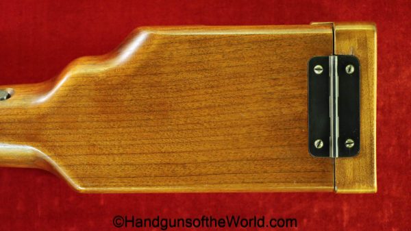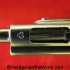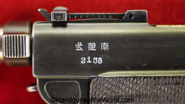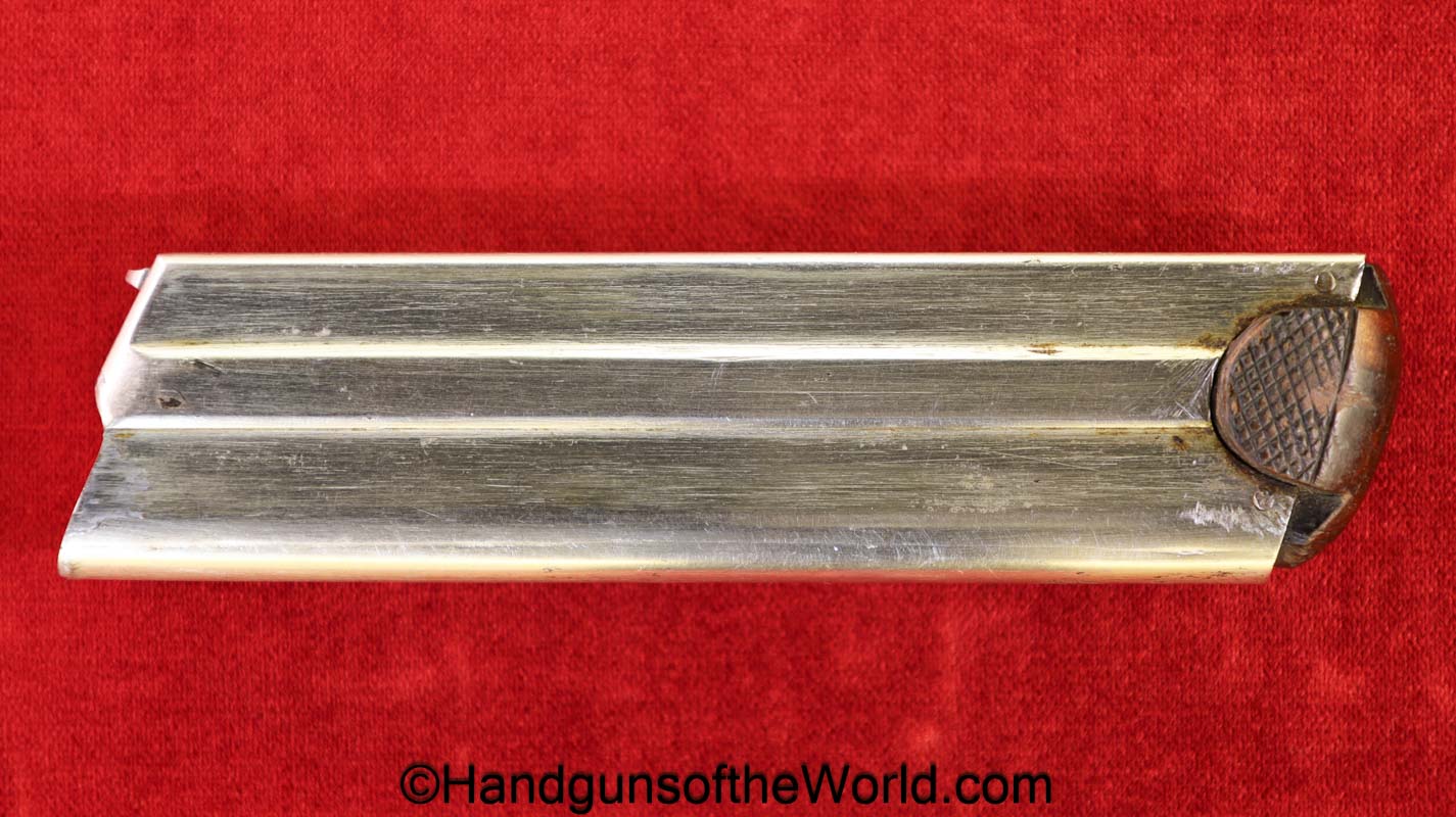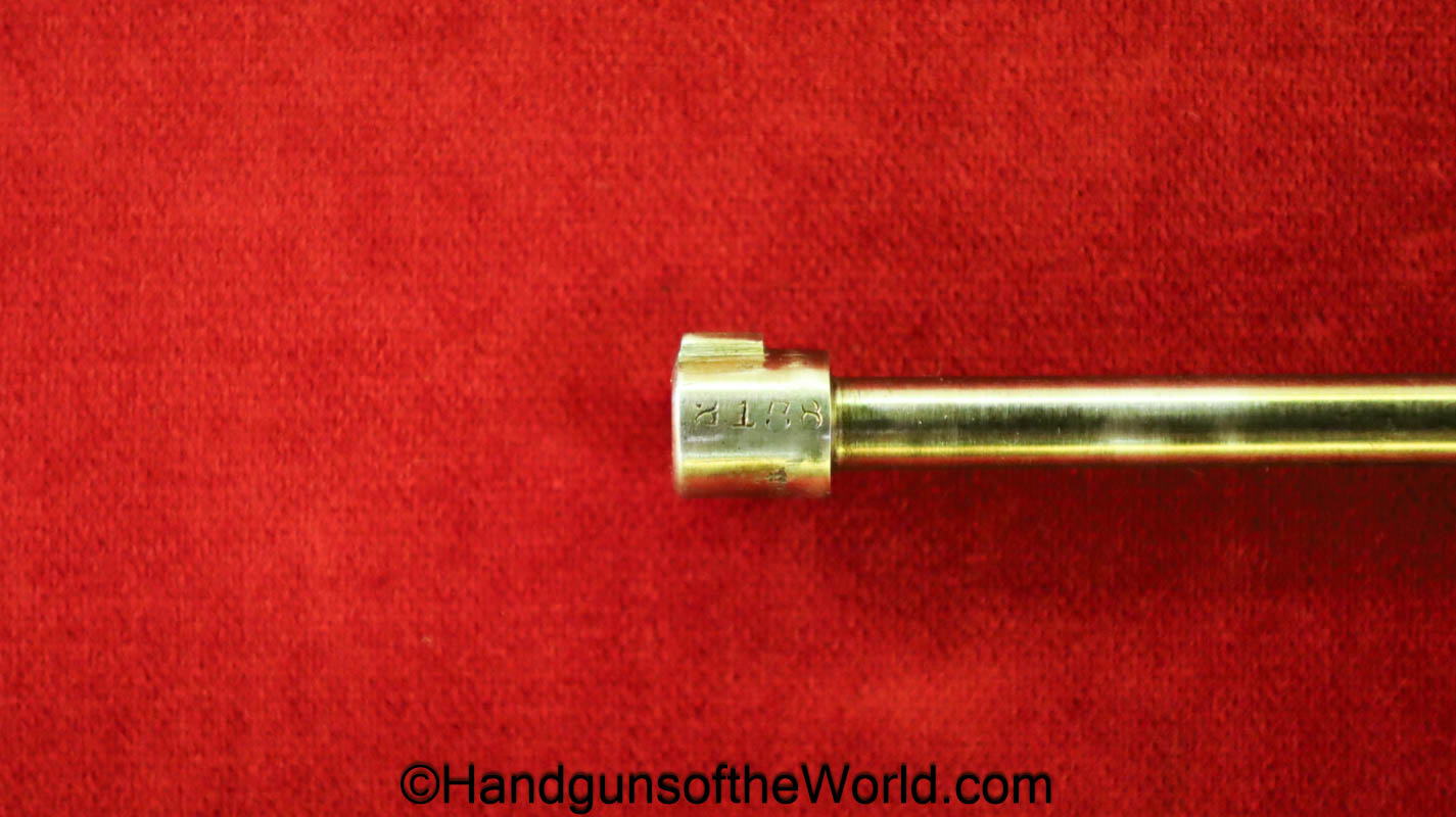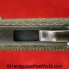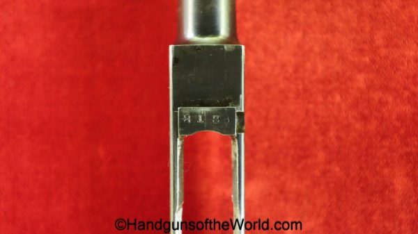 Tokyo Arsenal 1902 Grandpa Nambu, 8mm. This is Japanese Military proofed on the front strap, and has proper checkered walnut grips. This has all matching numbers but for the correct wooden base magazine. This retains about 90% thinning blue and the bore is excellent. There are no importer markings on this one. This comes with a fantastic recreation of the original wooden holster shoulder stock and a cleaning rod.