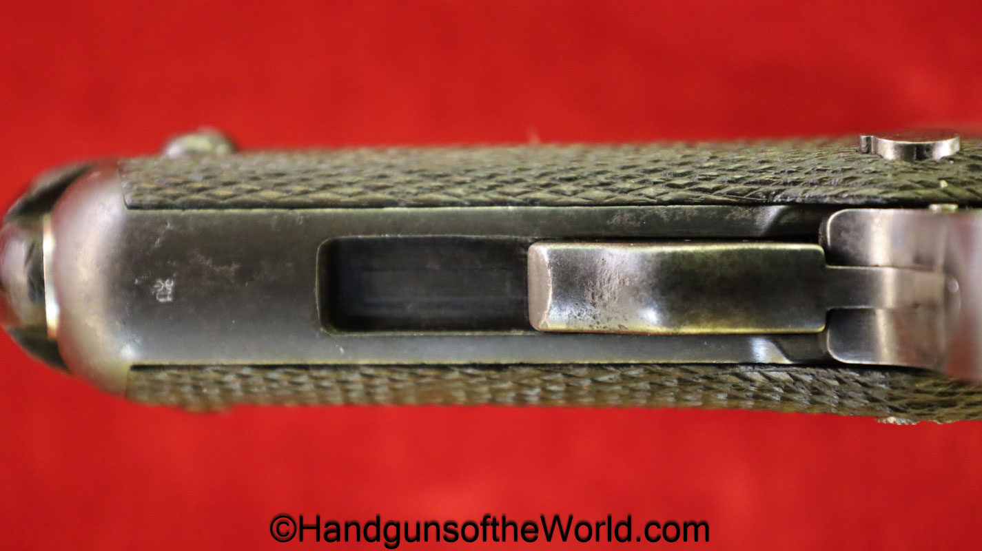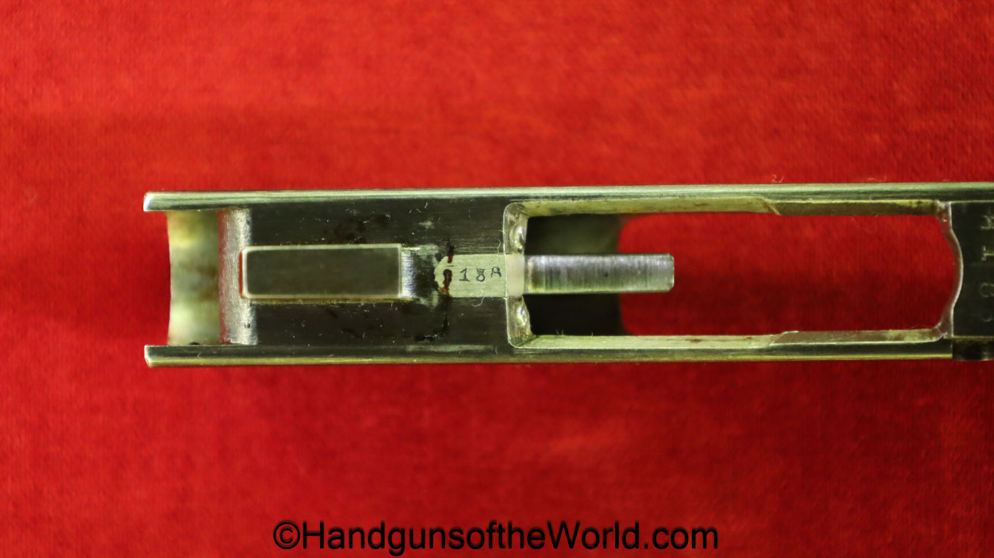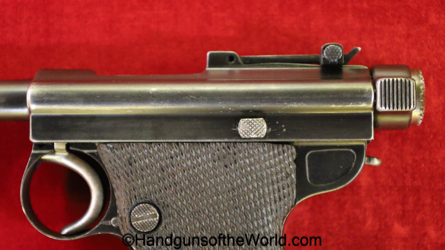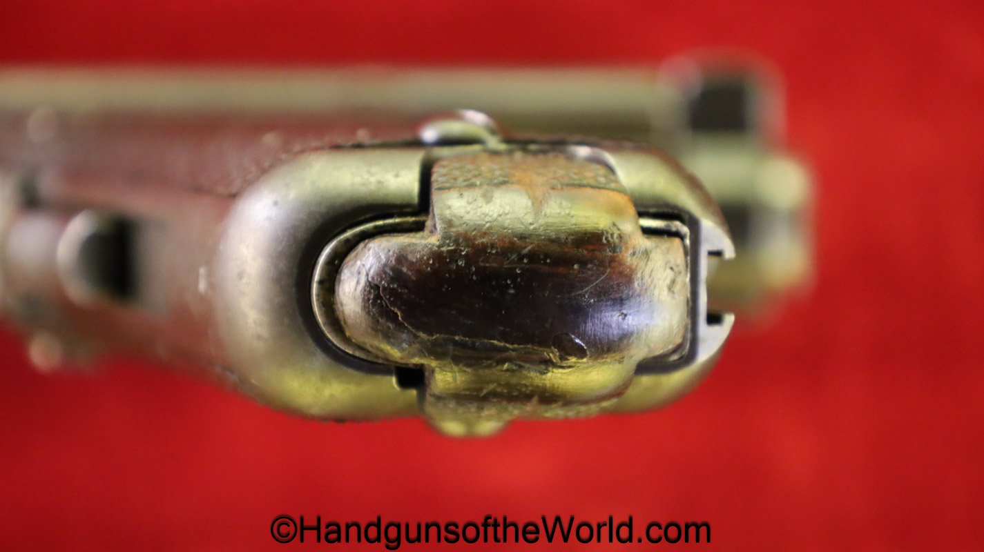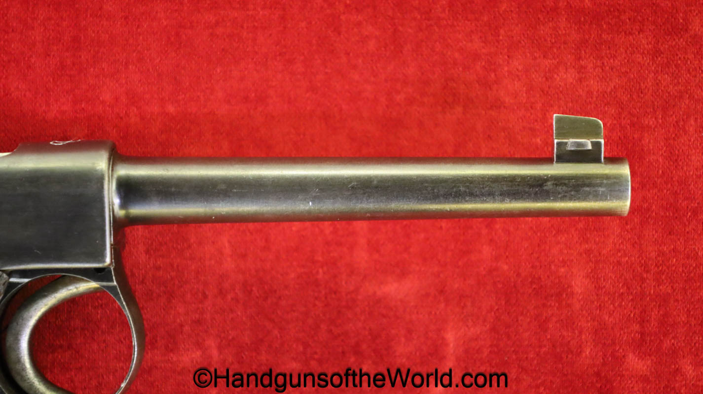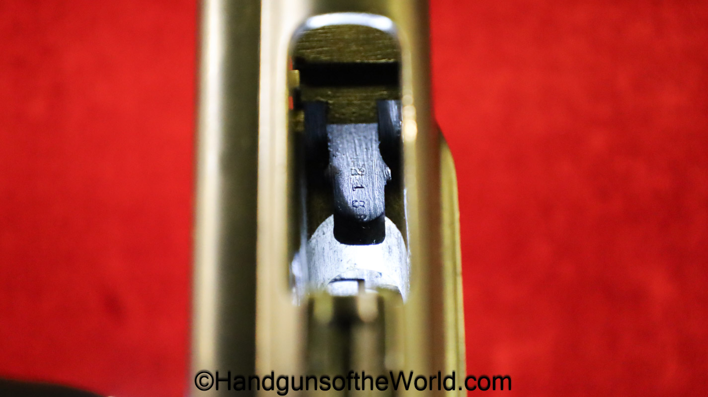 Tokyo Arsenal 1902 Grandpa Nambu, 8mm. This is Japanese Military proofed on the front strap, and has proper checkered walnut grips. This has all matching numbers but for the correct wooden base magazine. This retains about 90% thinning blue and the bore is excellent. There are no importer markings on this one. This comes with a fantastic recreation of the original wooden holster shoulder stock and a cleaning rod.