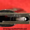 The Unique Model 16, 7.65mm, is German WWII WaA251 proofed on the right rear tang and features the correct black Bakelite grips. This later variant comes with a flat magazine release, matching internal assembly numbers, about 97% original blue finish, and an excellent bore.