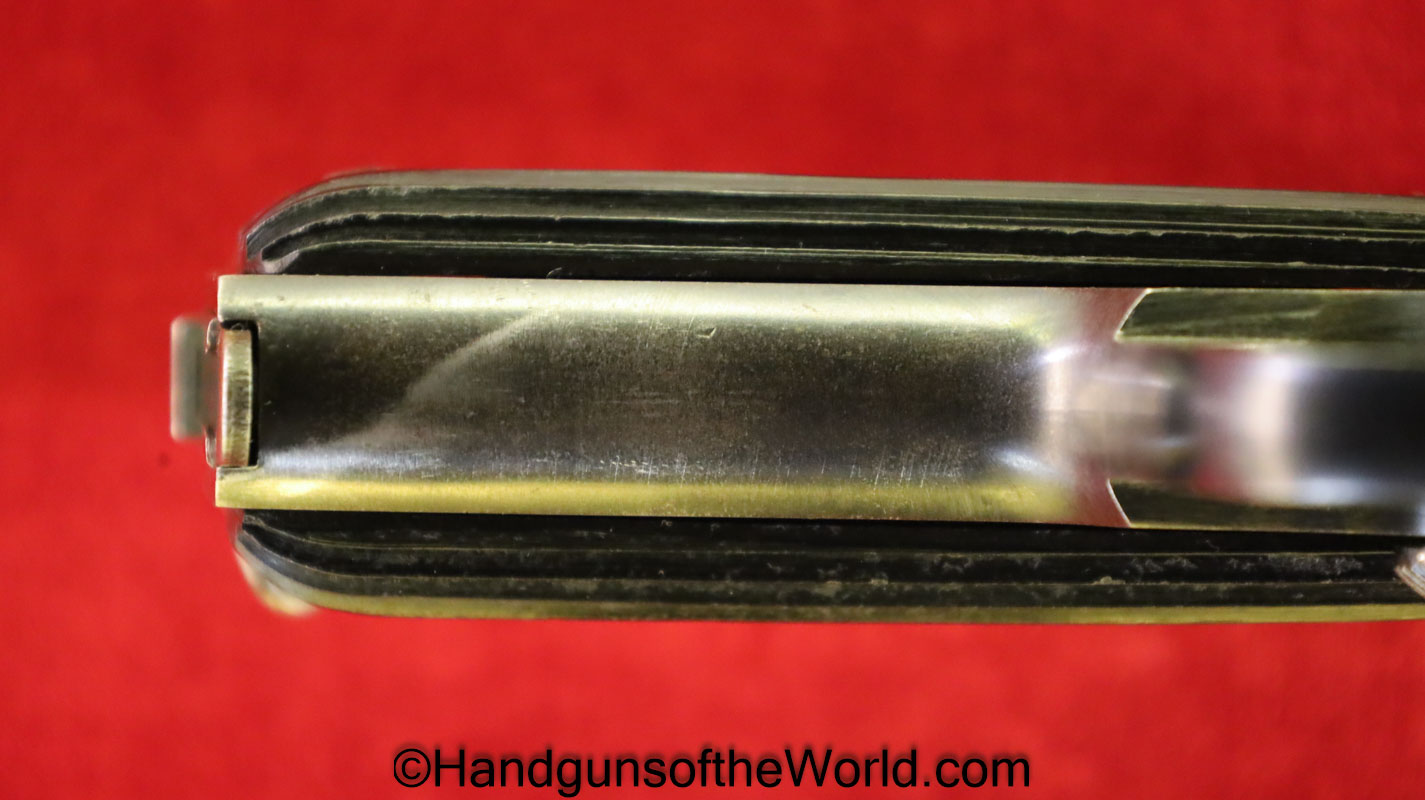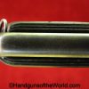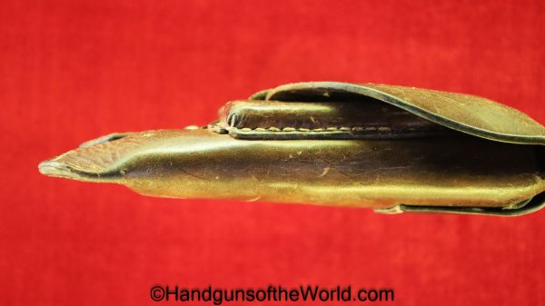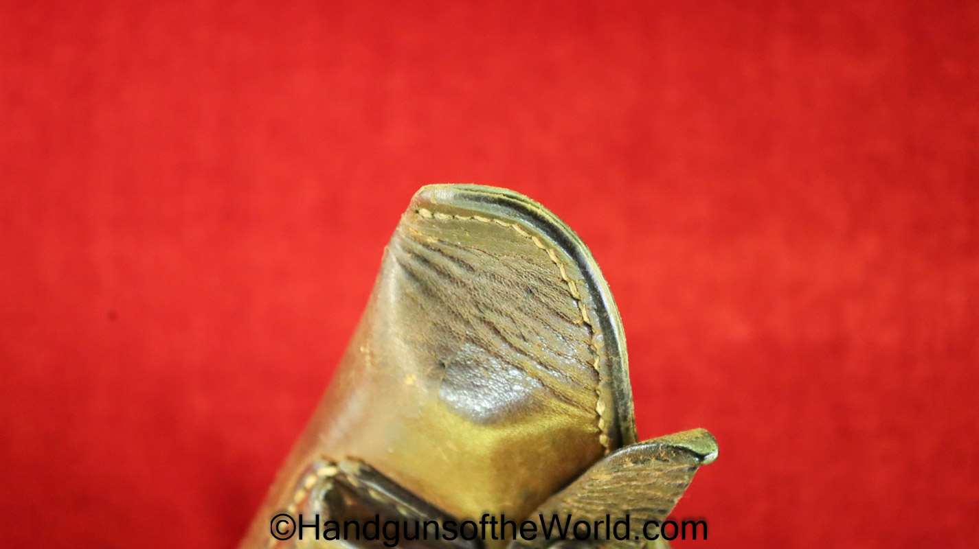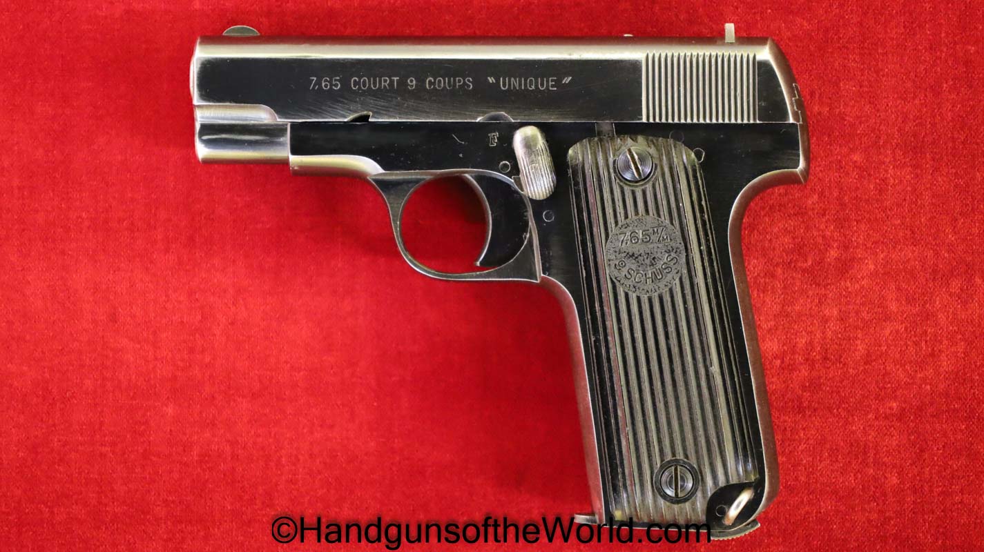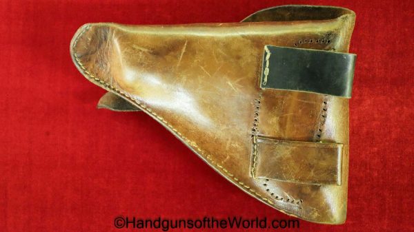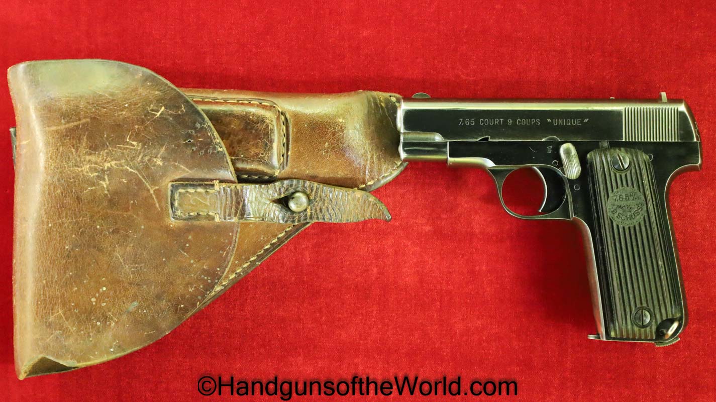 Unique Model 17, 7.65mm. This is German WWII WaA251 proofed on the right rear tang and has the 9 Schuss marked lined black Bakelite grips-The right shows a nick on the bottom. This variation has the single line slide address. The blue rates strongly at 97% and the bore is excellent. An arsenal altered, brown leather French 1892 Revolver holster is included.