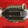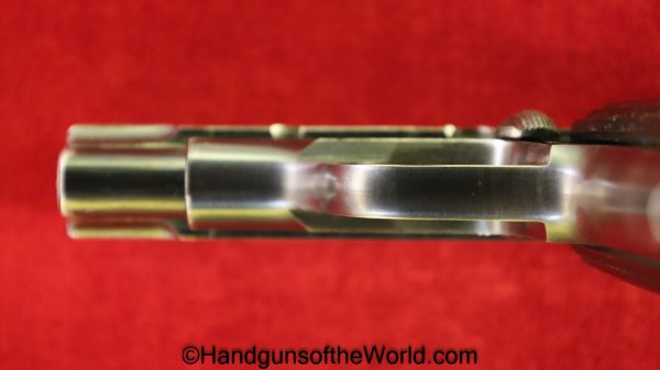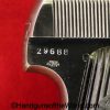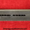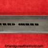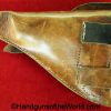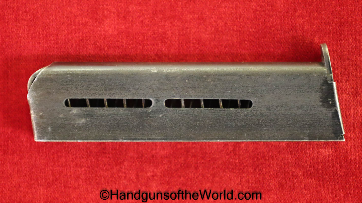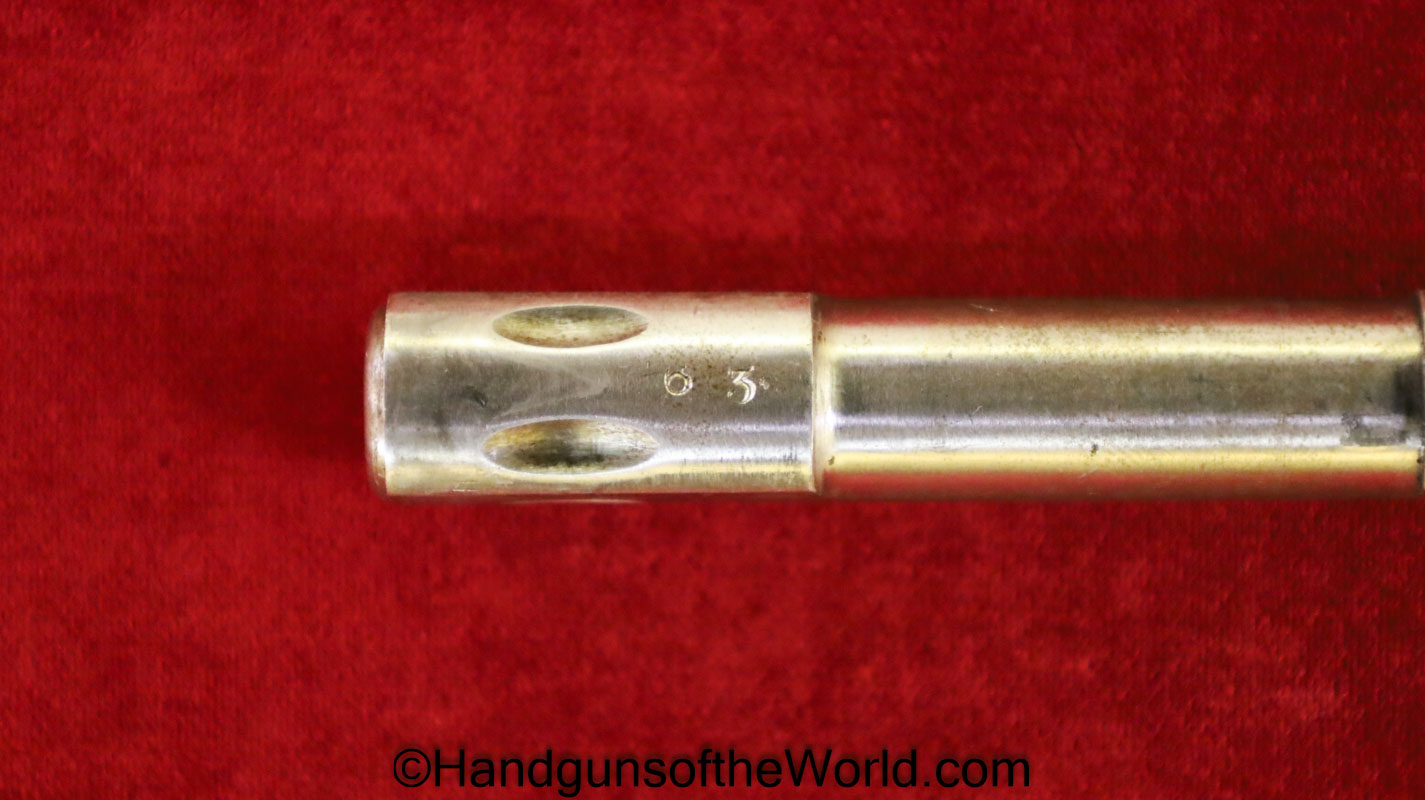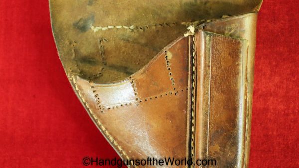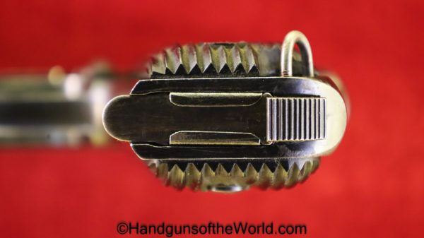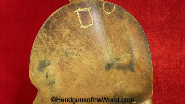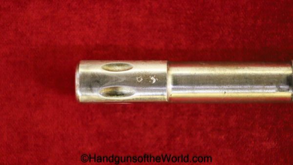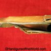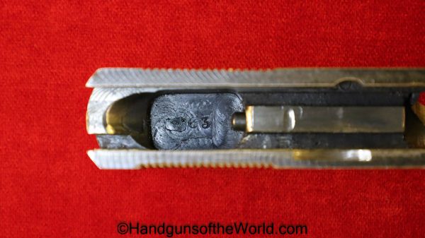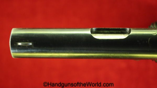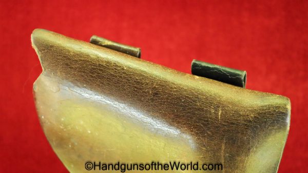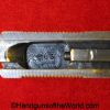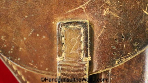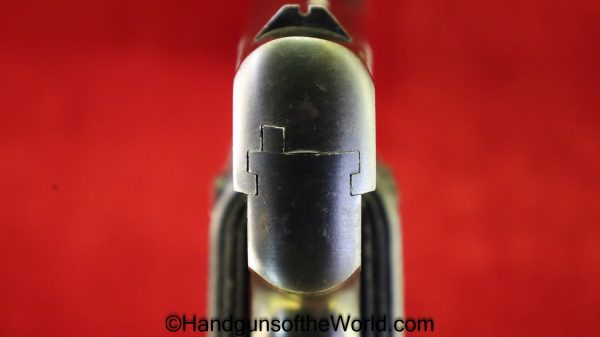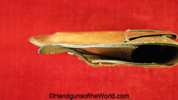 Unique Model 17, 7.65mm. This is German WWII WaA251 proofed on the right rear tang and has the 9 Schuss marked lined black Bakelite grips-The right shows a nick on the bottom. This variation has the single line slide address. The blue rates strongly at 97% and the bore is excellent. An arsenal altered, brown leather French 1892 Revolver holster is included.
