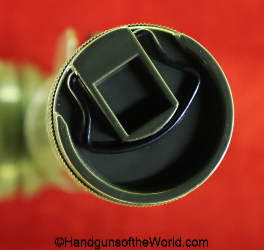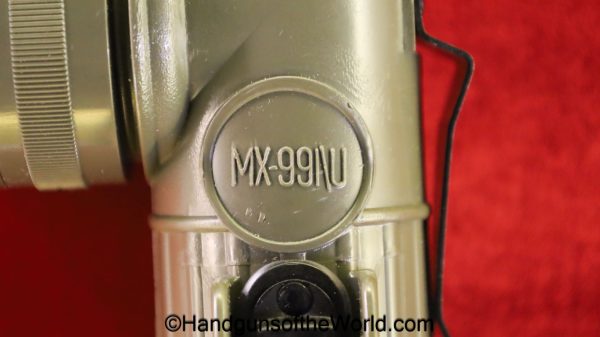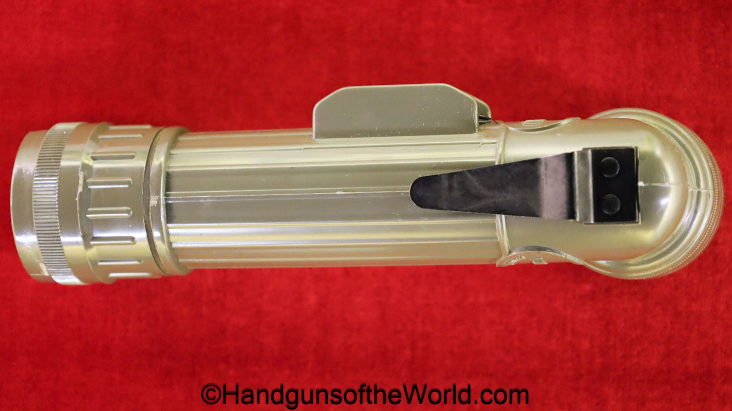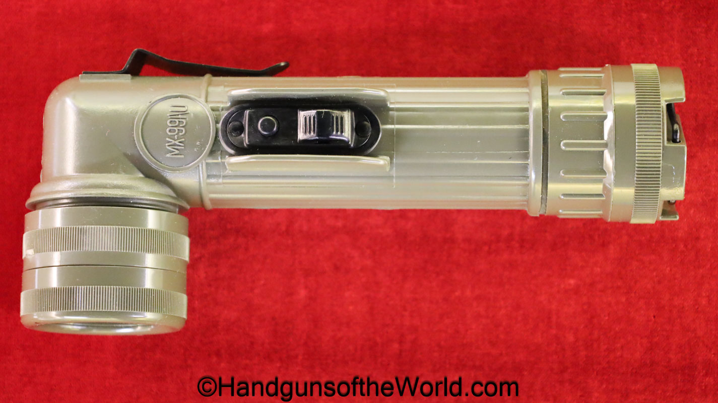 US Military Flashlight, Model MX-991/U. This is green plastic with a black belt clip. Like new in the original box. No batteries included.