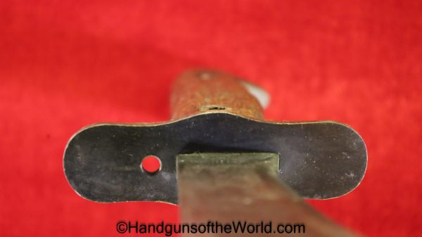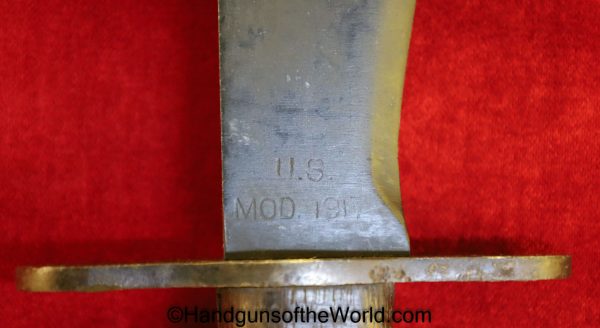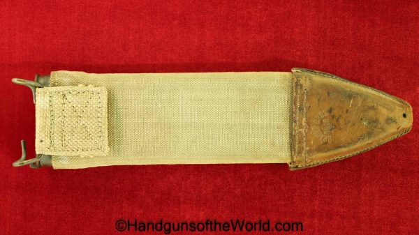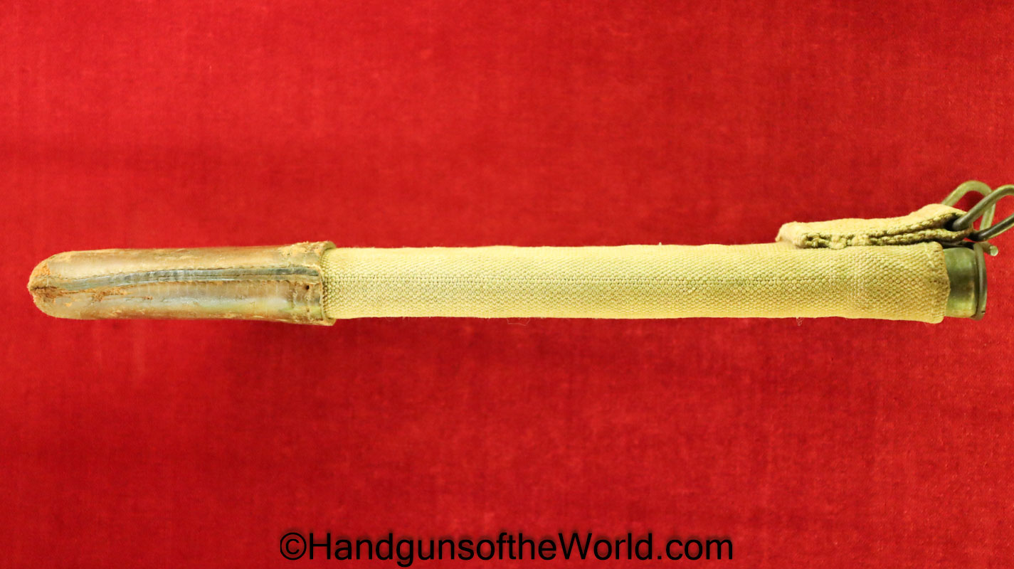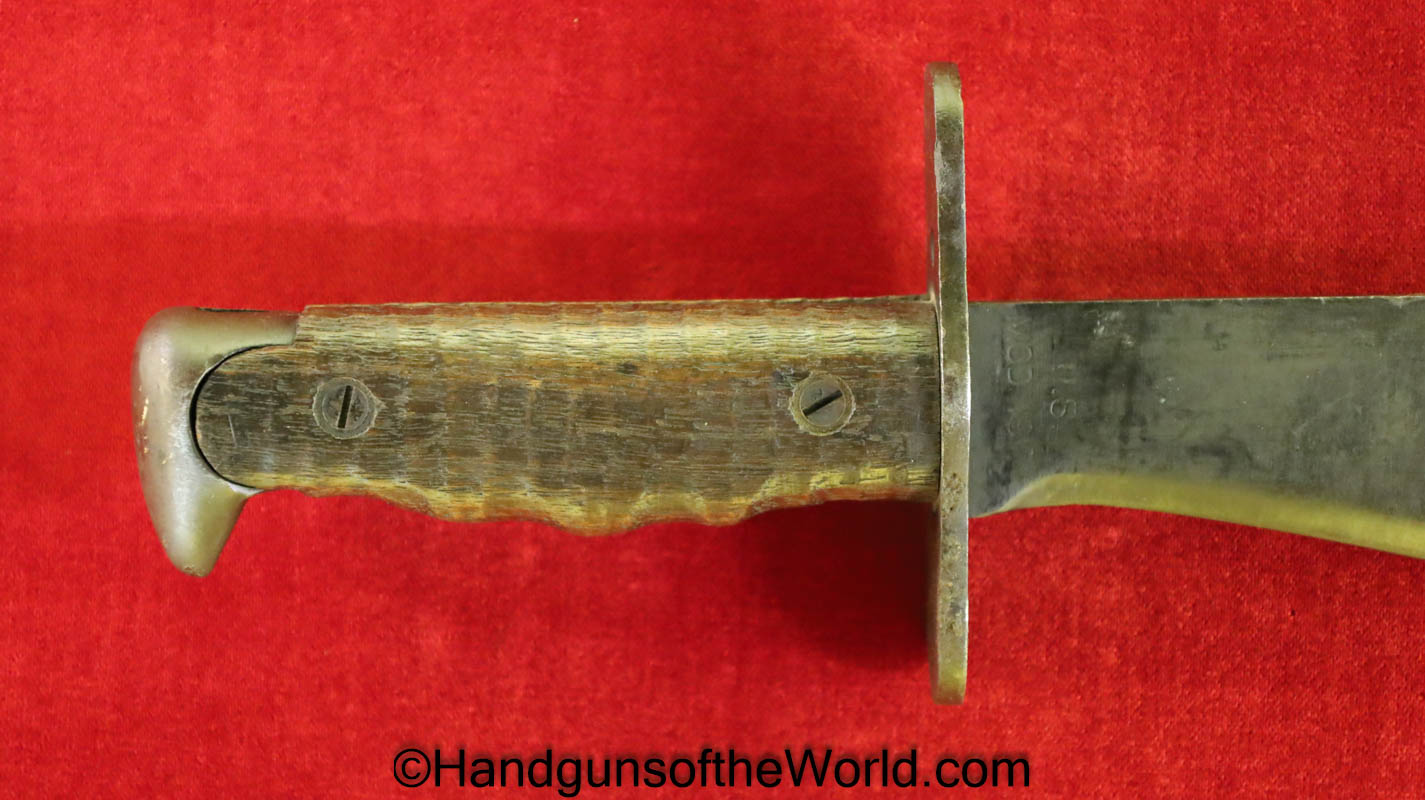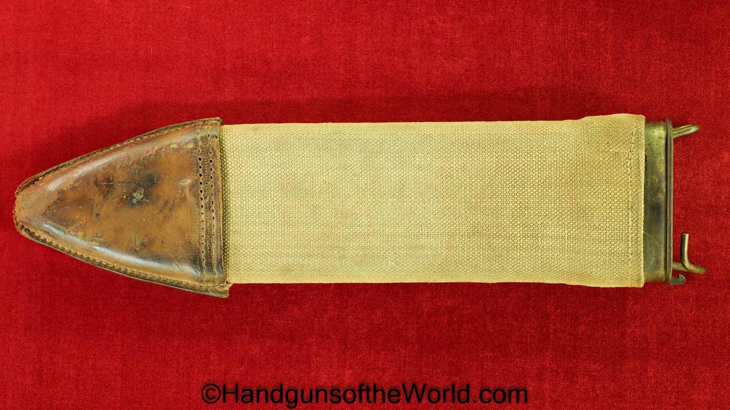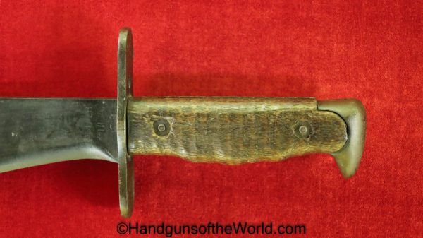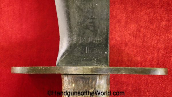 Original US Model 1917 Bolo marked Plumb-Phila 1918 on the blade. This has a nice walnut handle and comes with its proper tan canvas covered scabbard marked Brauer Bros-1918. Overall VG+.