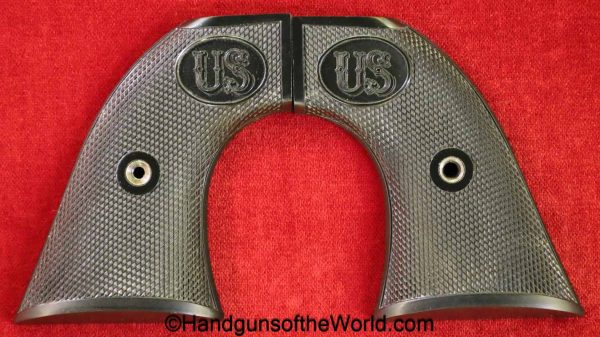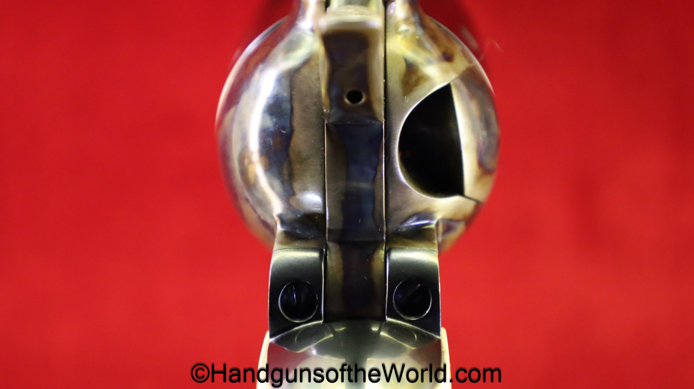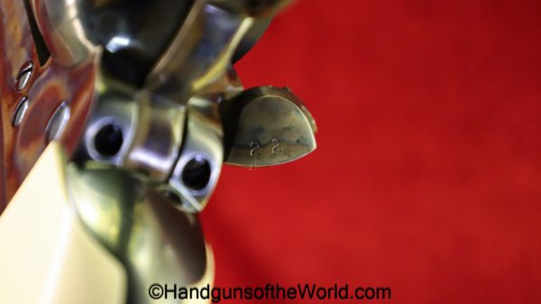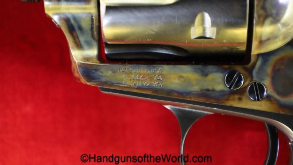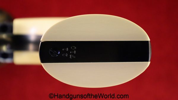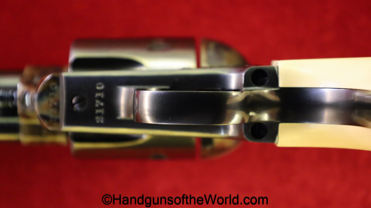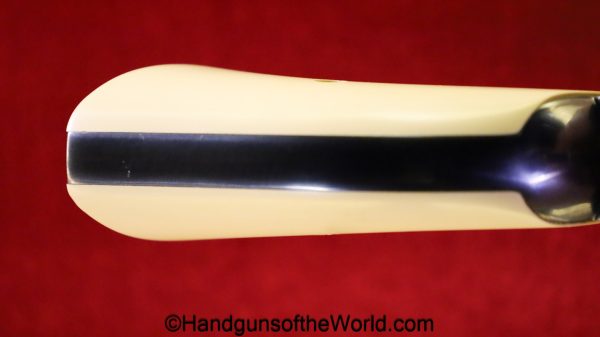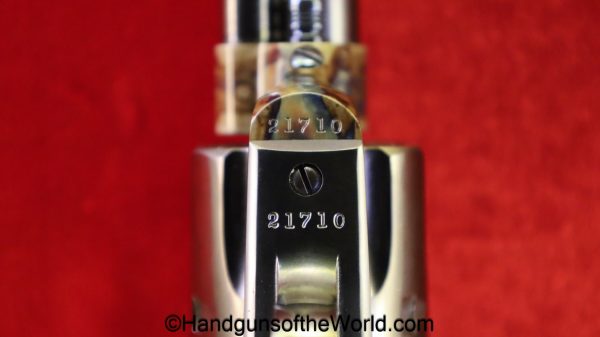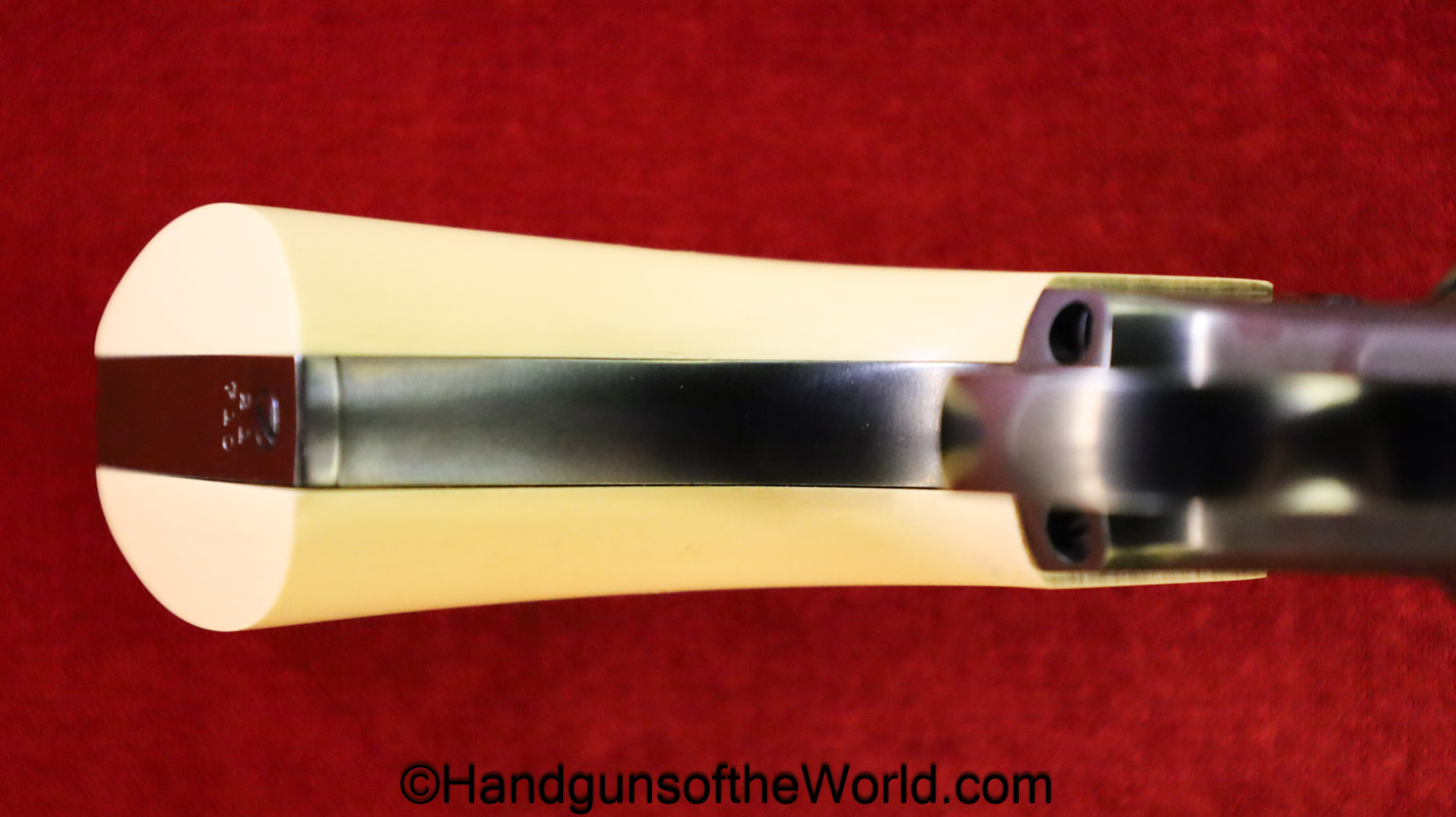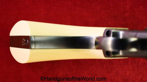 USFA Mfg. Co Single Action Army, .45 Colt. This has the 4 3/4″ barrel and updated smooth Micarta=Ivorylike grips. This has a case-hardened frame with the remainer a nice blue finish. This retains 99+% blue and the bore is Mint. A well-made custom Walnut case with green velvet lining is included, along with the original black plastic grips.