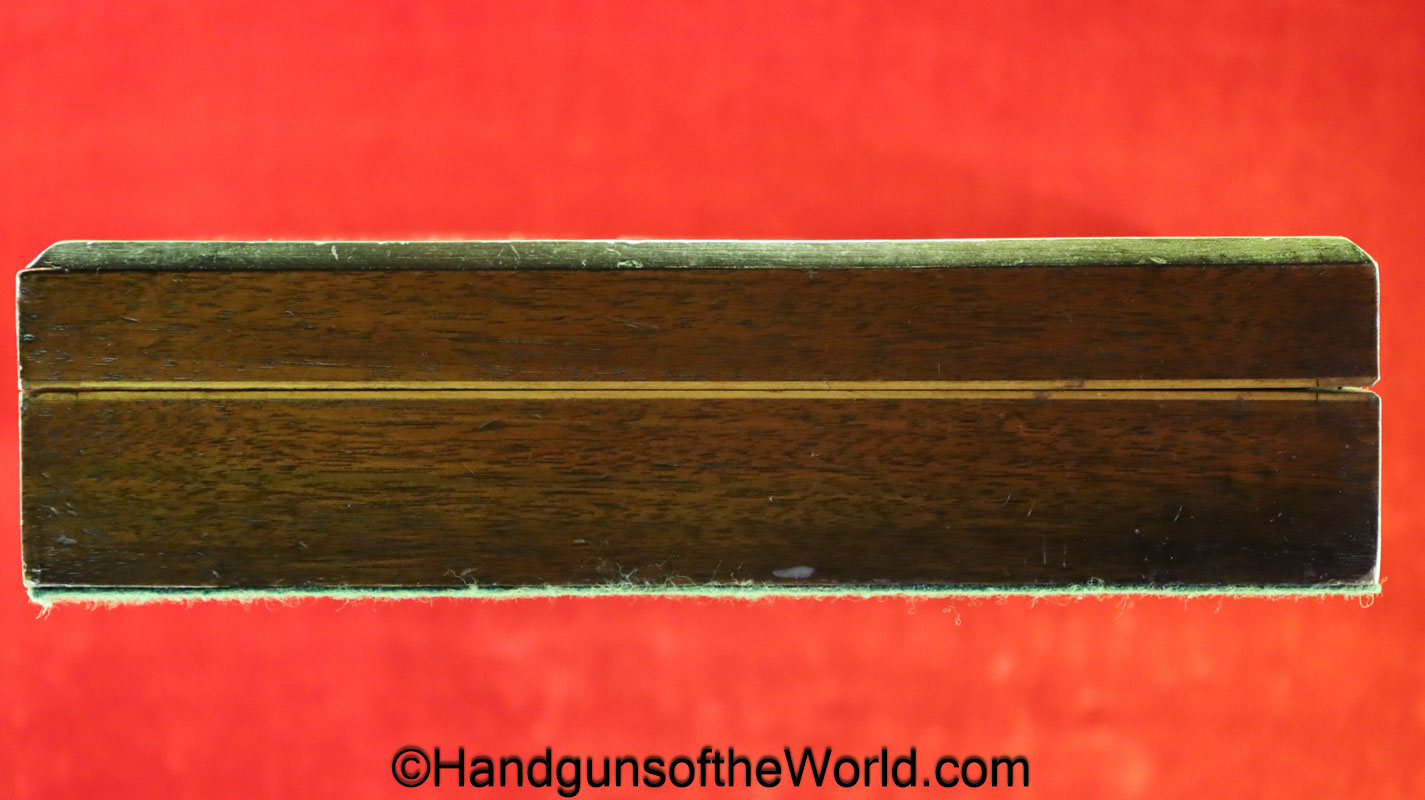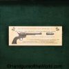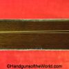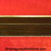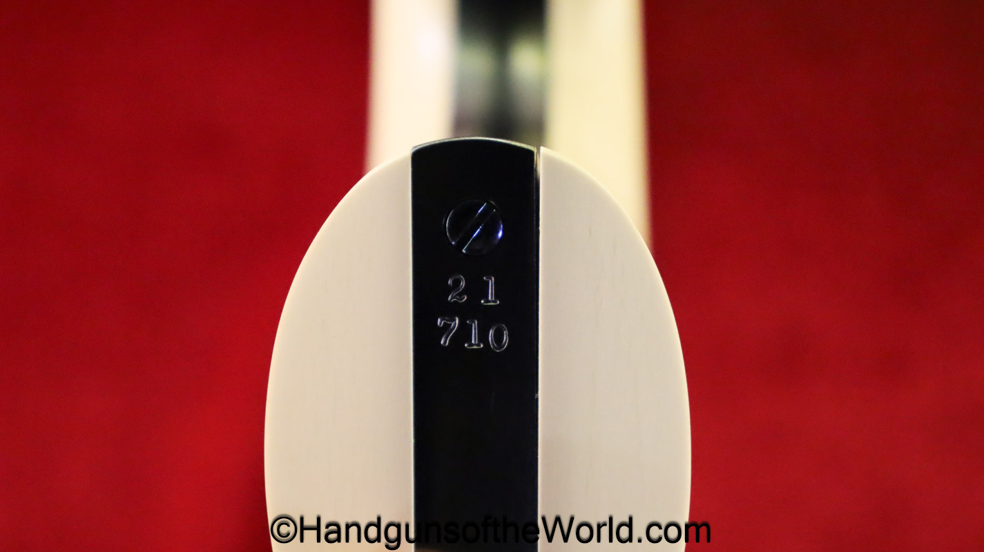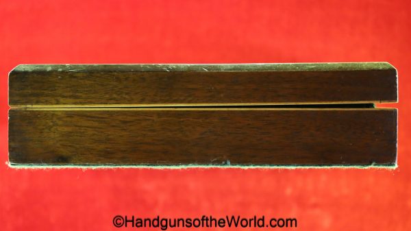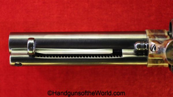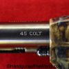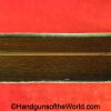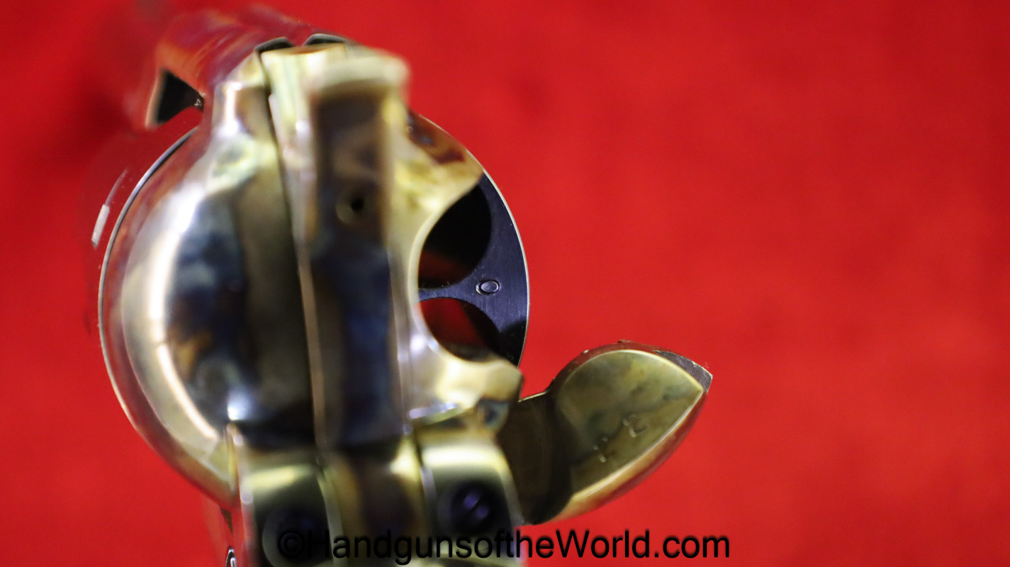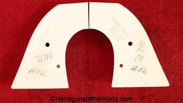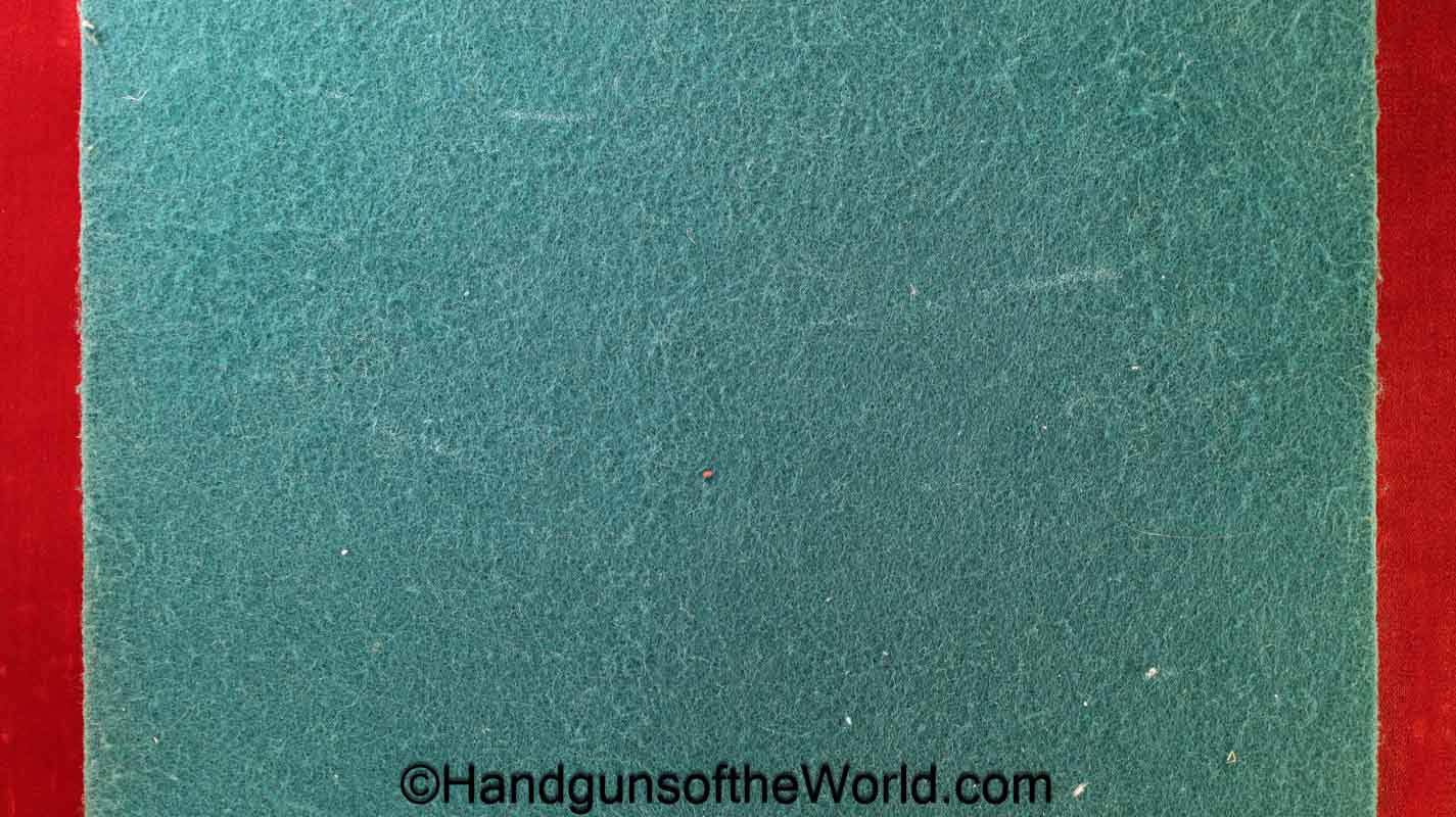 USFA Mfg. Co Single Action Army, .45 Colt. This has the 4 3/4″ barrel and updated smooth Micarta=Ivorylike grips. This has a case-hardened frame with the remainer a nice blue finish. This retains 99+% blue and the bore is Mint. A well-made custom Walnut case with green velvet lining is included, along with the original black plastic grips.