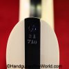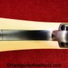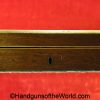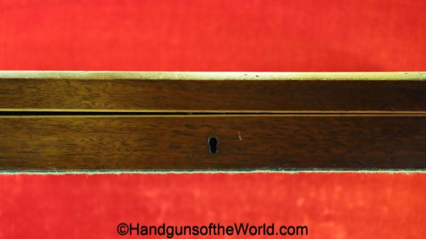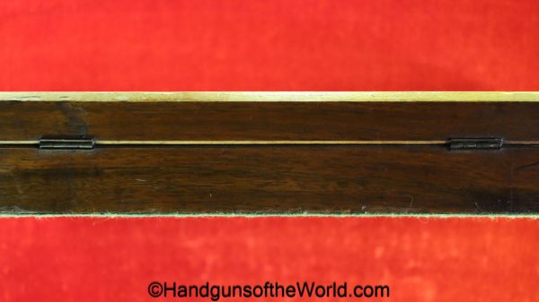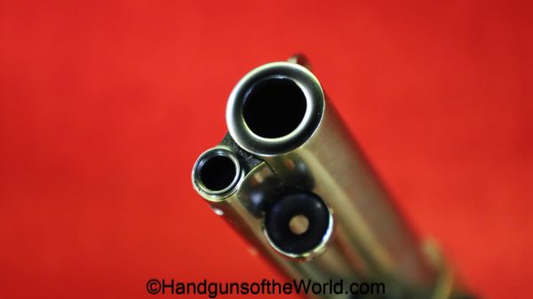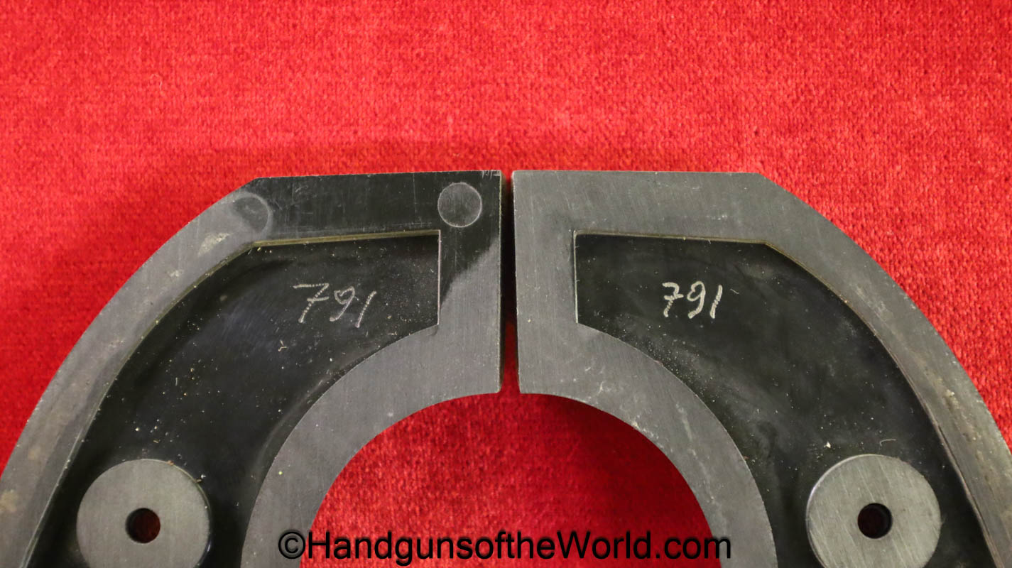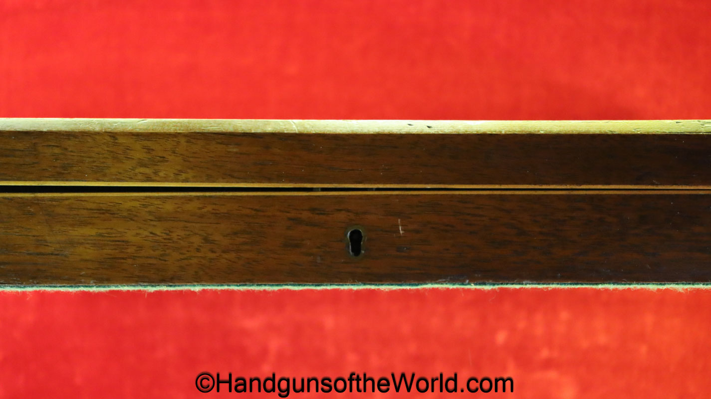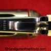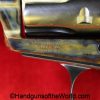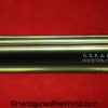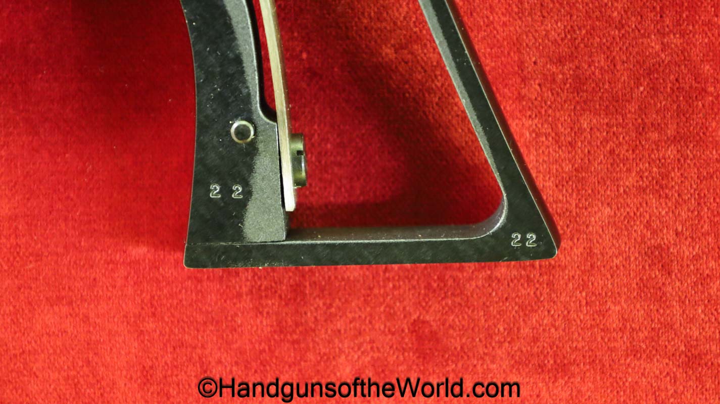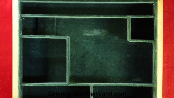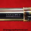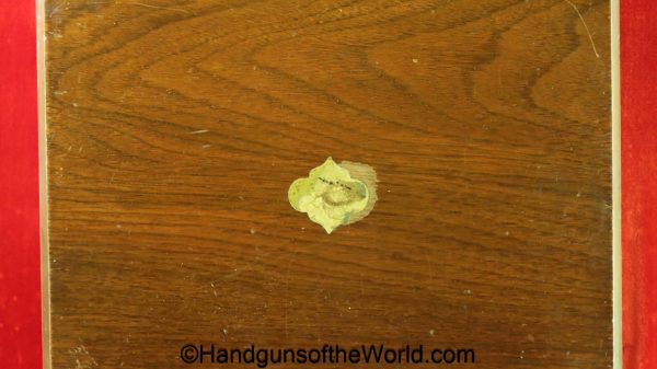 USFA Mfg. Co Single Action Army, .45 Colt. This has the 4 3/4″ barrel and updated smooth Micarta=Ivorylike grips. This has a case-hardened frame with the remainer a nice blue finish. This retains 99+% blue and the bore is Mint. A well-made custom Walnut case with green velvet lining is included, along with the original black plastic grips.
