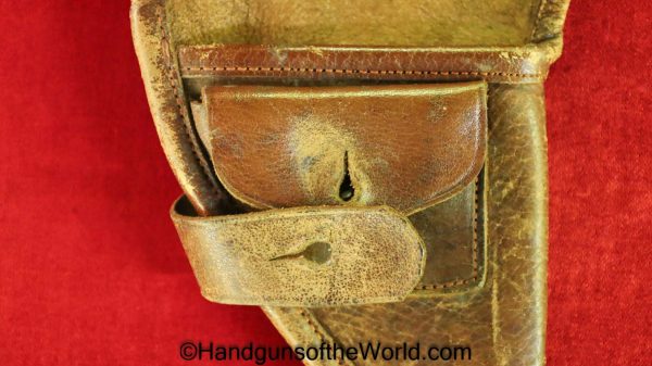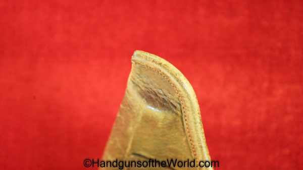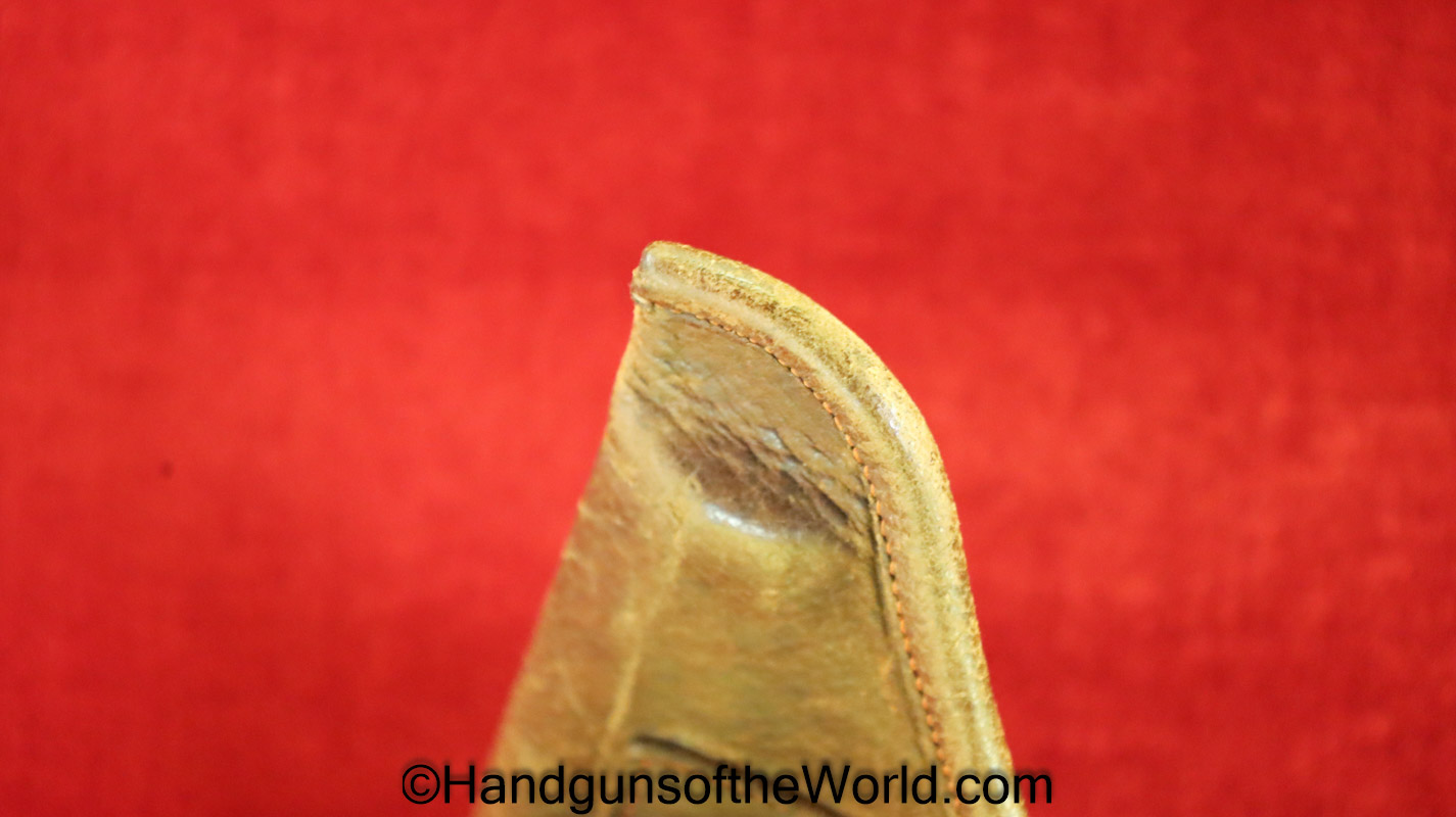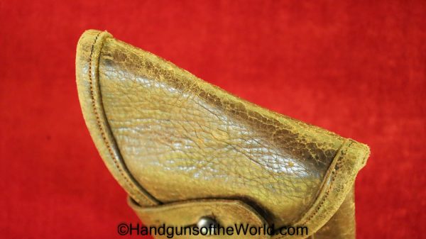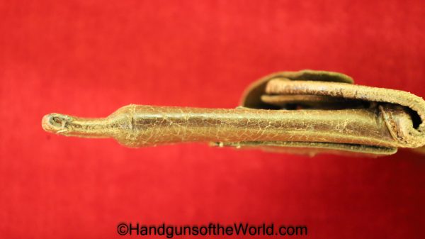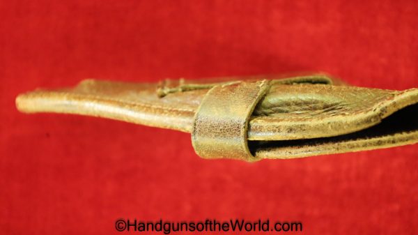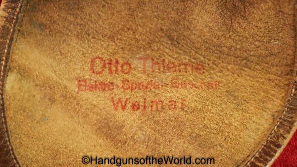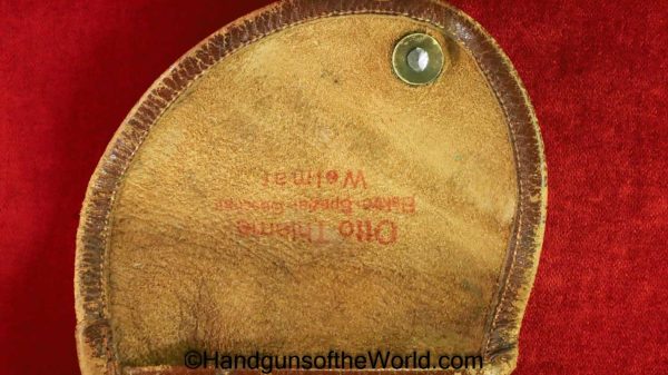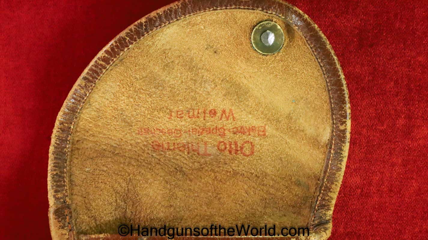 Period Velo Dog Revolver Holster. Brown leather with ammo pouch on the front. Red ink stamp retailer marked Otto Thieme Weimar inside. Measures about 7″ butt to barrel end, and 4″ across the top. Overall VG-VG+