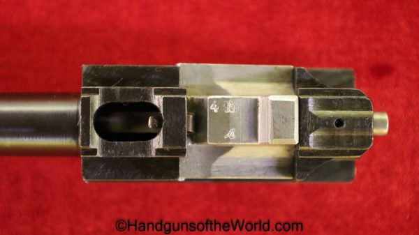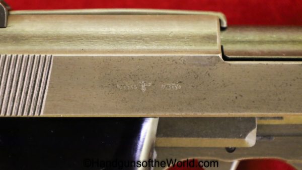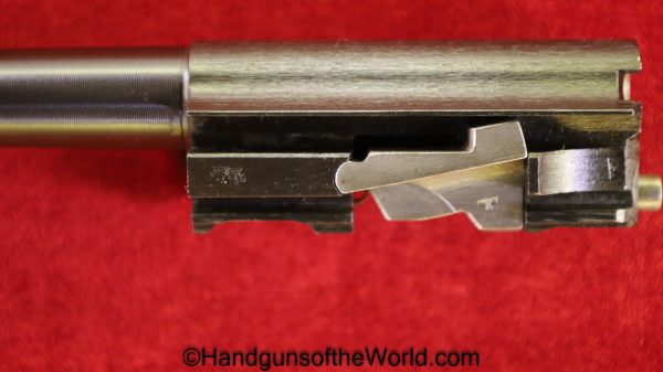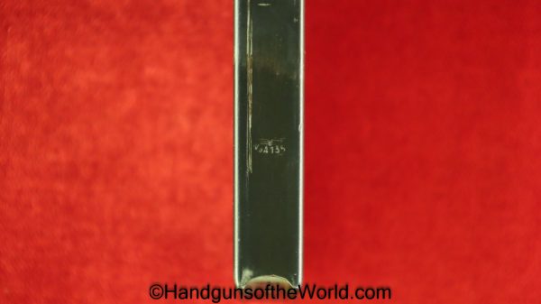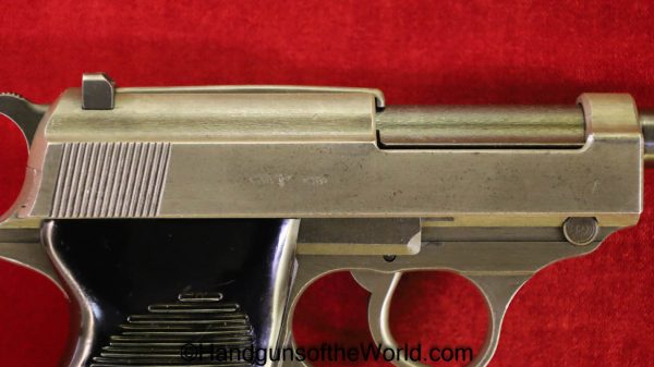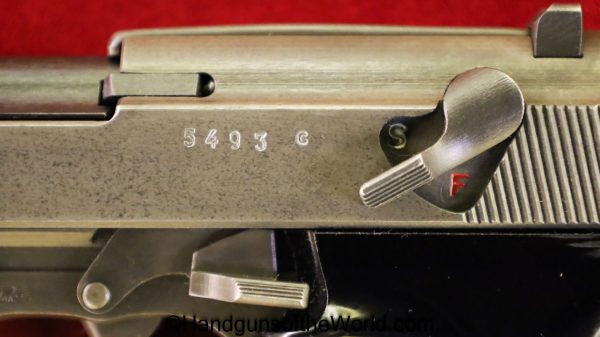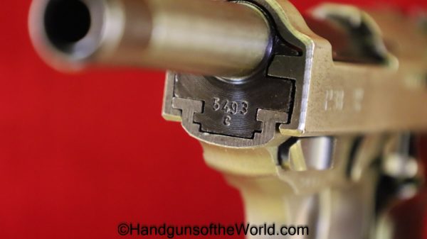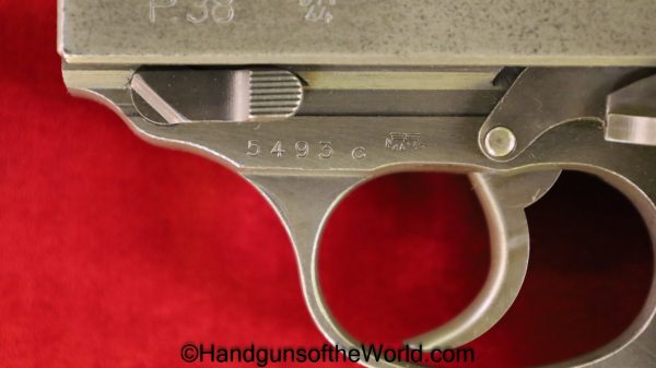 Mauser P-38, BYF 44, 9mm. This is German WWII Army WaA135 proofed on the major parts. This has the correct black plastic grips. This dual tone, phosphate frame and slide, with a blue barrel has all matching parts and no import markings. The finish rates very strong at 99+% and the bore is excellent. Fantastic.