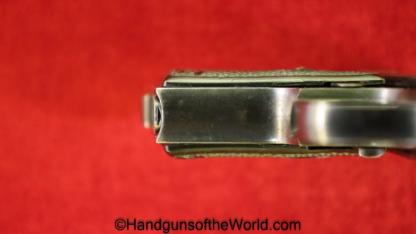 Walther Model 9, 6.35mm. This is a late type with black Bakelite grips with steel retainers. The blue rates about 98% and the bore is excellent. This comes with an original green cardboard box with the Walther banner removed from the top and no label. An original manual and a brush are included.