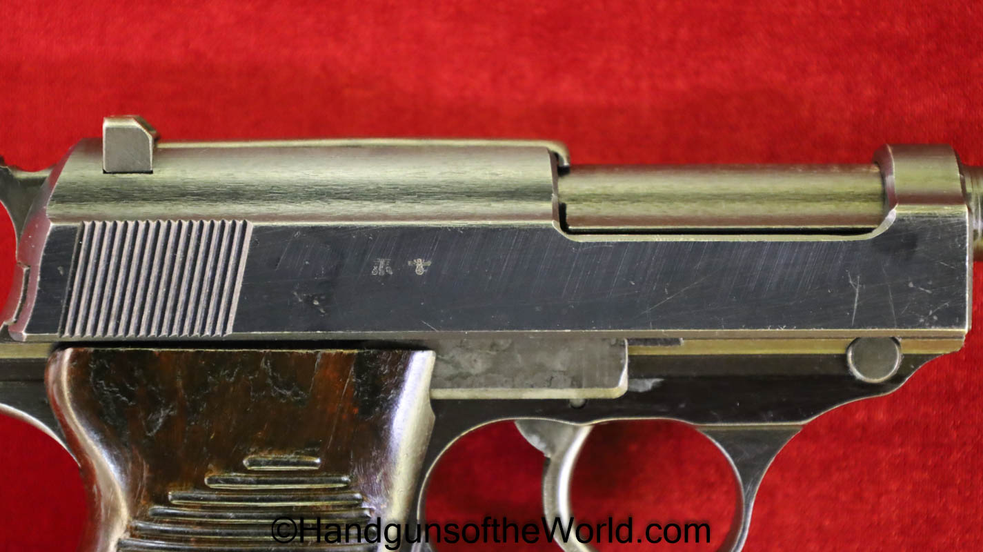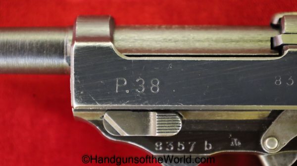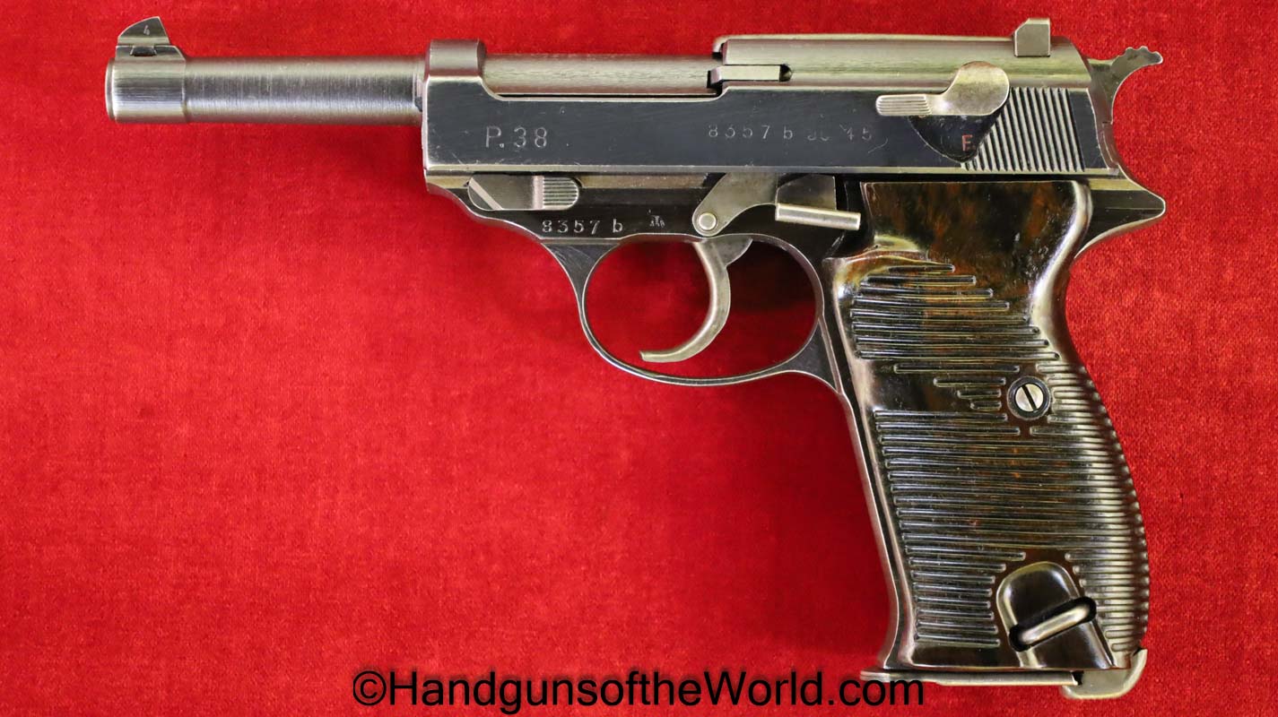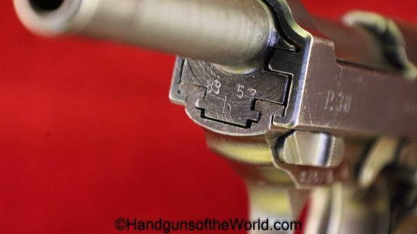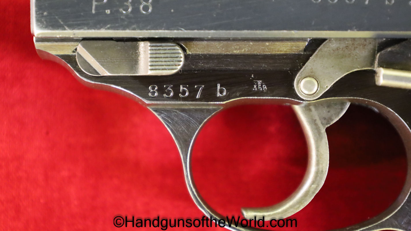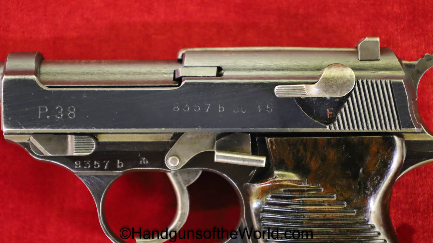 Walther P-38, AC45, 9mm. This late war pistol has a Single German eagle 359 proof on the right side of the slide next to the test proof. This is 1 of about 3500 built with an FNH=Czech WaA76 proofed barrel, and even rarer dark brown Durofol marked Bakelite grips. Most of the small parts are phosphate to include the grip screw. This has all matching numbers and no importer markings. This also has a cog hammer and the phosphate magazine is marked P-38V-U without an eagle 359 proof. The finish rates about 97% and the bore is VG+.