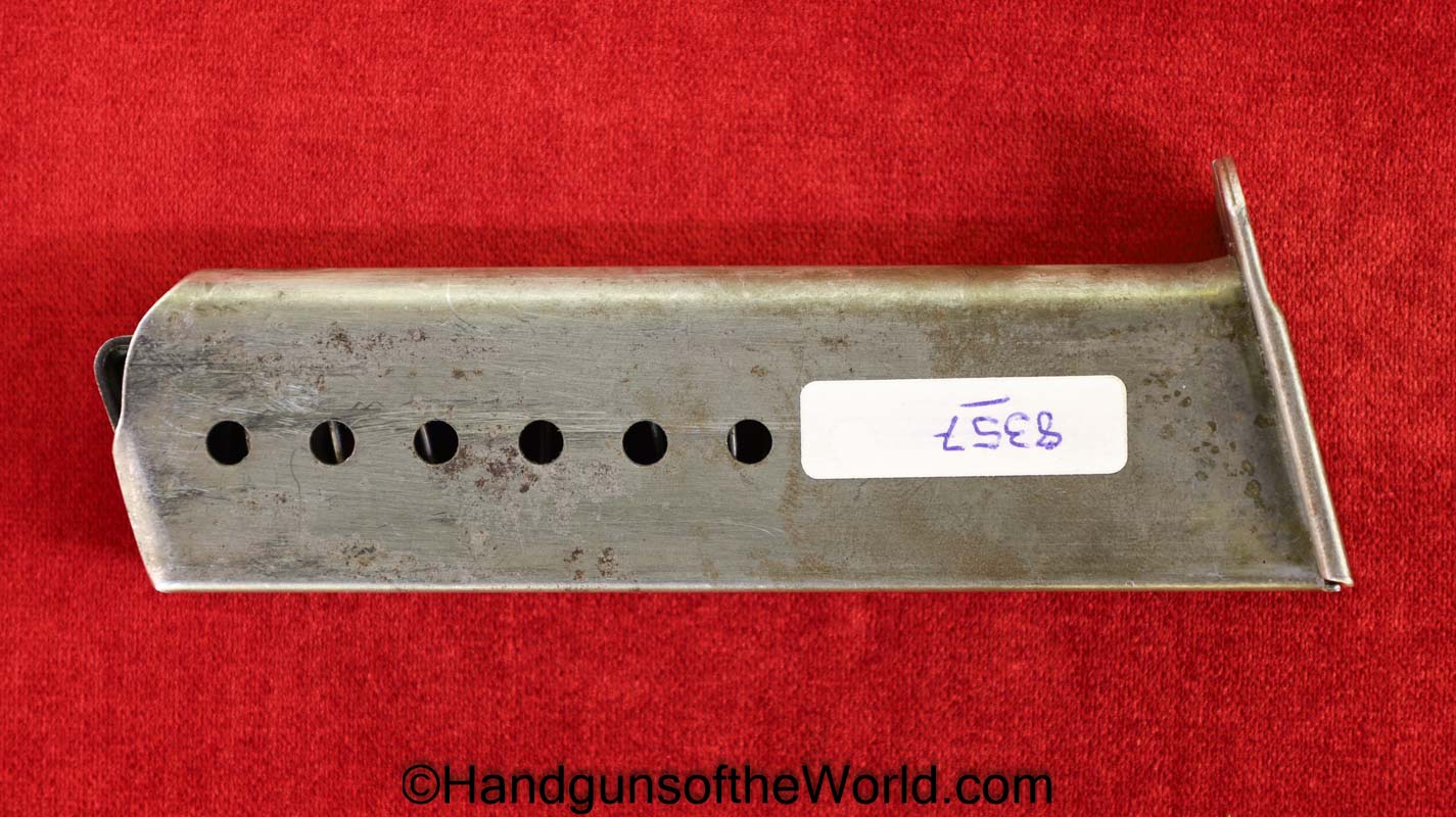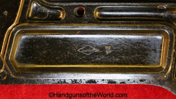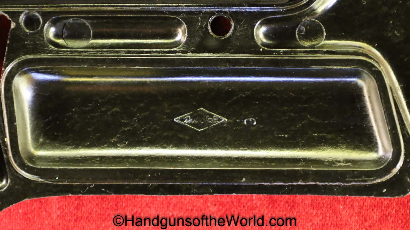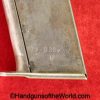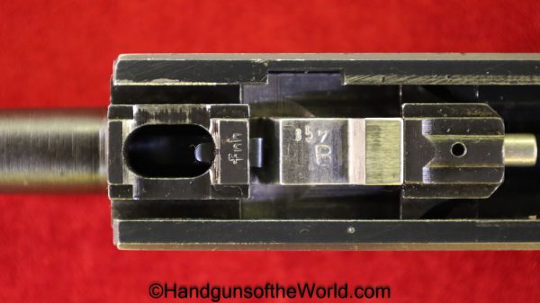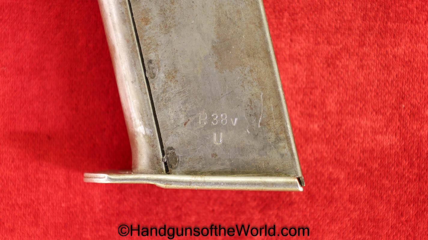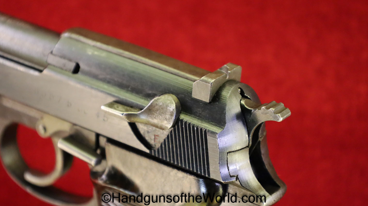 Walther P-38, AC45, 9mm. This late war pistol has a Single German eagle 359 proof on the right side of the slide next to the test proof. This is 1 of about 3500 built with an FNH=Czech WaA76 proofed barrel, and even rarer dark brown Durofol marked Bakelite grips. Most of the small parts are phosphate to include the grip screw. This has all matching numbers and no importer markings. This also has a cog hammer and the phosphate magazine is marked P-38V-U without an eagle 359 proof. The finish rates about 97% and the bore is VG+.
