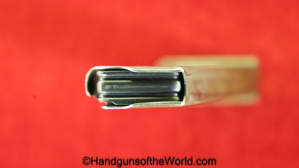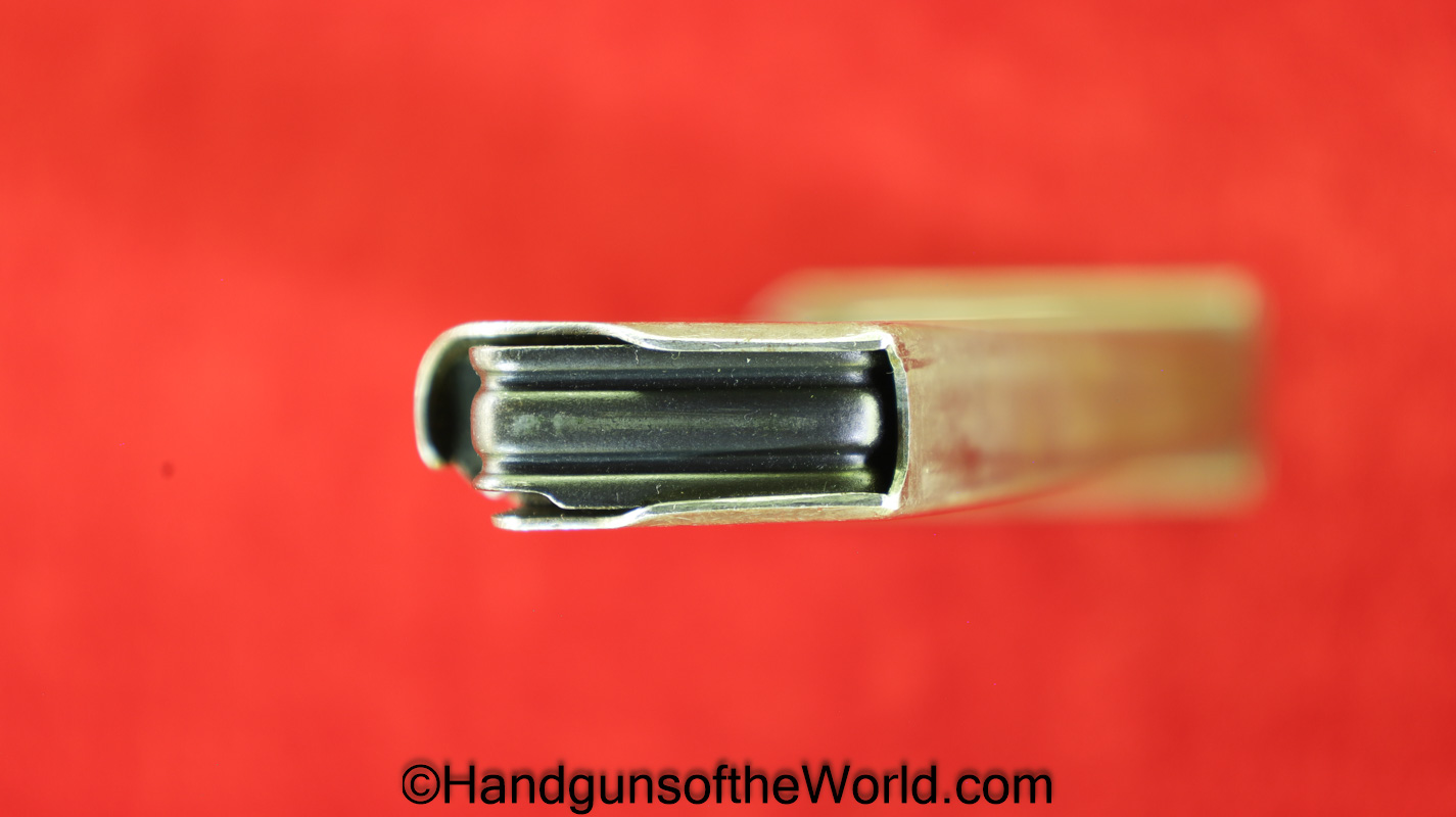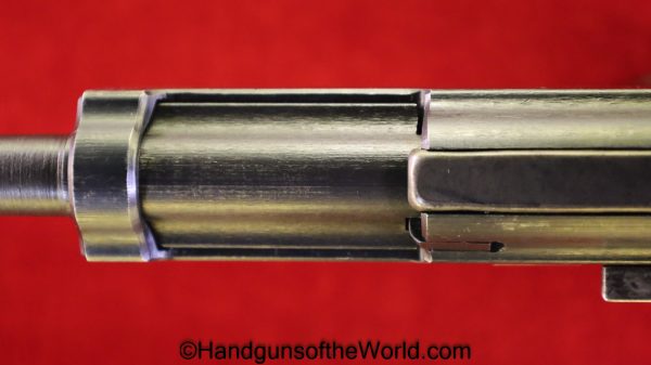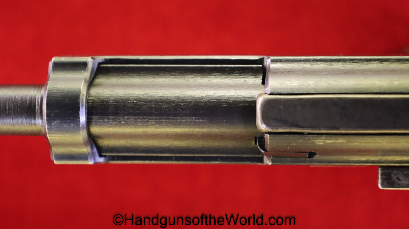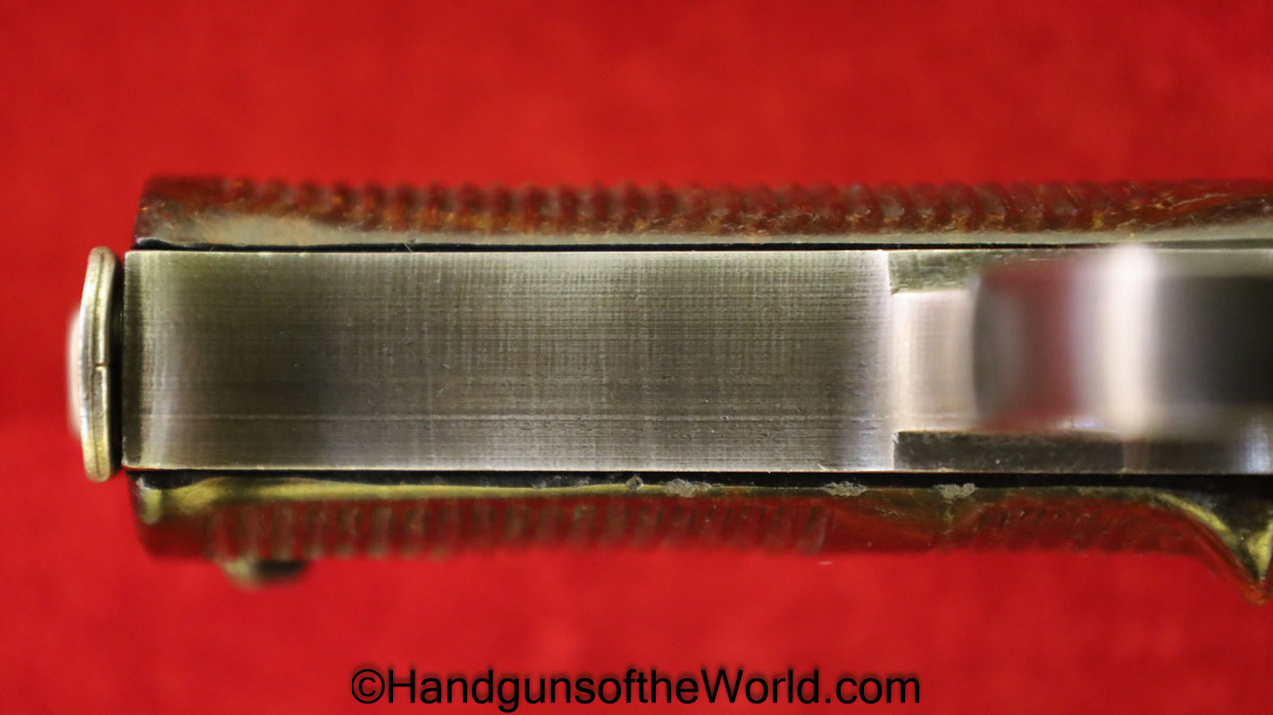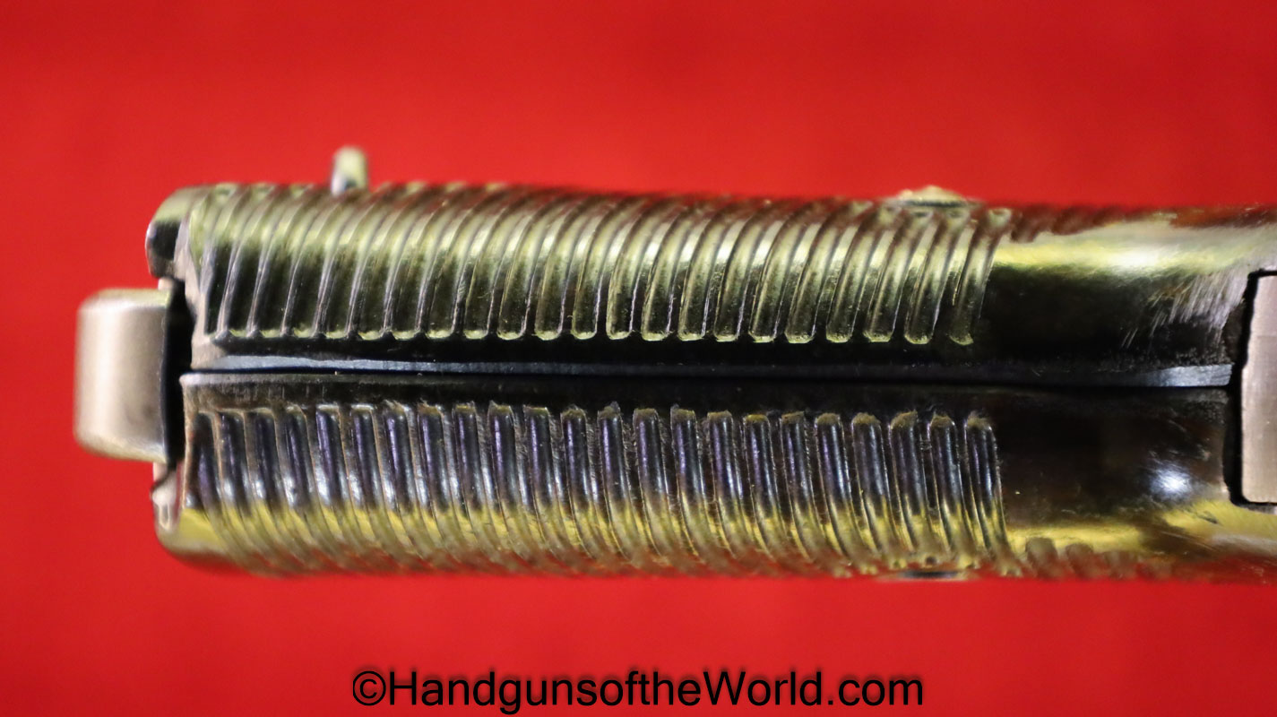 Walther P-38, AC45, 9mm. This late war pistol has a Single German eagle 359 proof on the right side of the slide next to the test proof. This is 1 of about 3500 built with an FNH=Czech WaA76 proofed barrel, and even rarer dark brown Durofol marked Bakelite grips. Most of the small parts are phosphate to include the grip screw. This has all matching numbers and no importer markings. This also has a cog hammer and the phosphate magazine is marked P-38V-U without an eagle 359 proof. The finish rates about 97% and the bore is VG+.