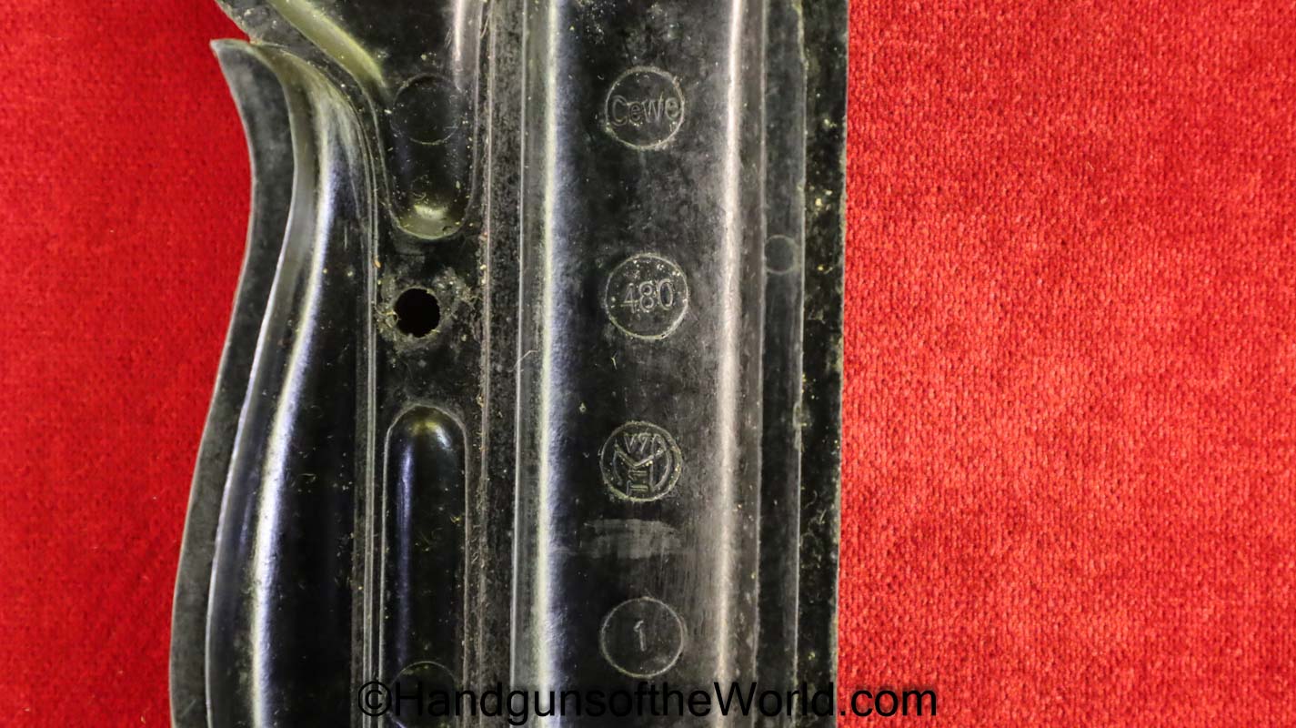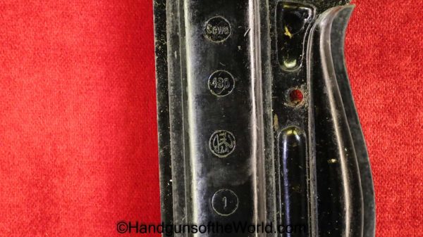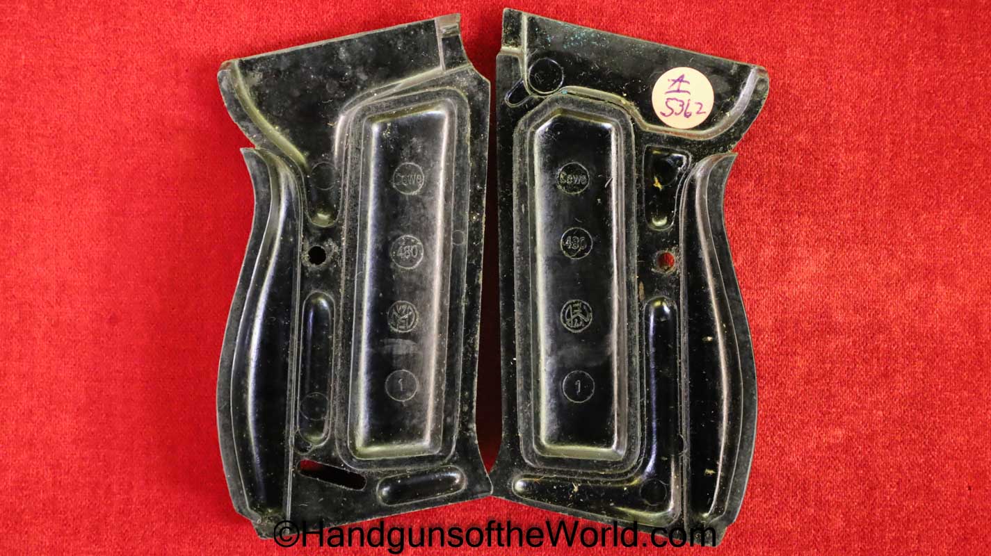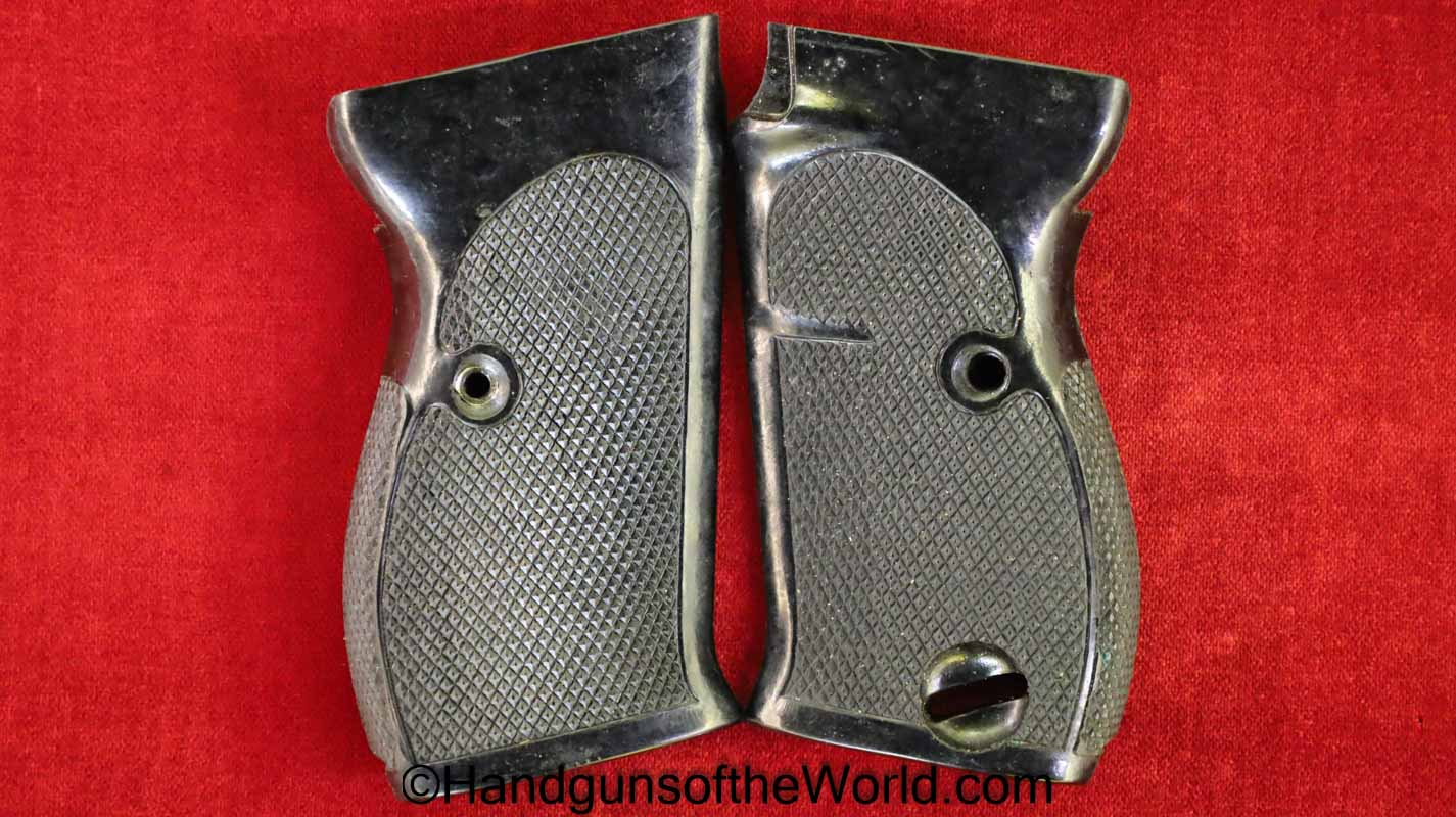 Original Walther P-38 Pistol Grips. Black checkered Bakelite with the round lanyard loop cut out. The German proofed have been scratched out. Otherwise, VG+.