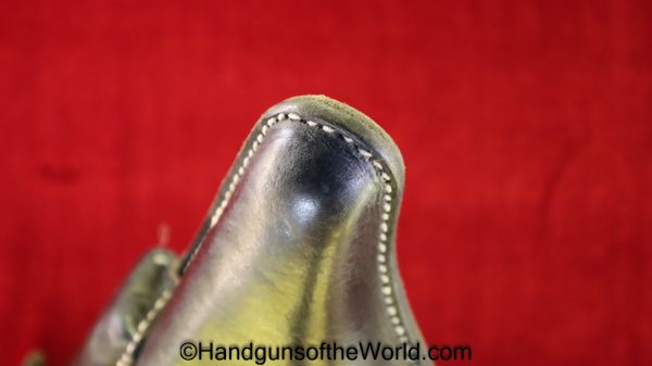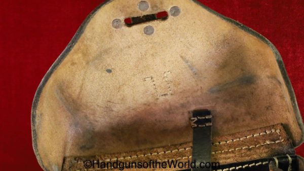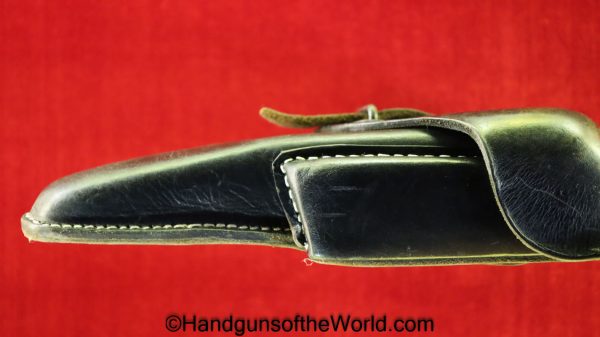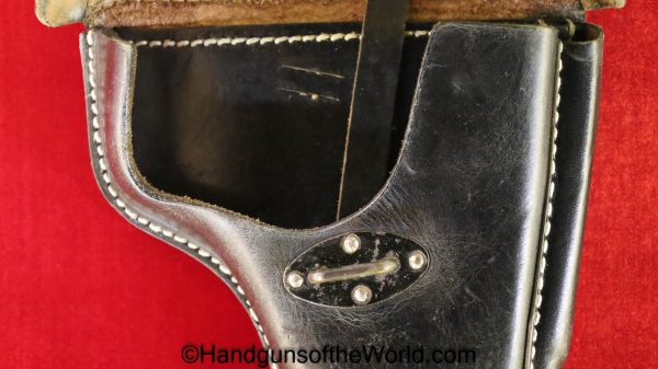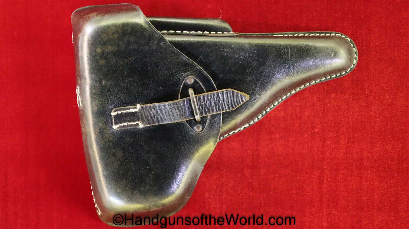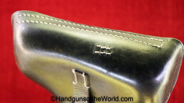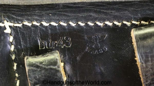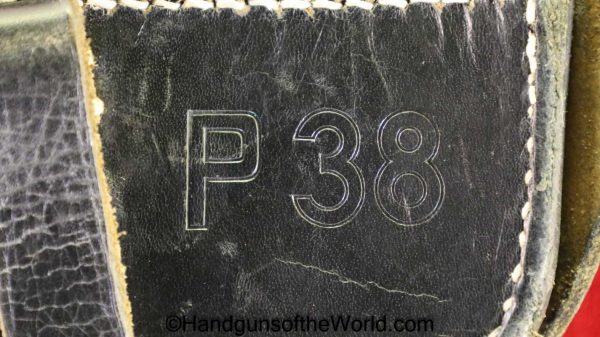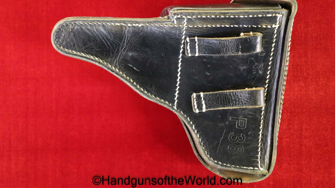Original Walther P-38 Pistol Holster. Black leather hard shell, maker marked bdr 43, WaA86, P.38 on the back. Overall VG+-Excellent.